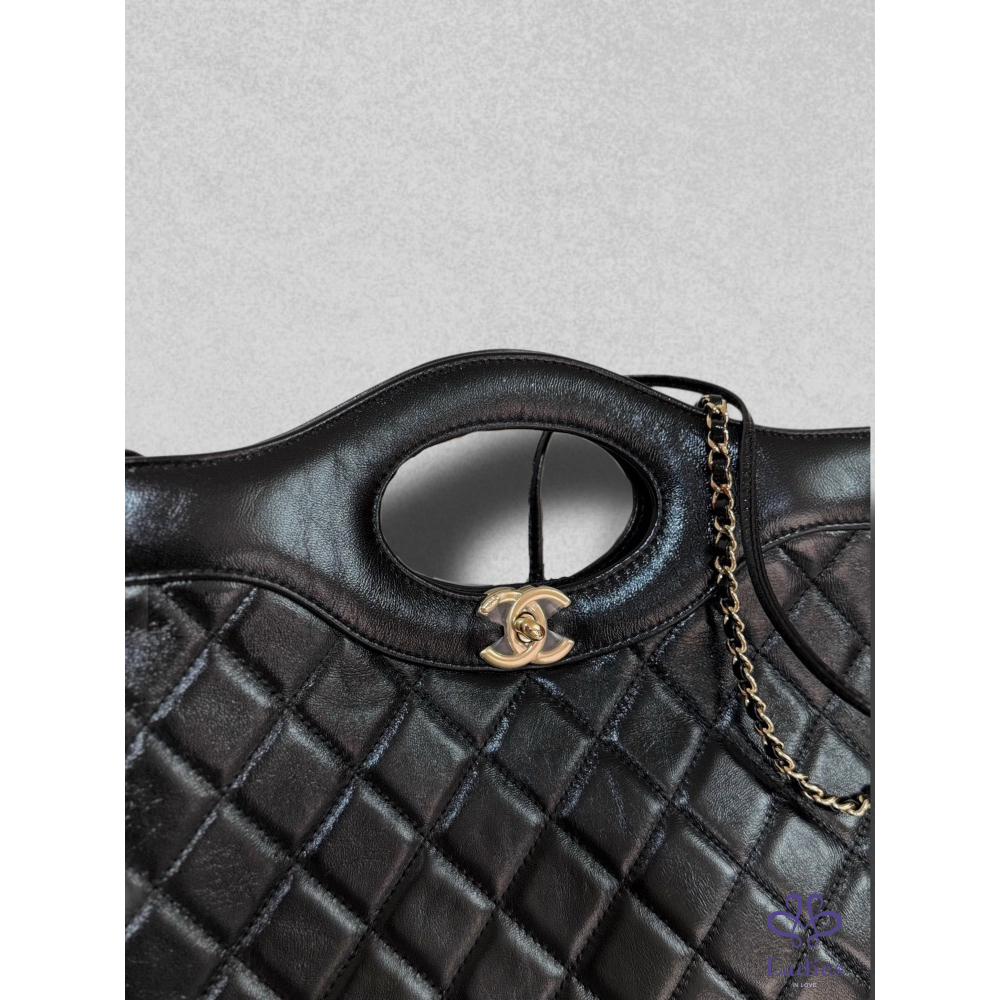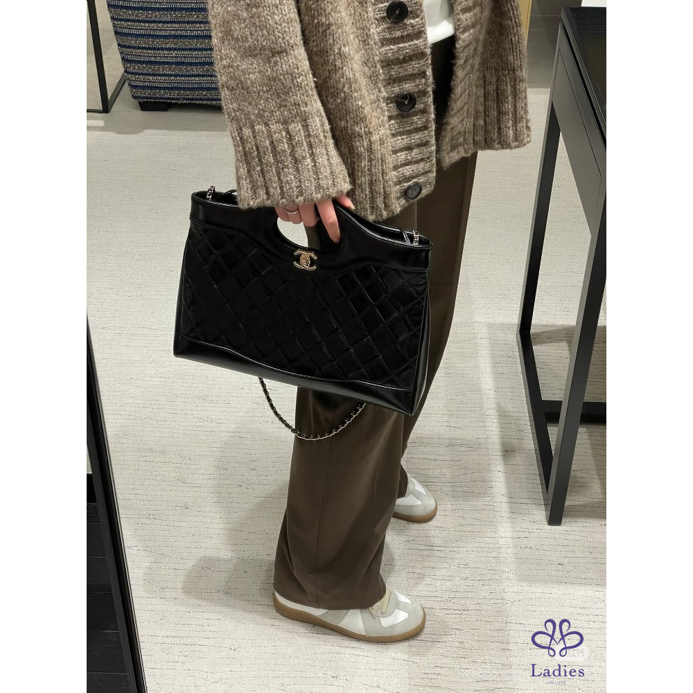 這款 Chanel 31 Bag 中號 採用柔軟光澤的 油蠟羊皮 製成,手感細膩、光澤度極高,菱格紋在光線下閃出迷人立體感。