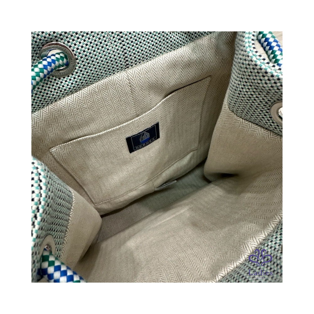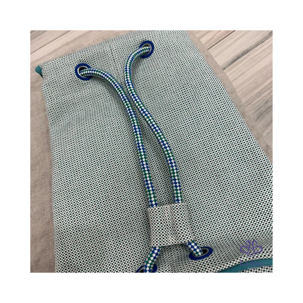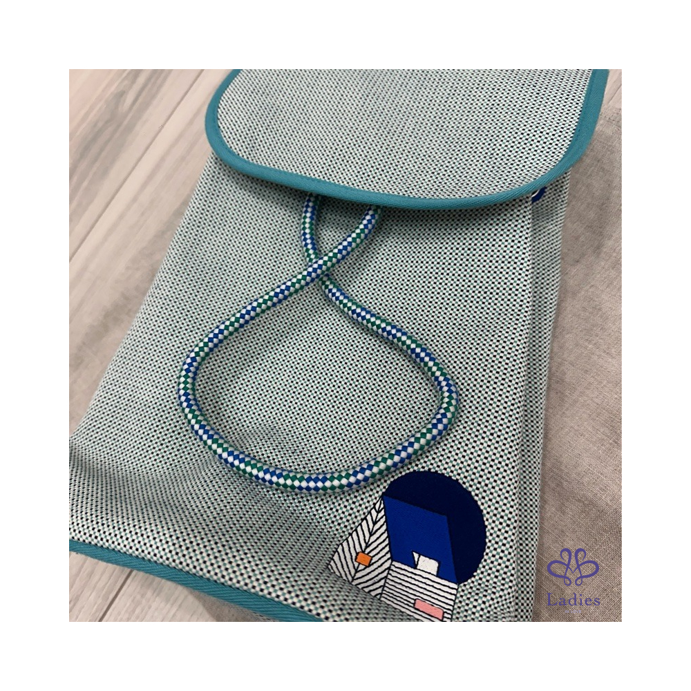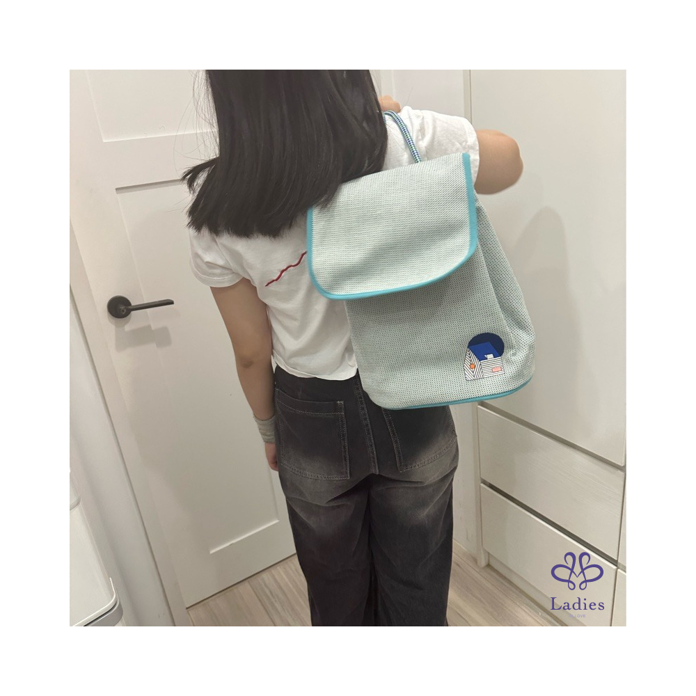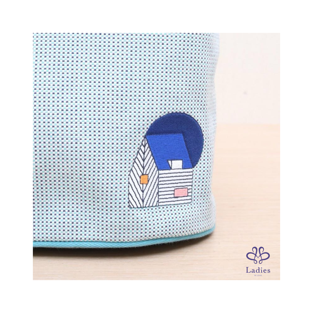 材質: 帆布搭配皮革包邊,耐用輕巧/ 採用彩色編織繩作為背帶,簡單俐落/ 右下角有幾何風格的屋舍圖案,富有童趣與藝術感