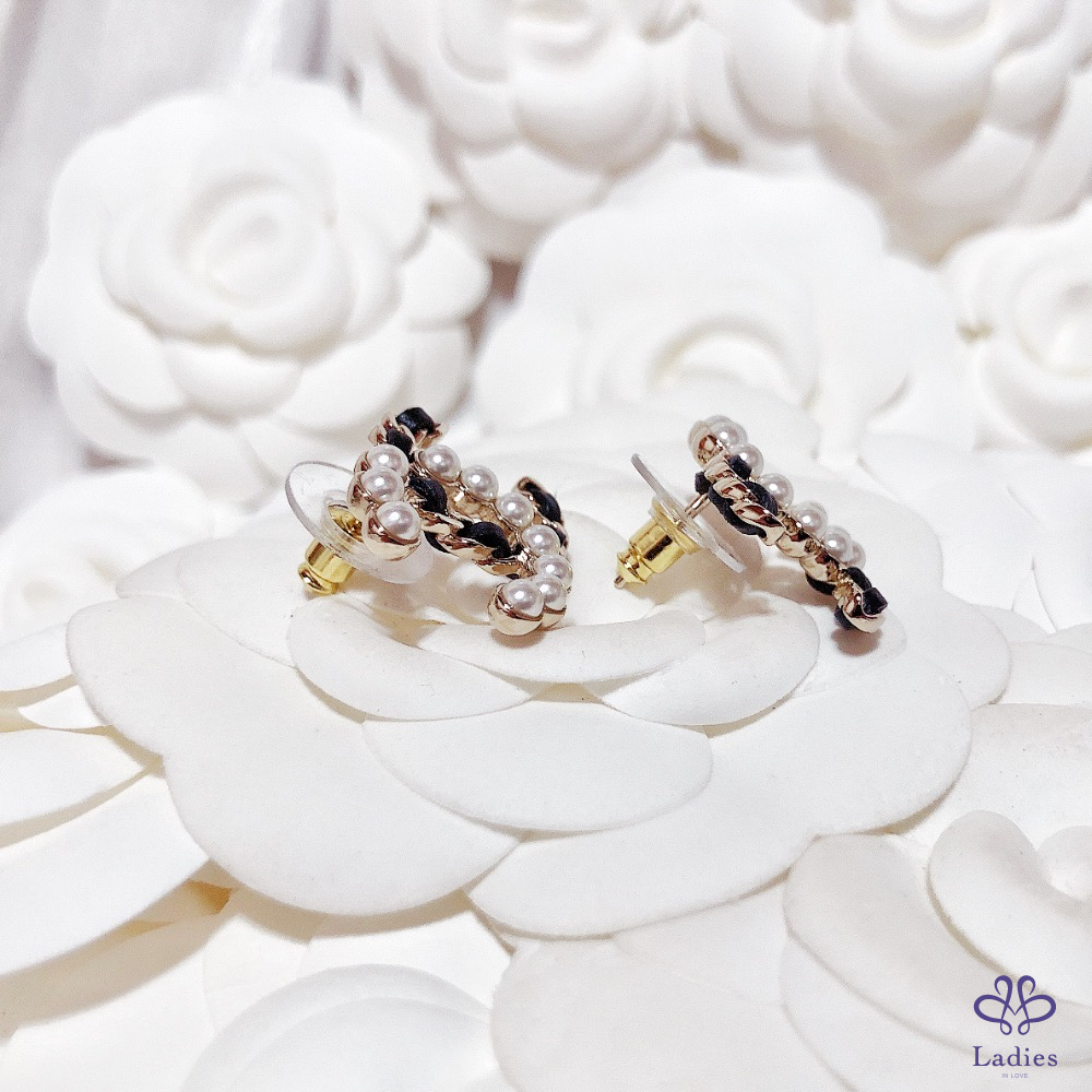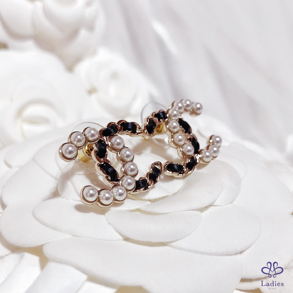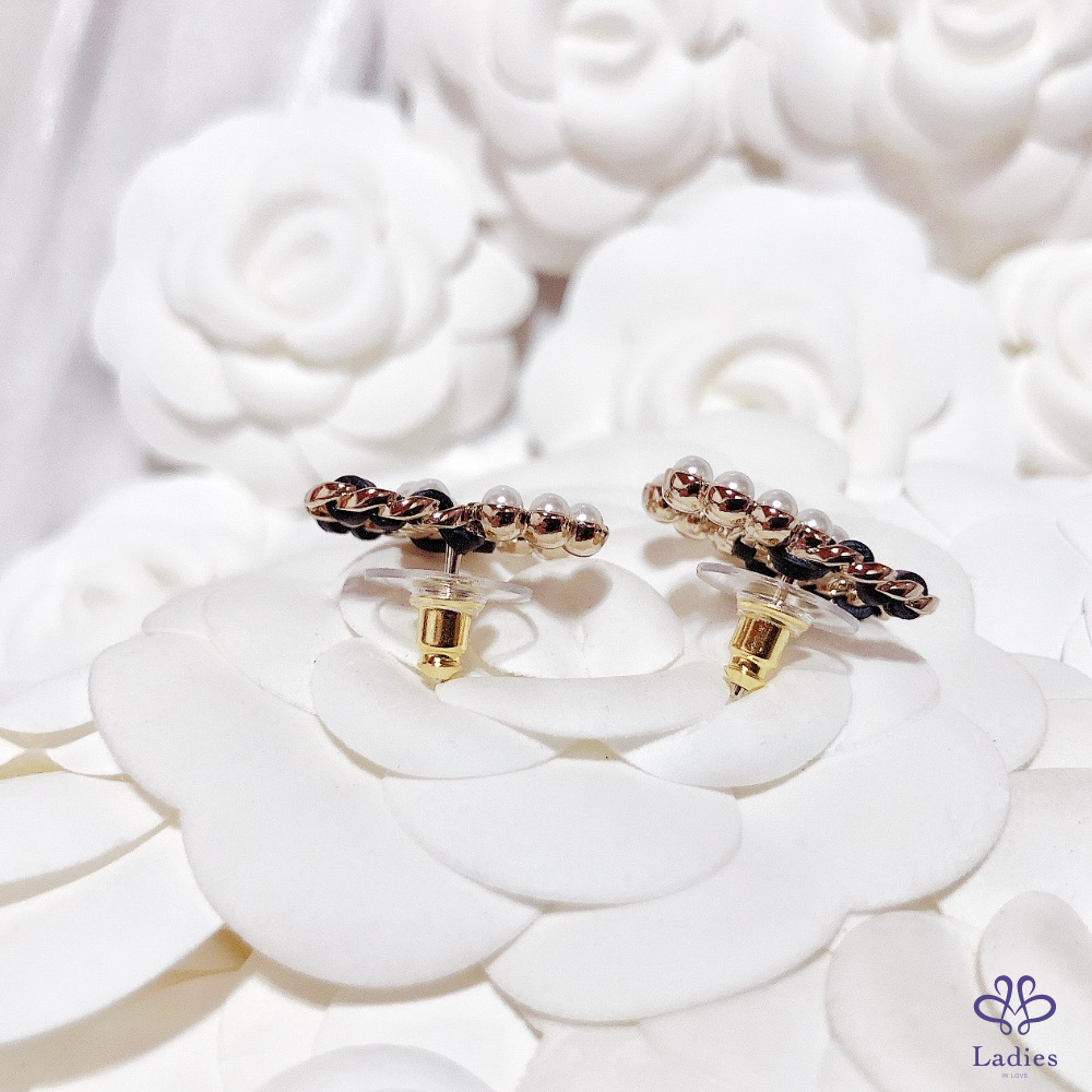 首頁 精品配件 CHANEL 25K 雙C logo 黑色皮穿鍊配珍珠 金色 針式 耳環 全新✨