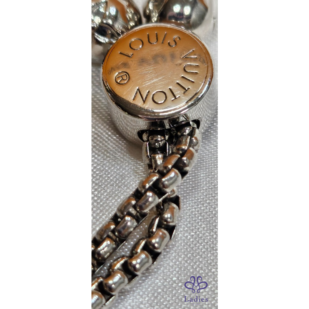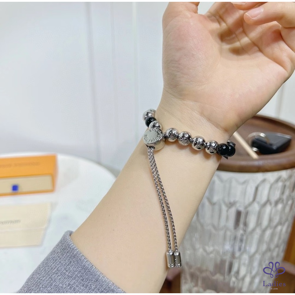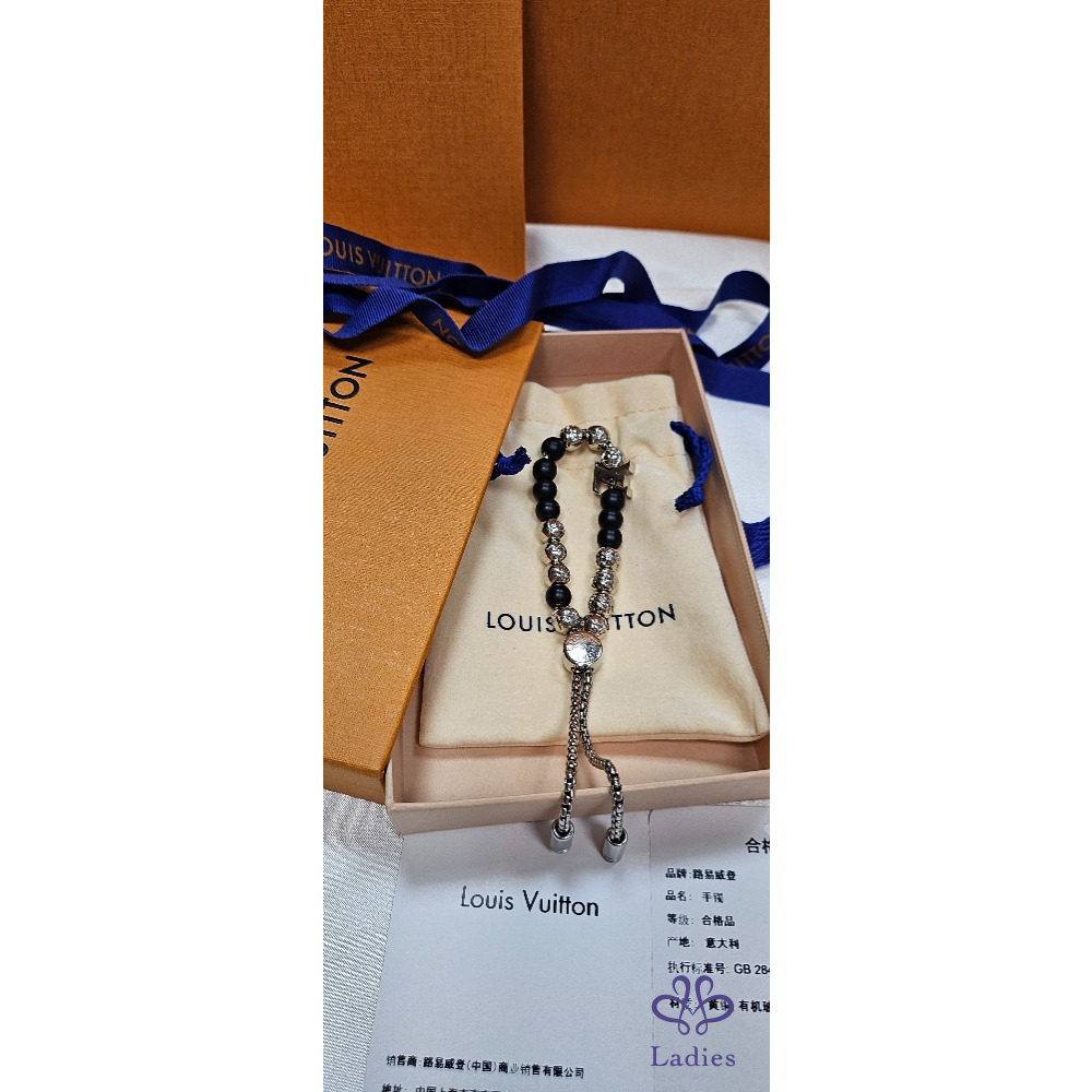 手鏈的按鈕開合及兩端均飾有經典LV標誌,配可調整鬆緊的手鏈珠鏈