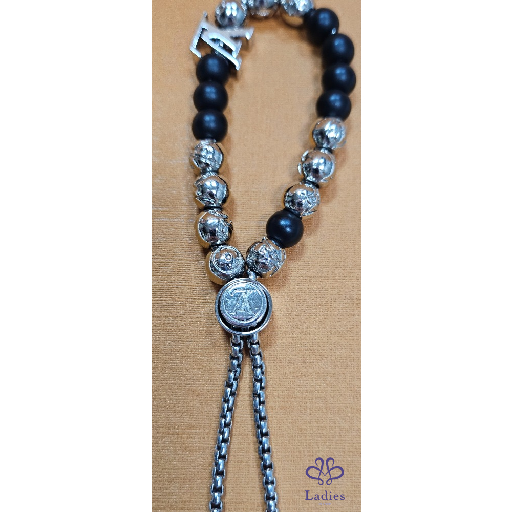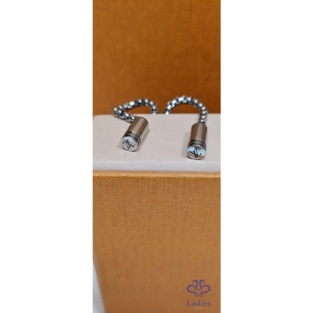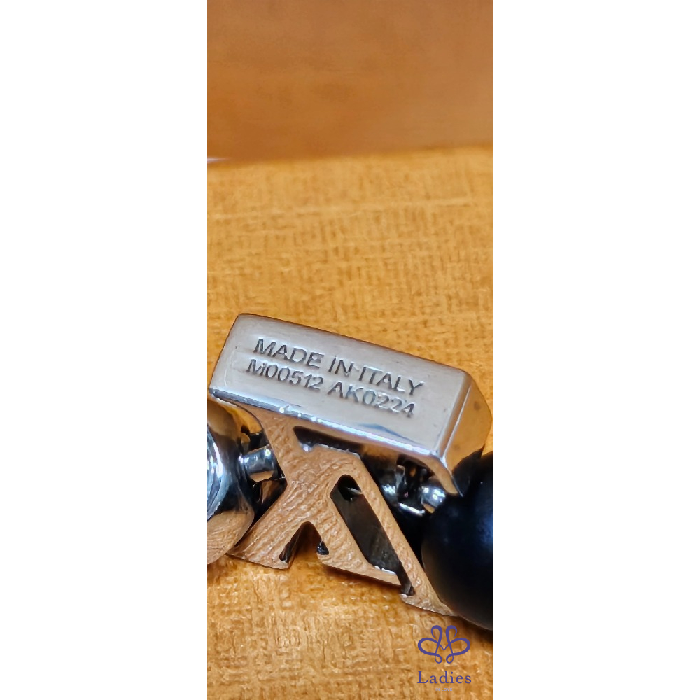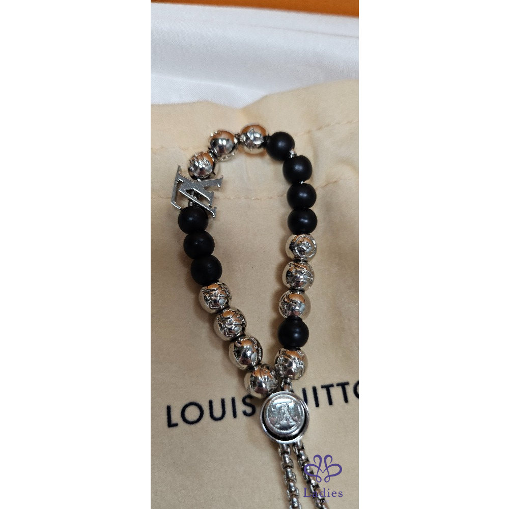手鏈的按鈕開合及兩端均飾有經典LV標誌,配可調整鬆緊的手鏈珠鏈