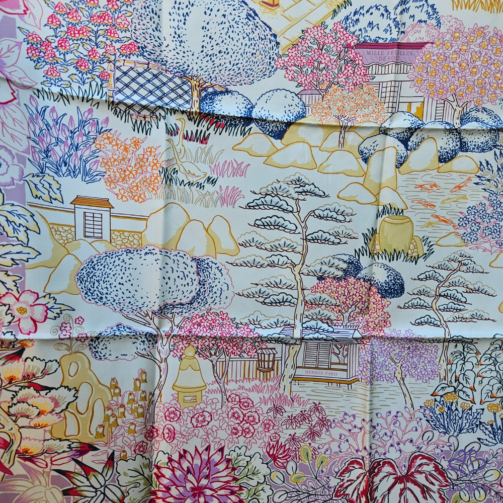 這款絲巾畫版是日本藝術家日高夏野(Natsuno Hidaka)讓一座微型的日式庭園躍然絲綢上
