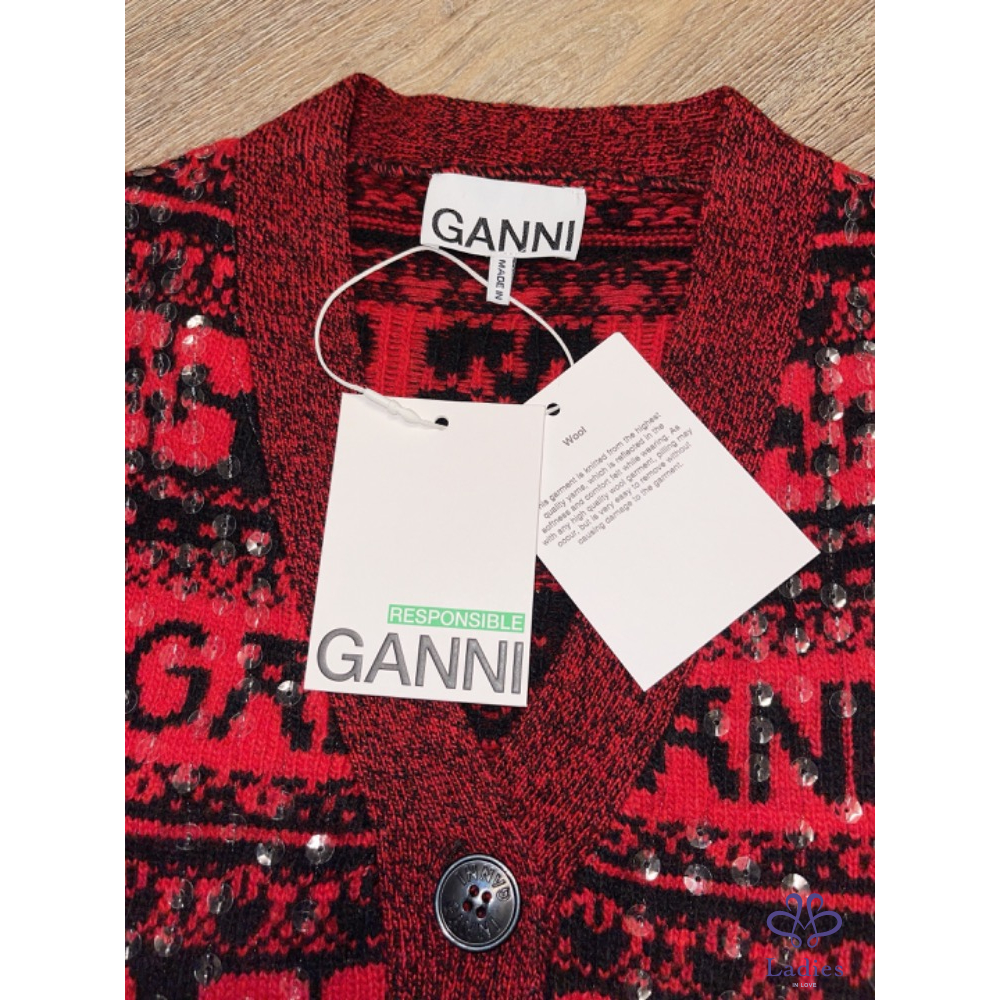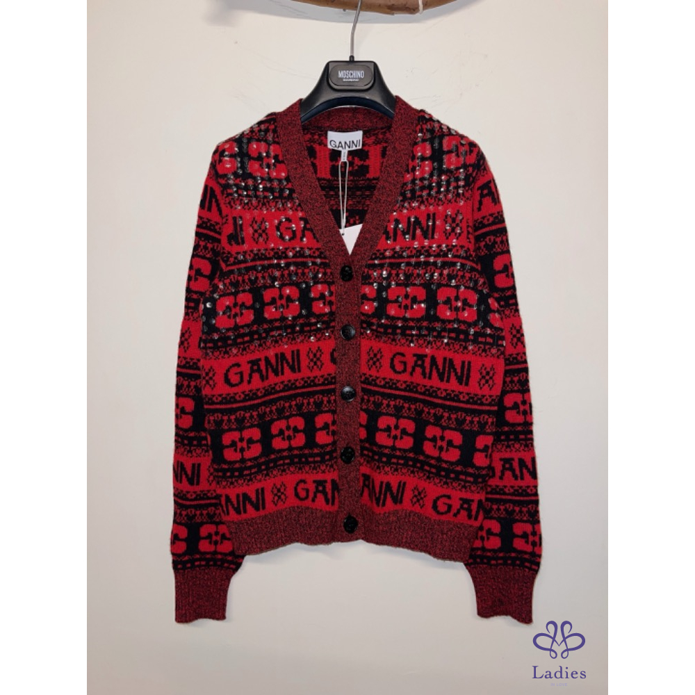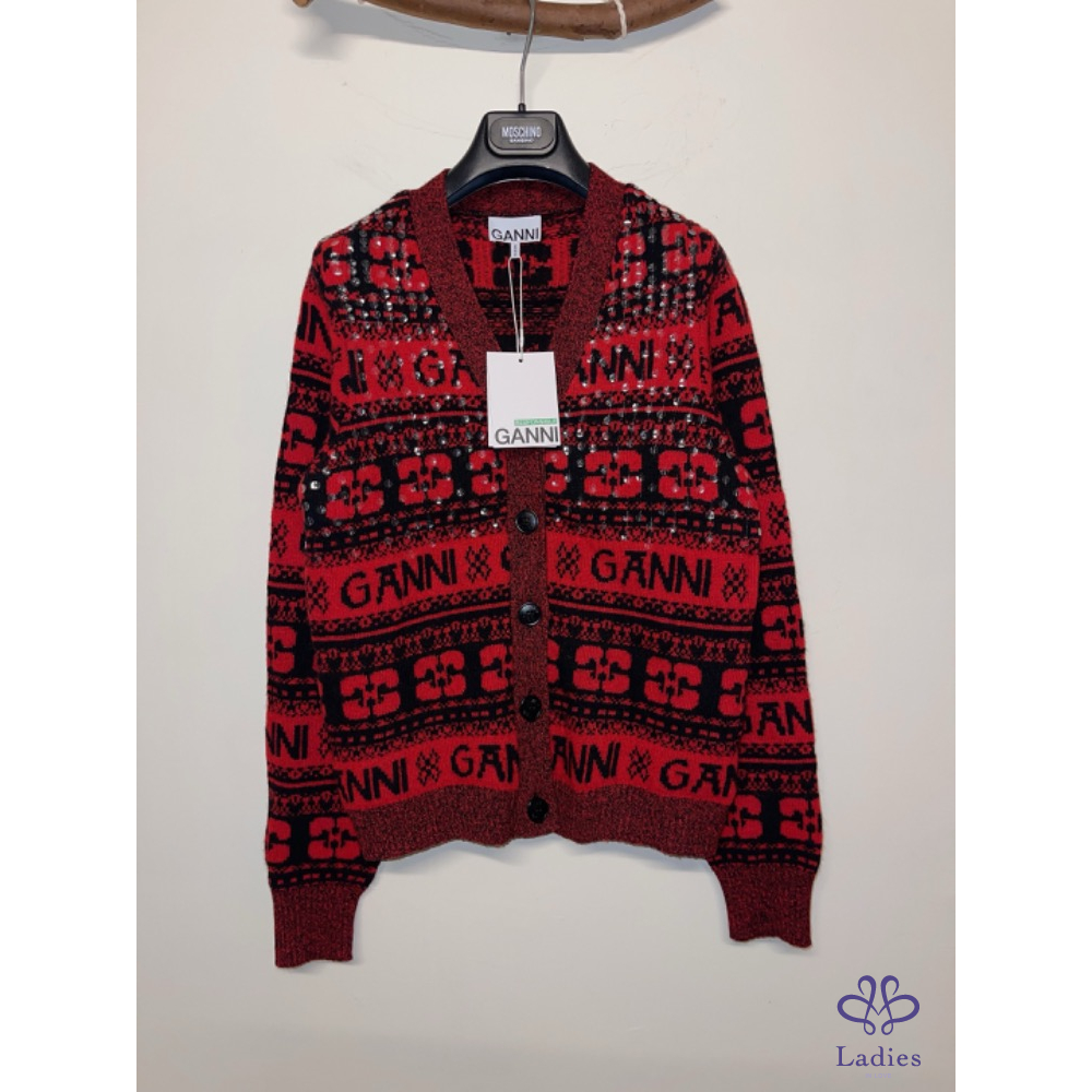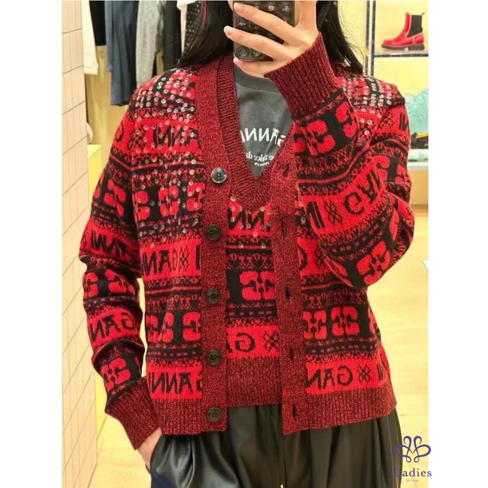 全新GANNI黑+紅滿版Logo緹花亮片羊毛針織外套
