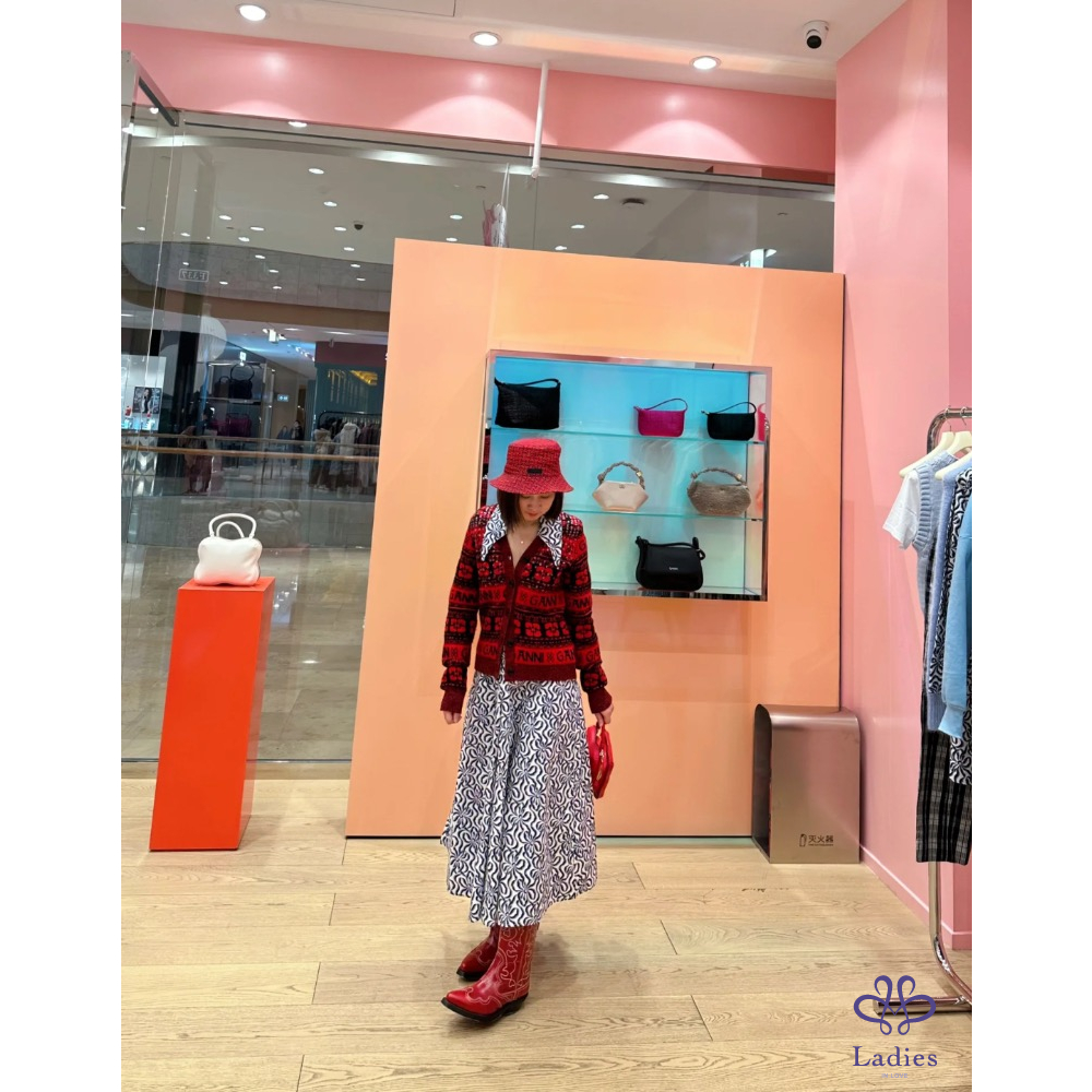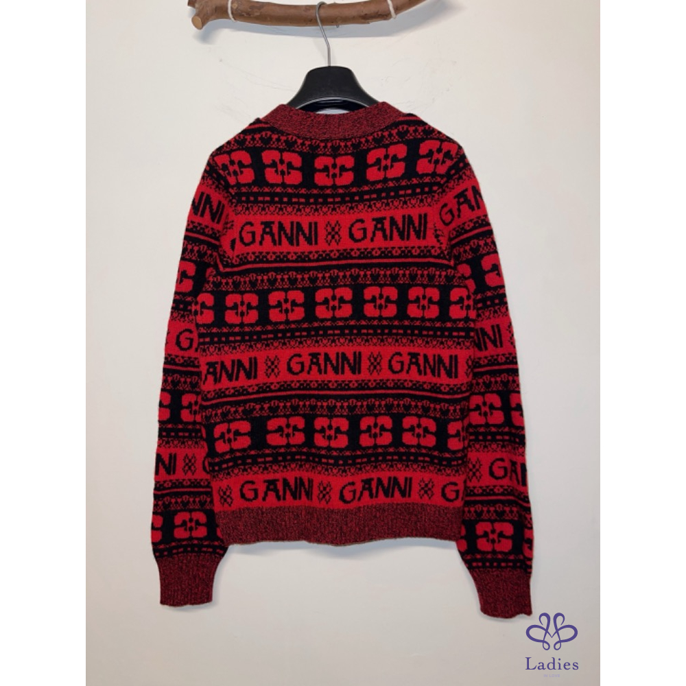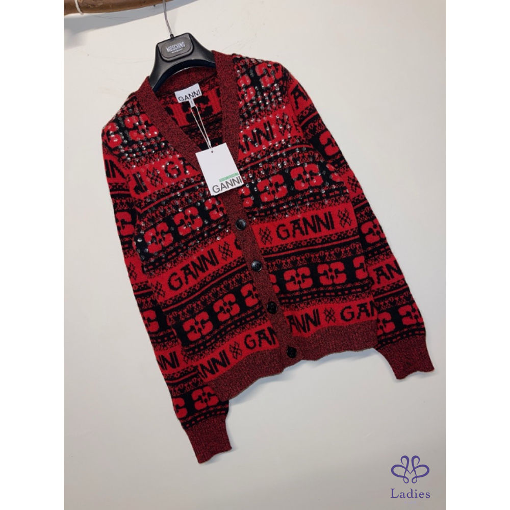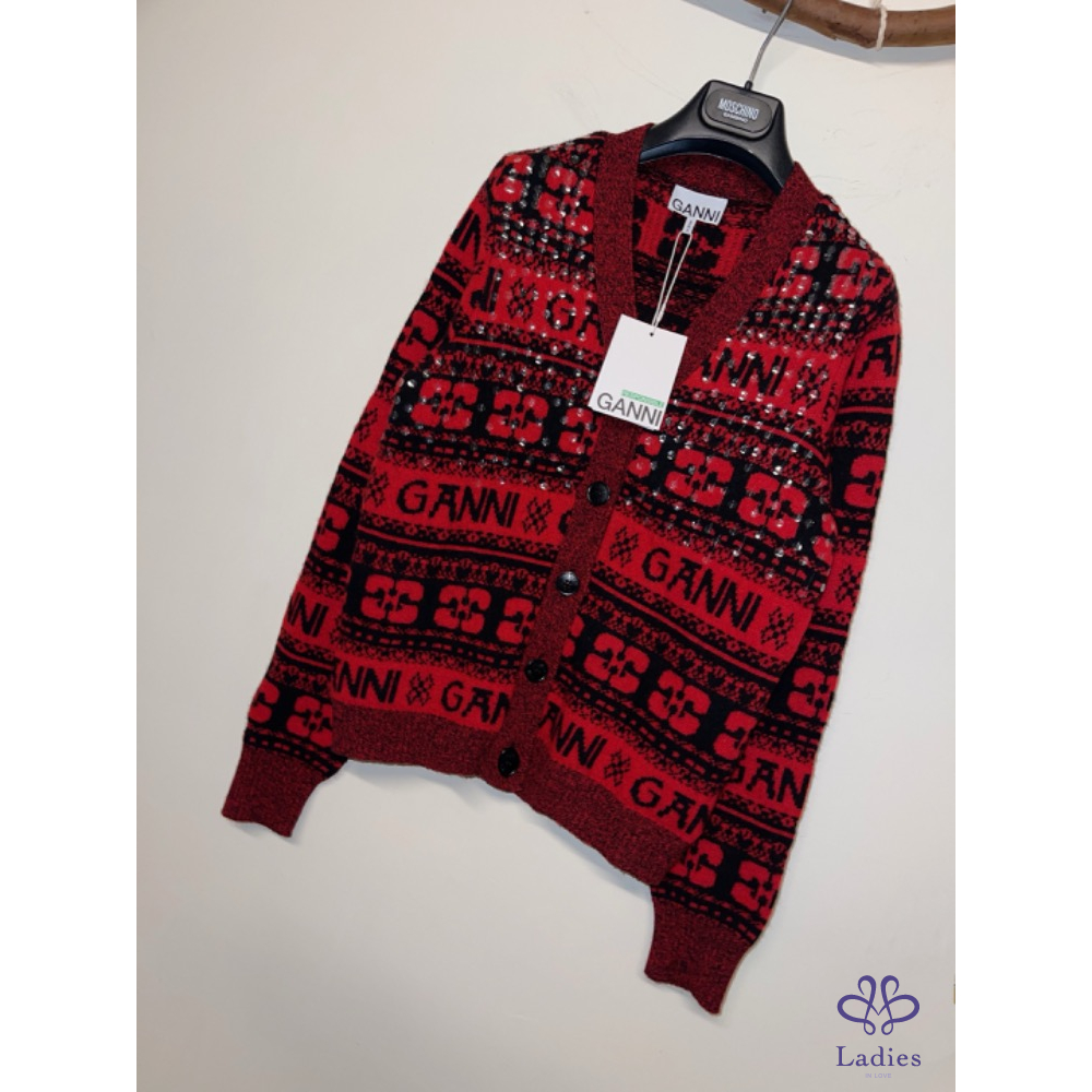 首頁 精品服飾 全新GANNI黑+紅滿版Logo緹花亮片羊毛針織外套