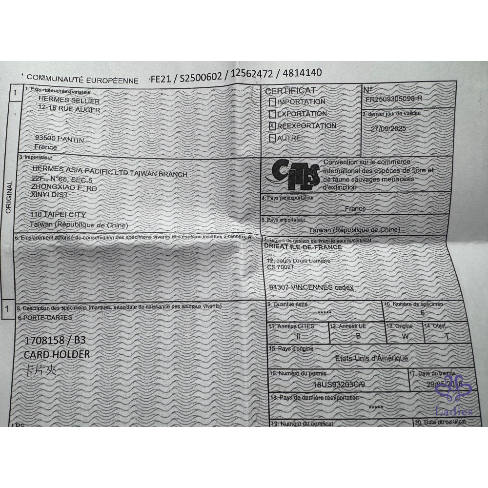 附件:盒、緞帶、紙袋、鱷魚皮證、臺灣購證影本(去個資