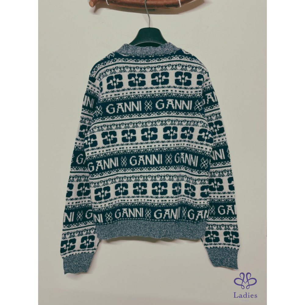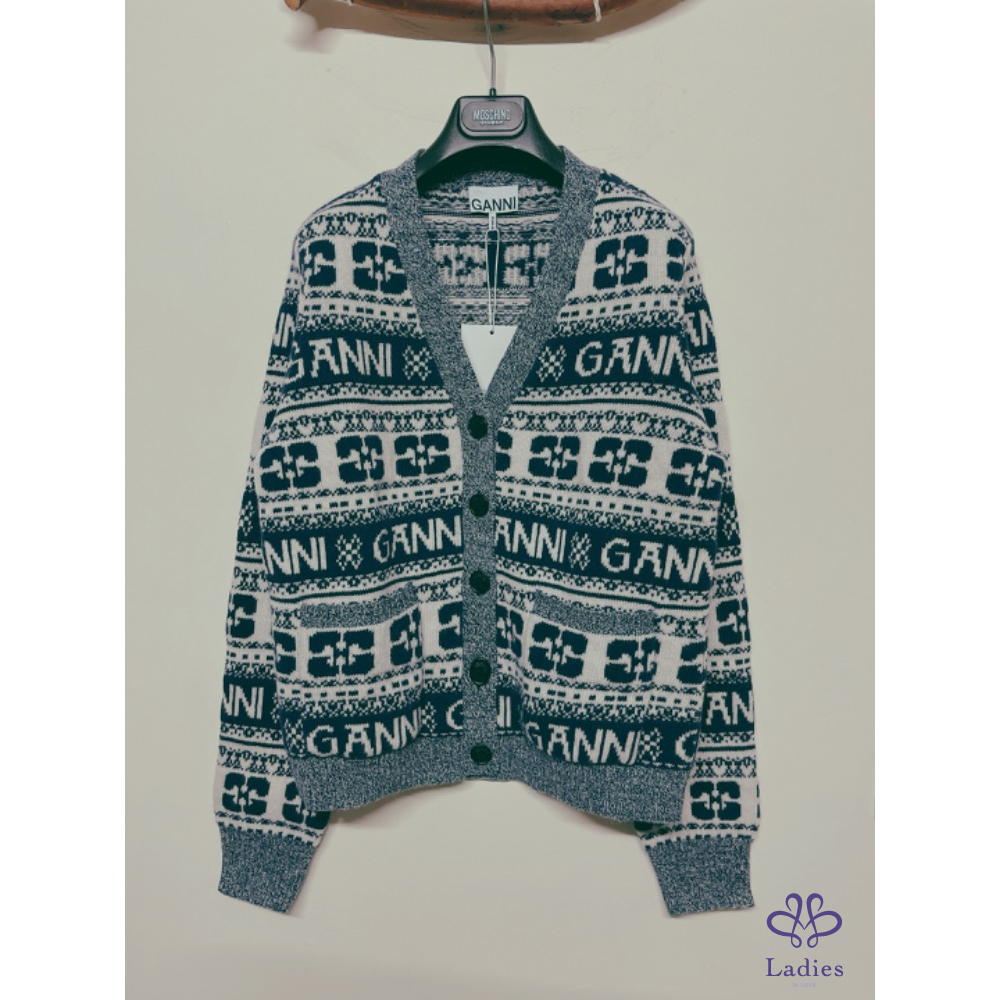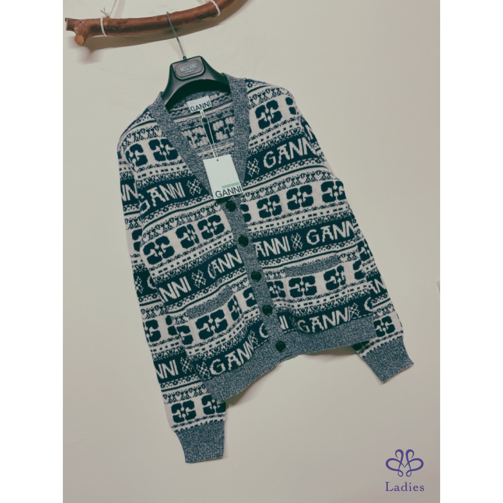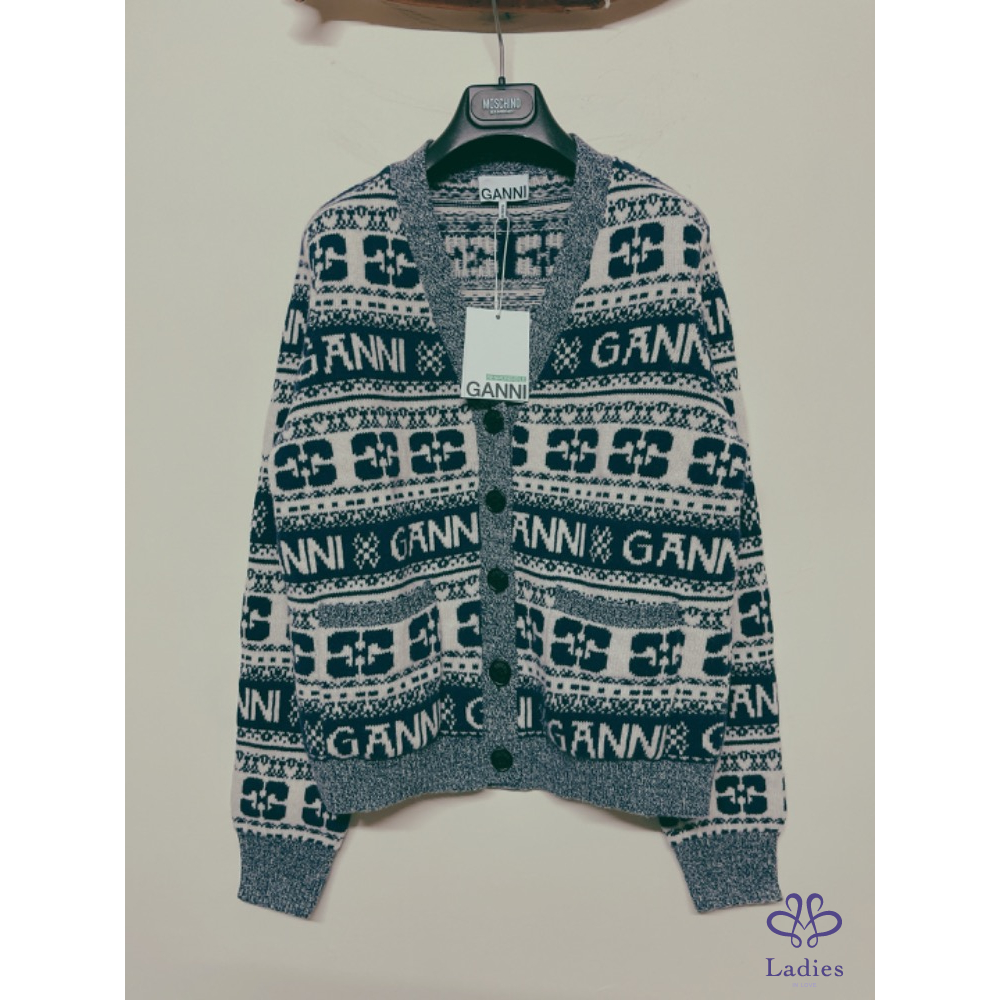 全新GANNI藍灰色滿版Logo緹花亮片羊毛針織外套