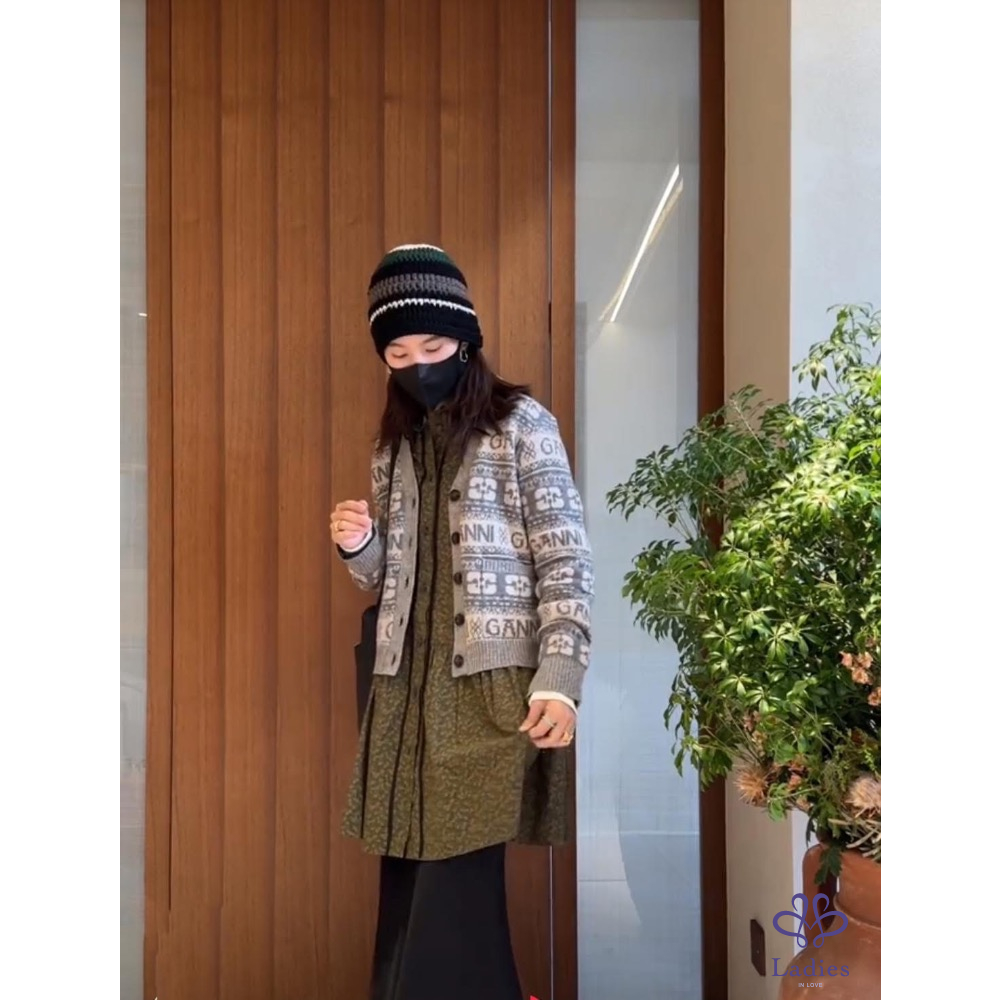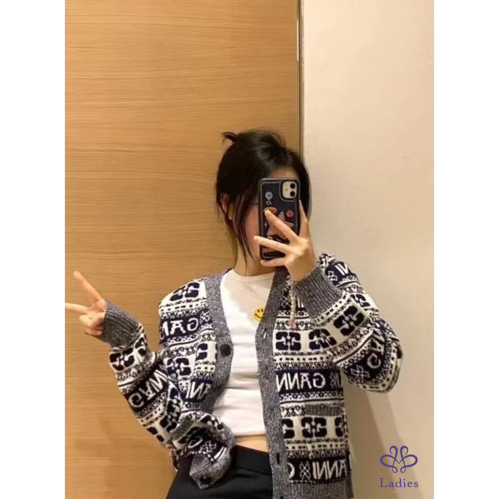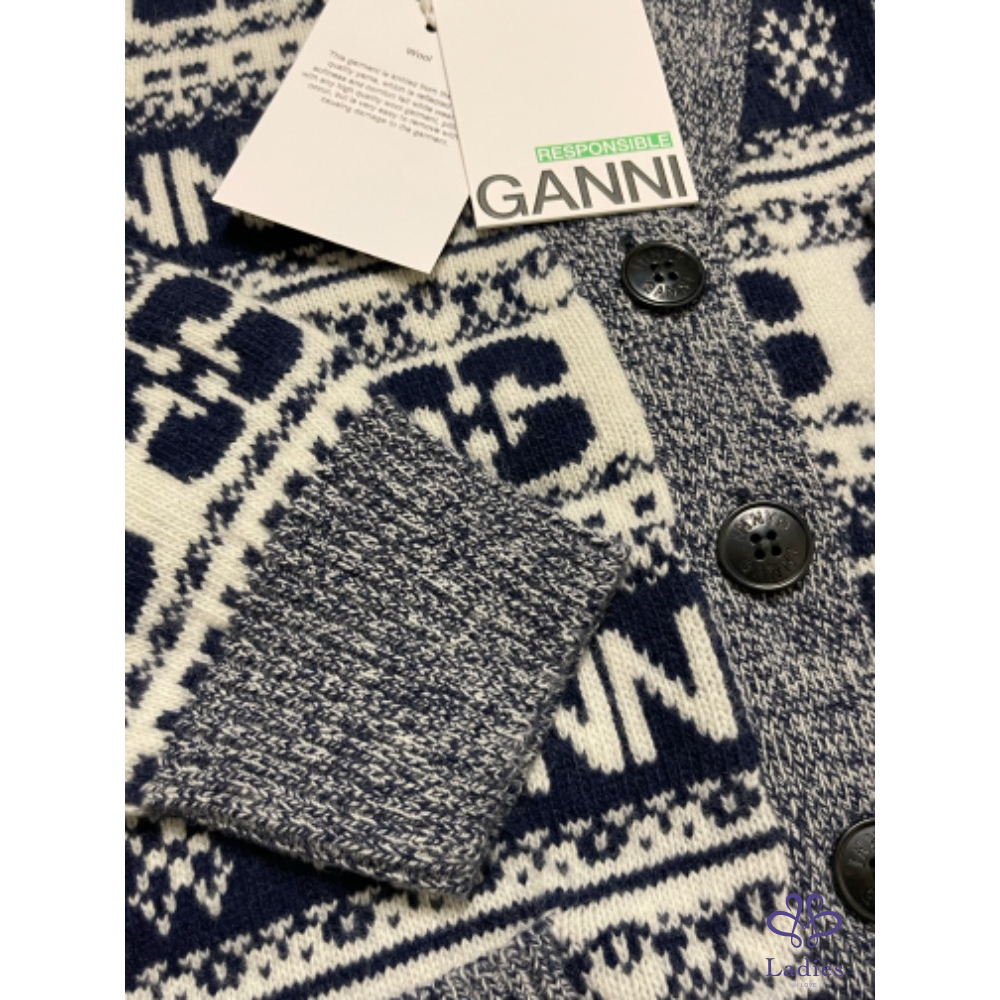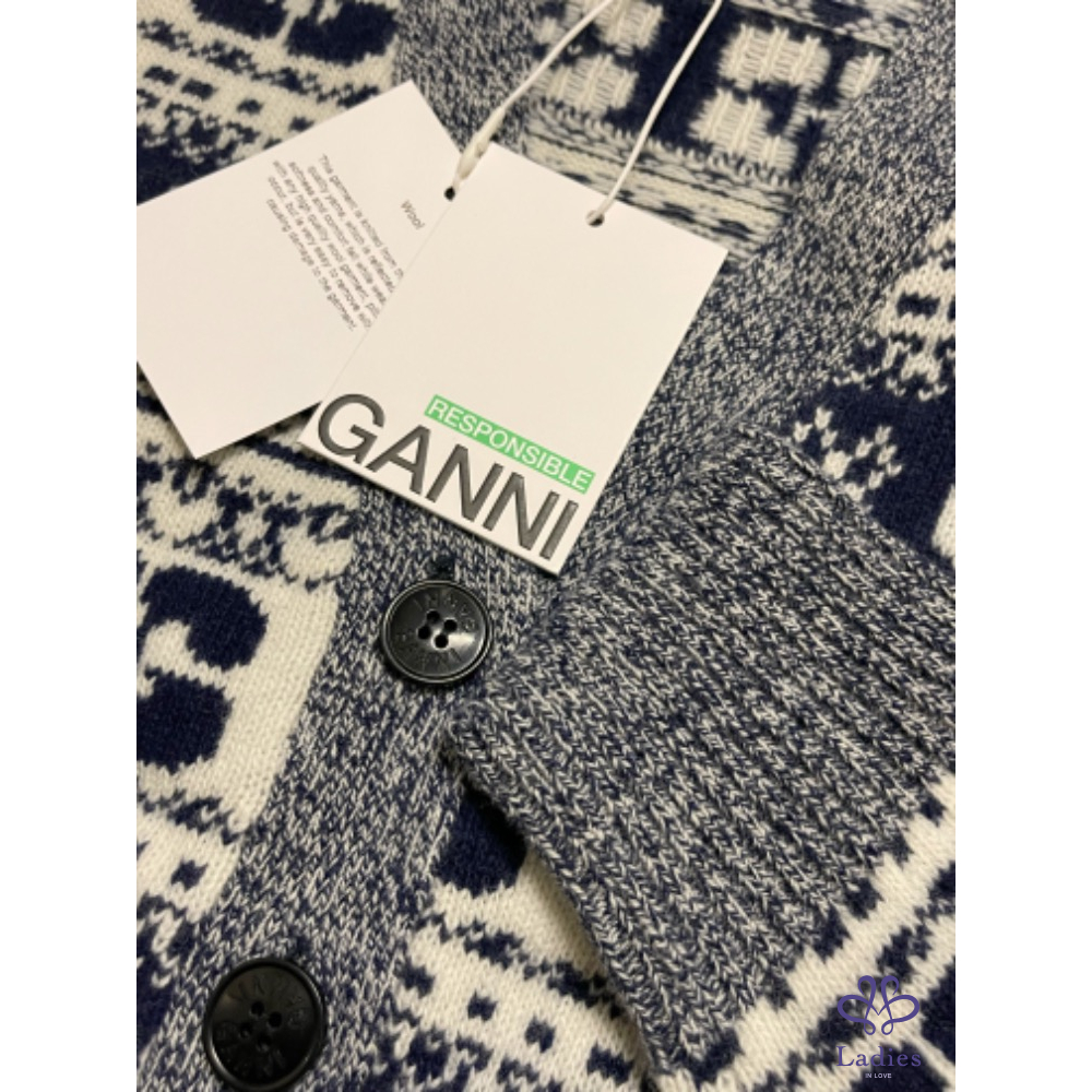 全新GANNI藍灰色滿版Logo緹花亮片羊毛針織外套