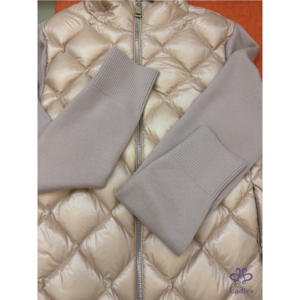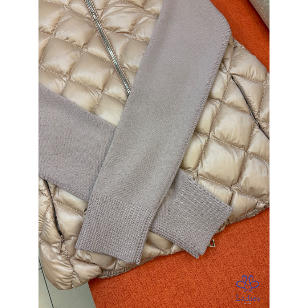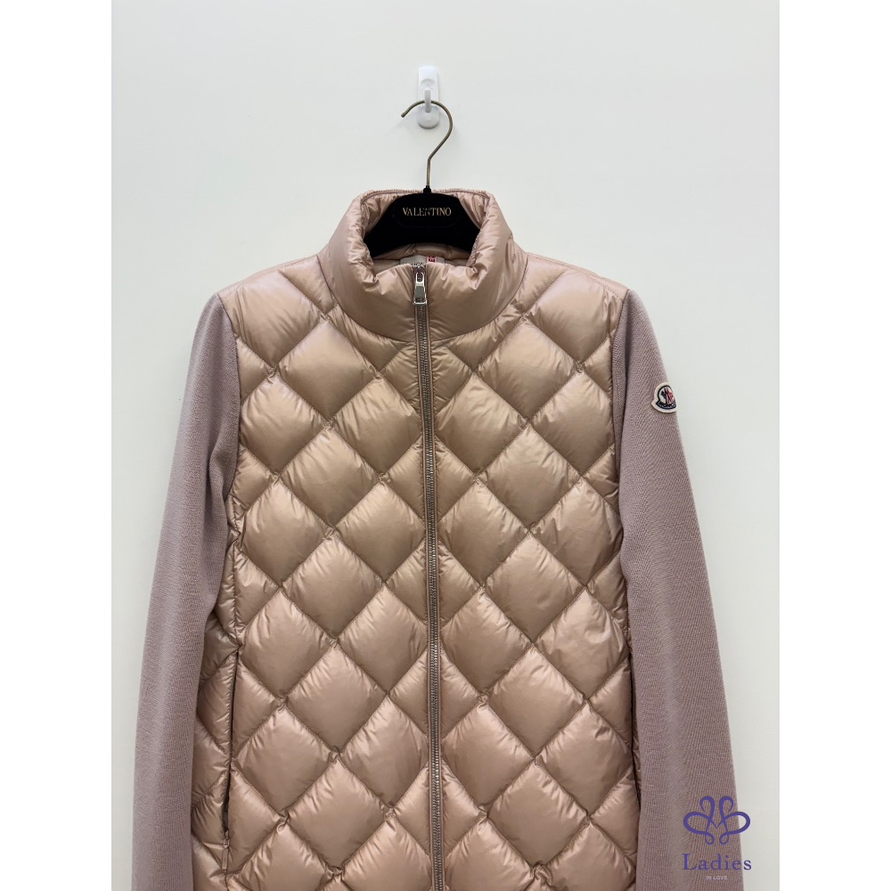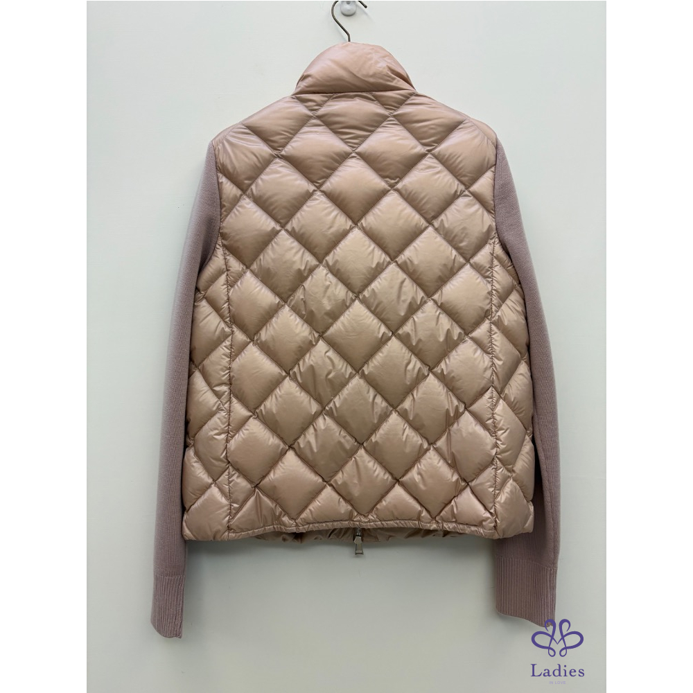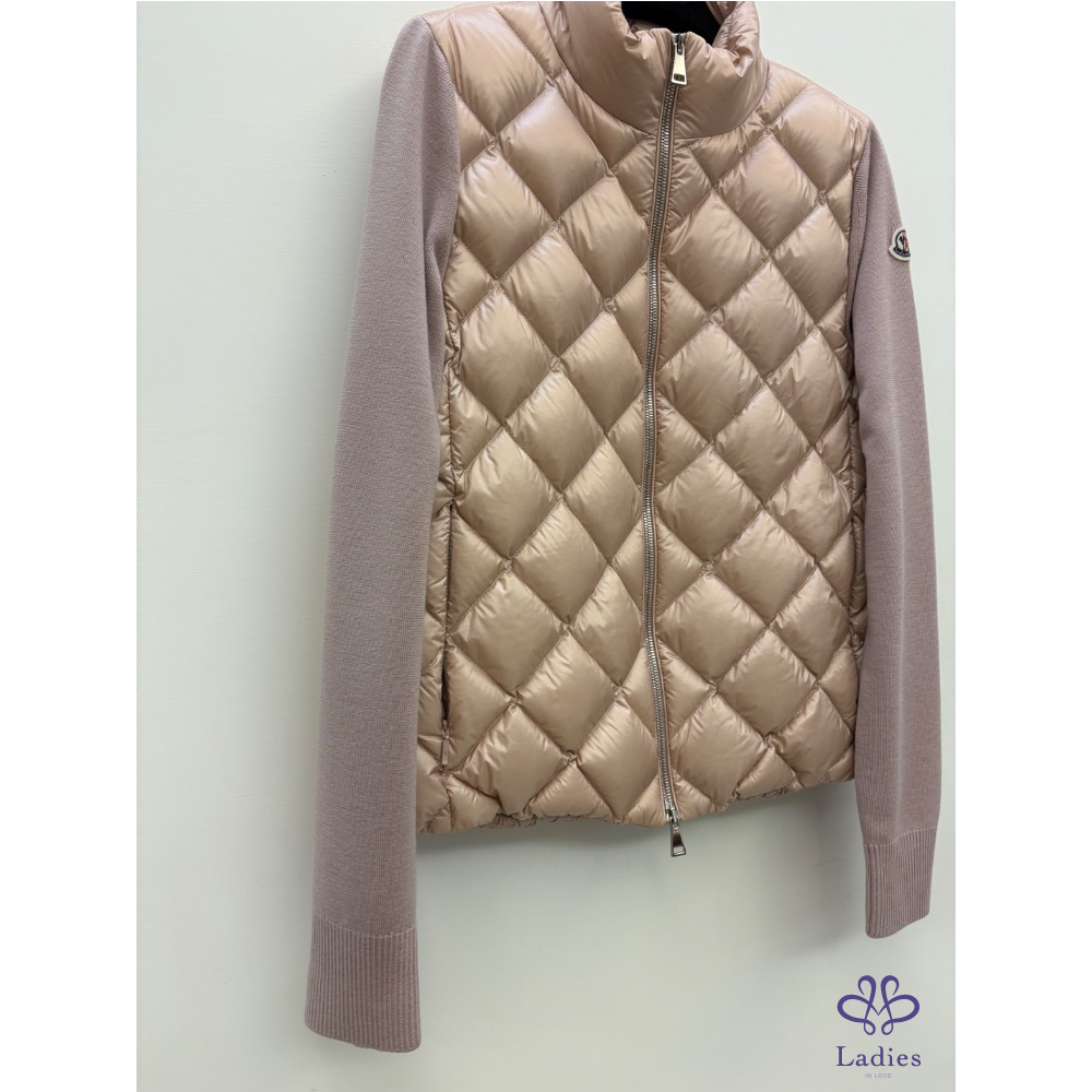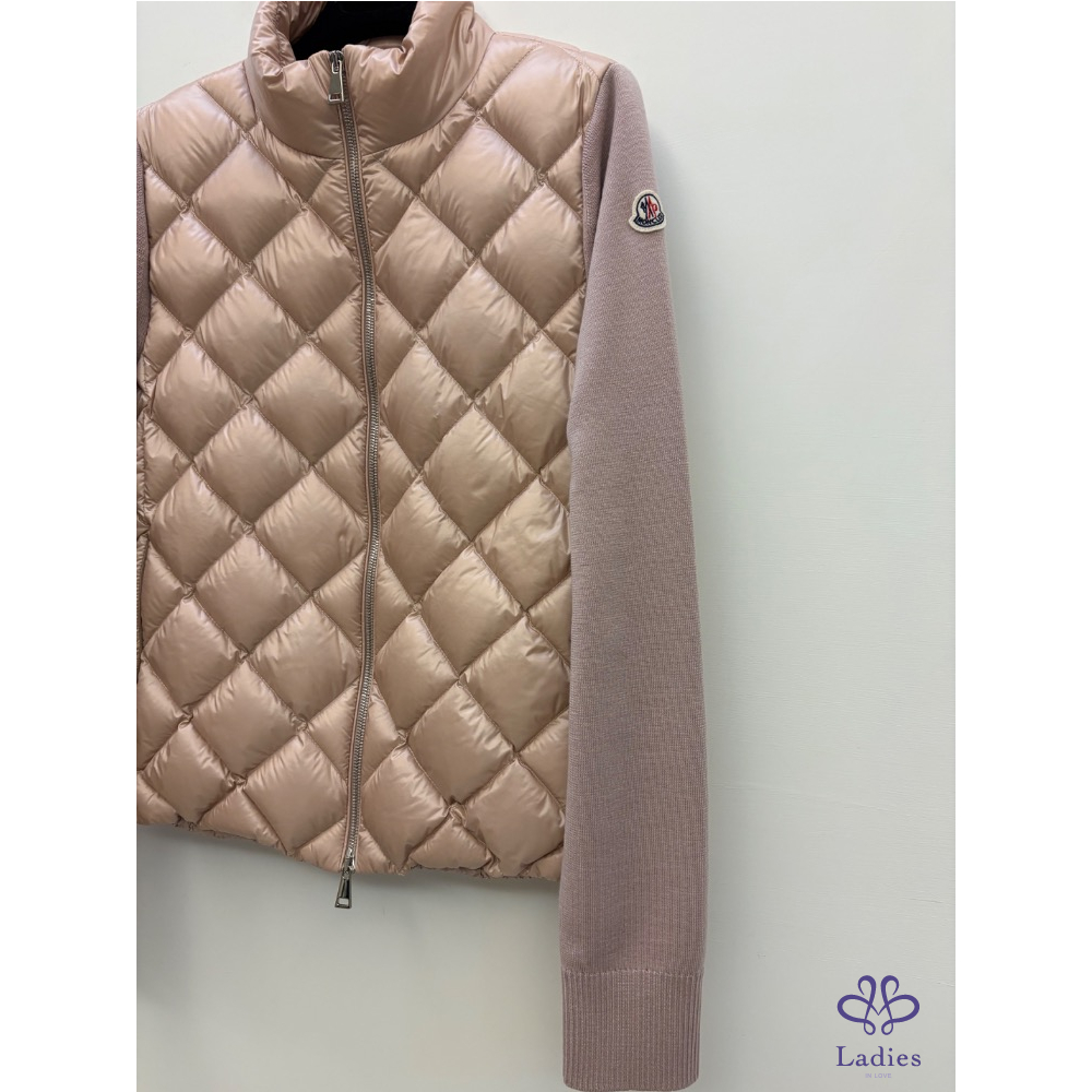 Moncler 女士開襟衫。這款開襟衫前後片採用菱形絎縫長絨布料,保暖輕盈;袖子則採用超細美利奴羊毛製成。正面配有雙向拉鍊,袖口為羅紋設計,左袖飾有品牌標誌。