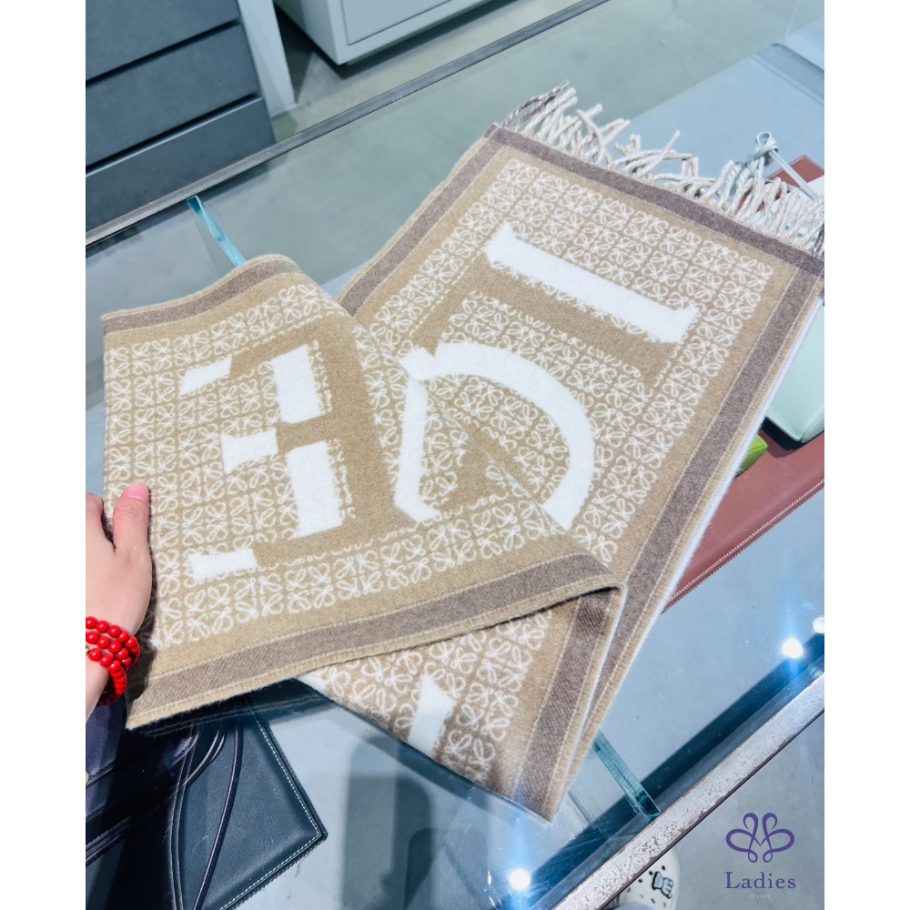 Loewe 奶茶色 品牌字母 圍巾 全新全配
