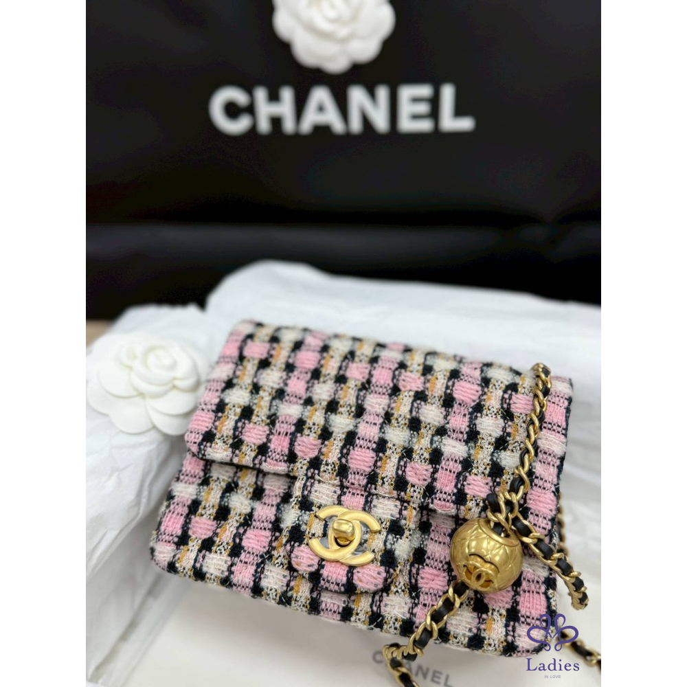 💡💗香奈兒23K 粉色毛呢千鳥格金球包 CF方胖子包