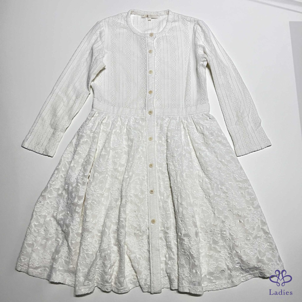 純白小圓領前排扣洋裝,上身直紋鏤空針織感,腰間有立體腰帶線條,裙擺是花朵蕾絲帶細細金銀光,傘狀版型顯腰又修飾腿型。單穿配跟鞋很仙,外搭西外也能上班約會。
