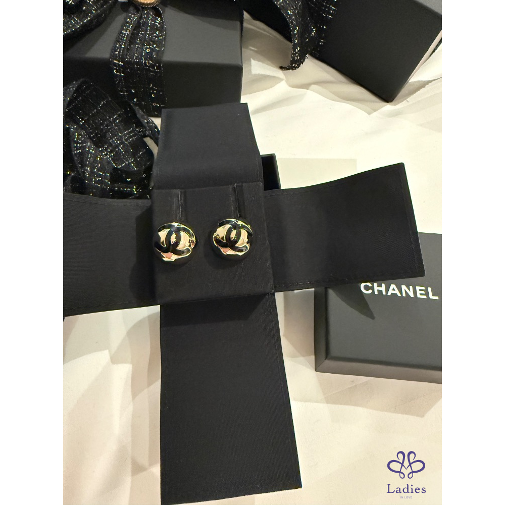 Chanel 耳環 耳針 半球金色黑字 全新