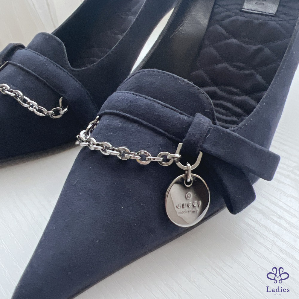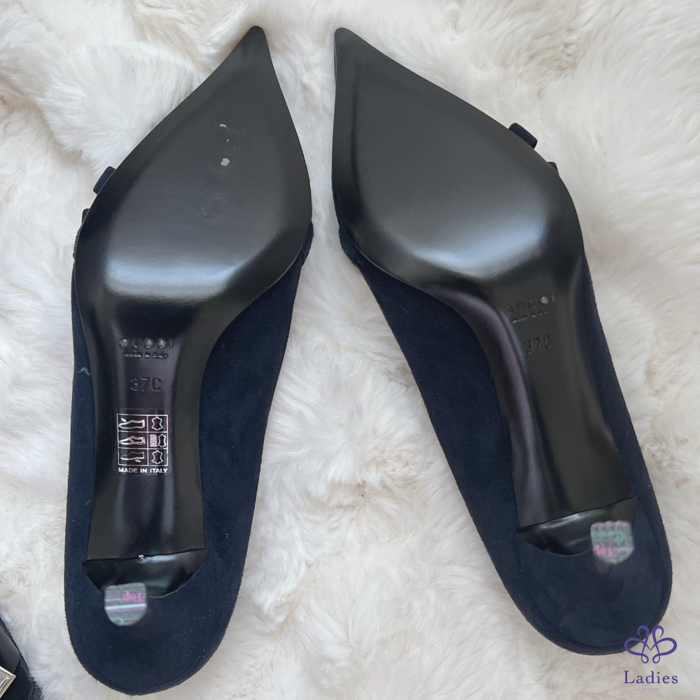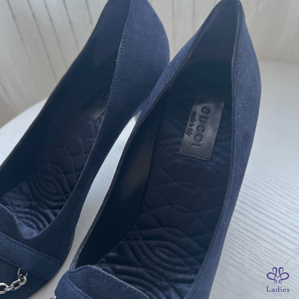 Gucci 天鵝絨高跟鞋 深藍x銀牌 37