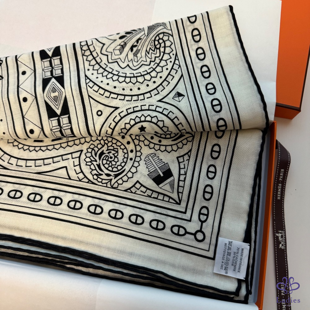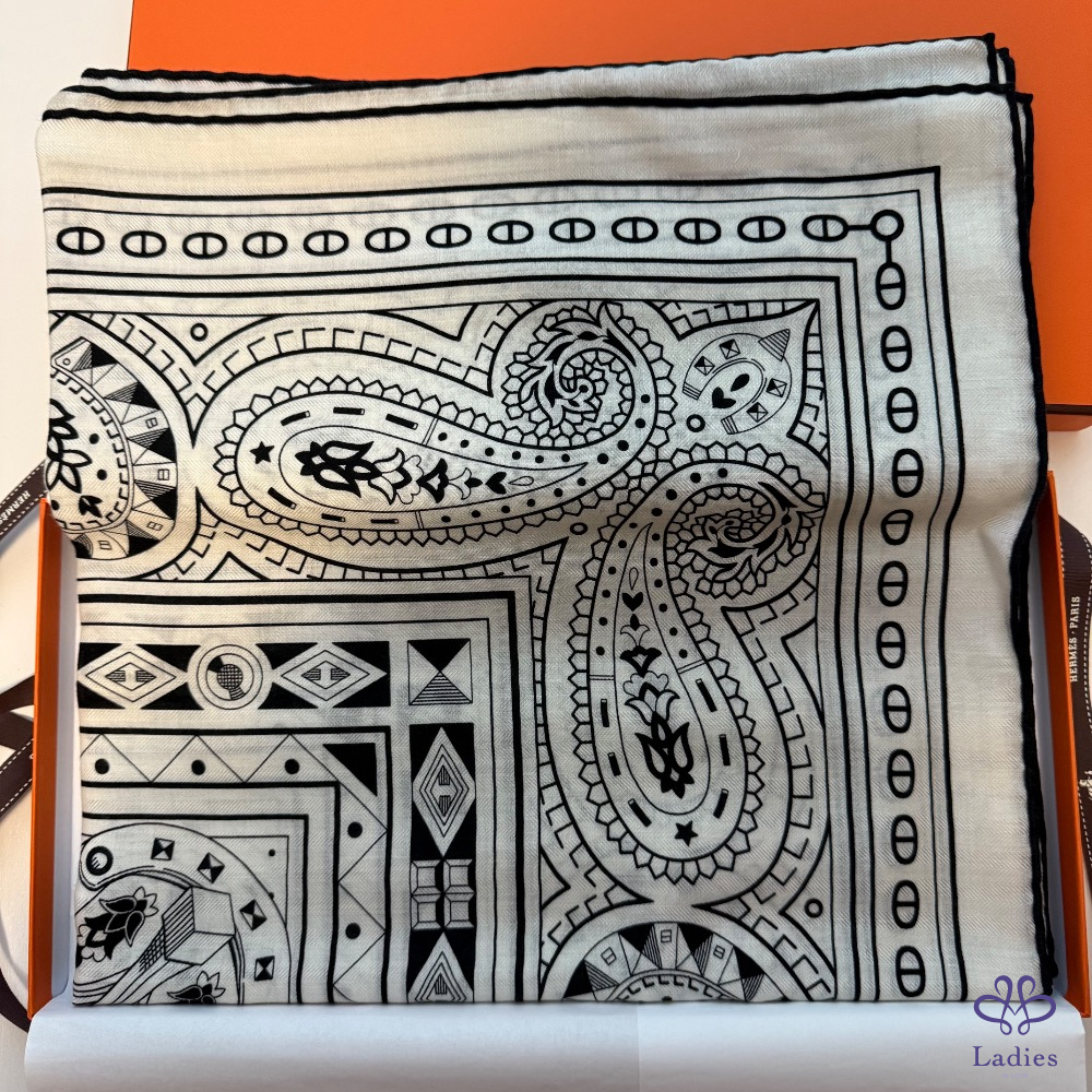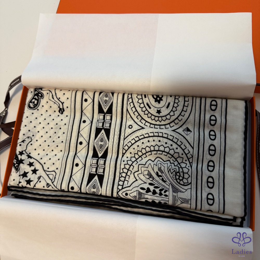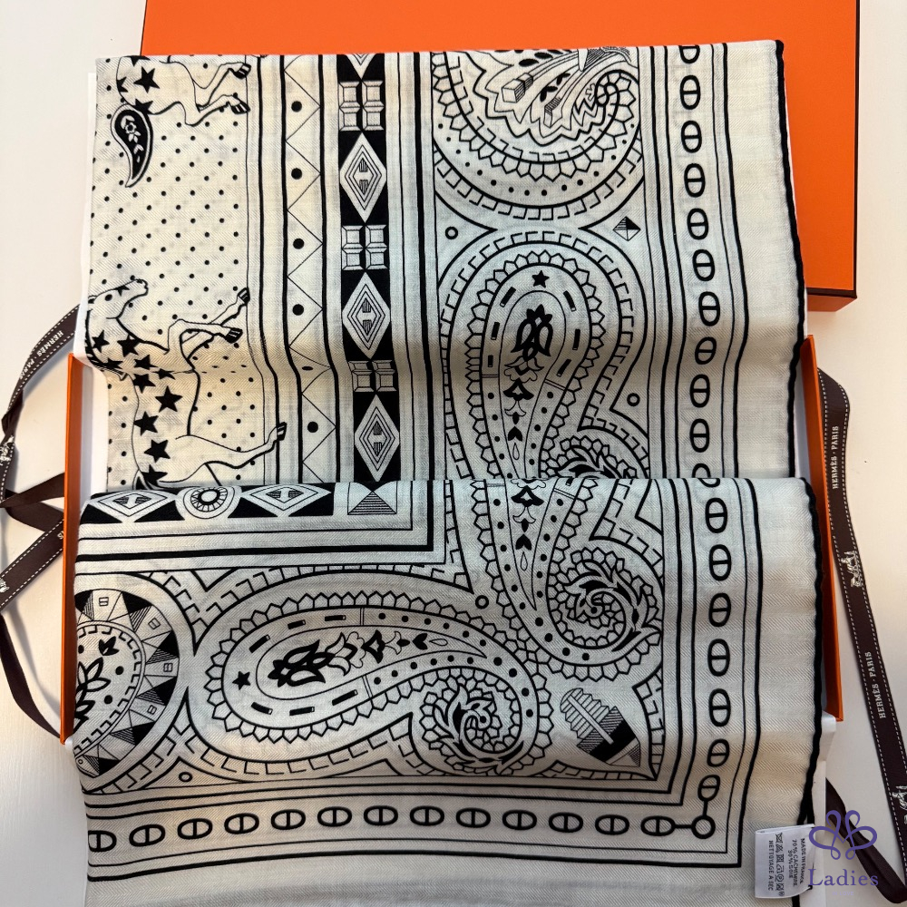 產品信息 Hermes 140 絲巾 全新 - 心之馬 Bandana - 白色 - 70% cashmere - 全新現貨 本人精緻好看 上身更美麗 圖上有獵豹和變形蟲圖樣 正中央愛心款 附:橘盒、緞帶、購證影本去個資