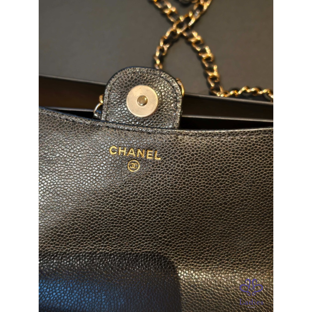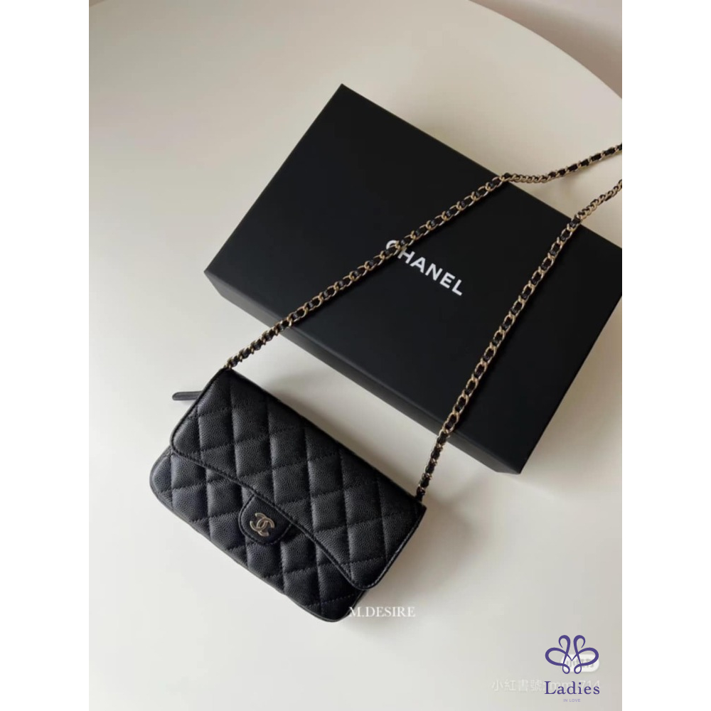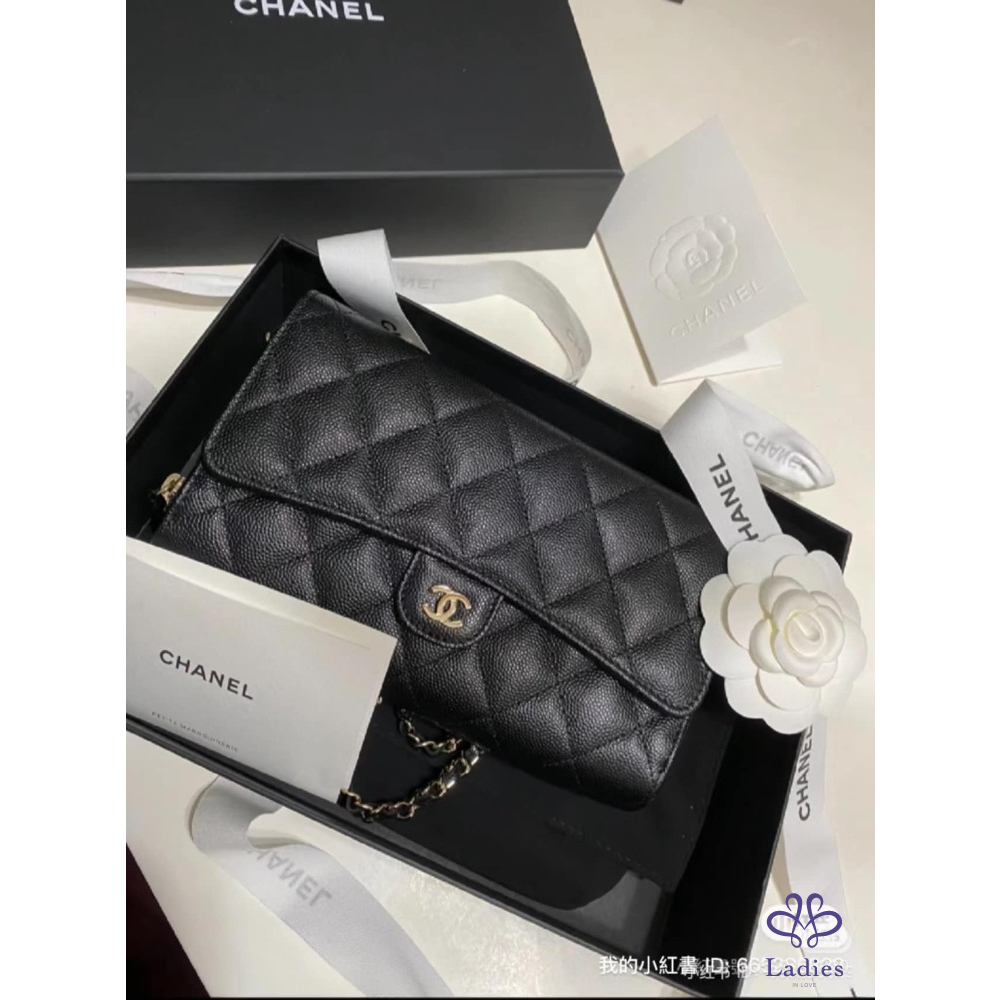 產品信息 經典可遇不可求黑色荔枝皮淡金扣 iPhone pro max裝的下 包況:全新閒置包況 膠膜 防塵墊都沒拆 附件:紙袋、盒裝、防塵袋、緞帶、山茶花 ▪尺寸:18 X 11.5 X 4 cm 經典CF包外型加上耐用荔枝皮 把Woc跟手機包結合在ㄧ起 功能更強大、更能裝! 桃園面交或郵寄
