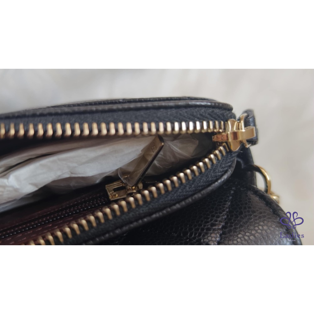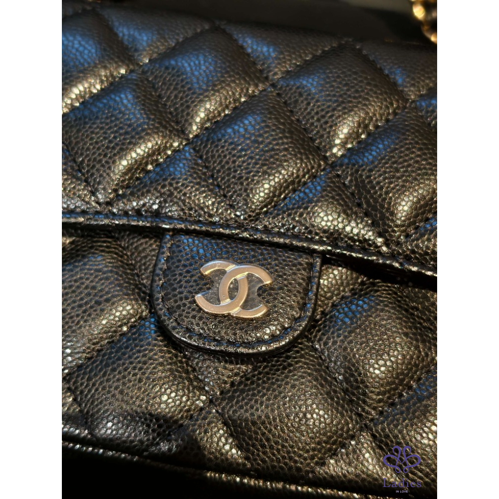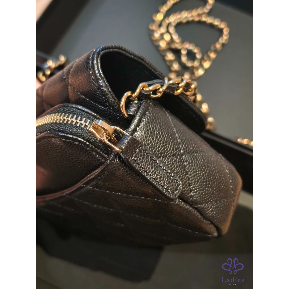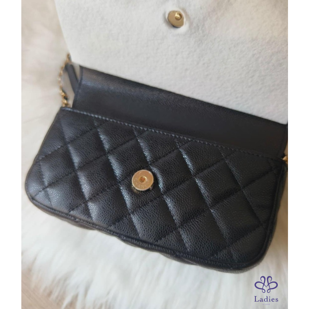 產品信息 經典可遇不可求黑色荔枝皮淡金扣 iPhone pro max裝的下 包況:全新閒置包況 膠膜 防塵墊都沒拆 附件:紙袋、盒裝、防塵袋、緞帶、山茶花 ▪尺寸:18 X 11.5 X 4 cm 經典CF包外型加上耐用荔枝皮 把Woc跟手機包結合在ㄧ起 功能更強大、更能裝! 桃園面交或郵寄