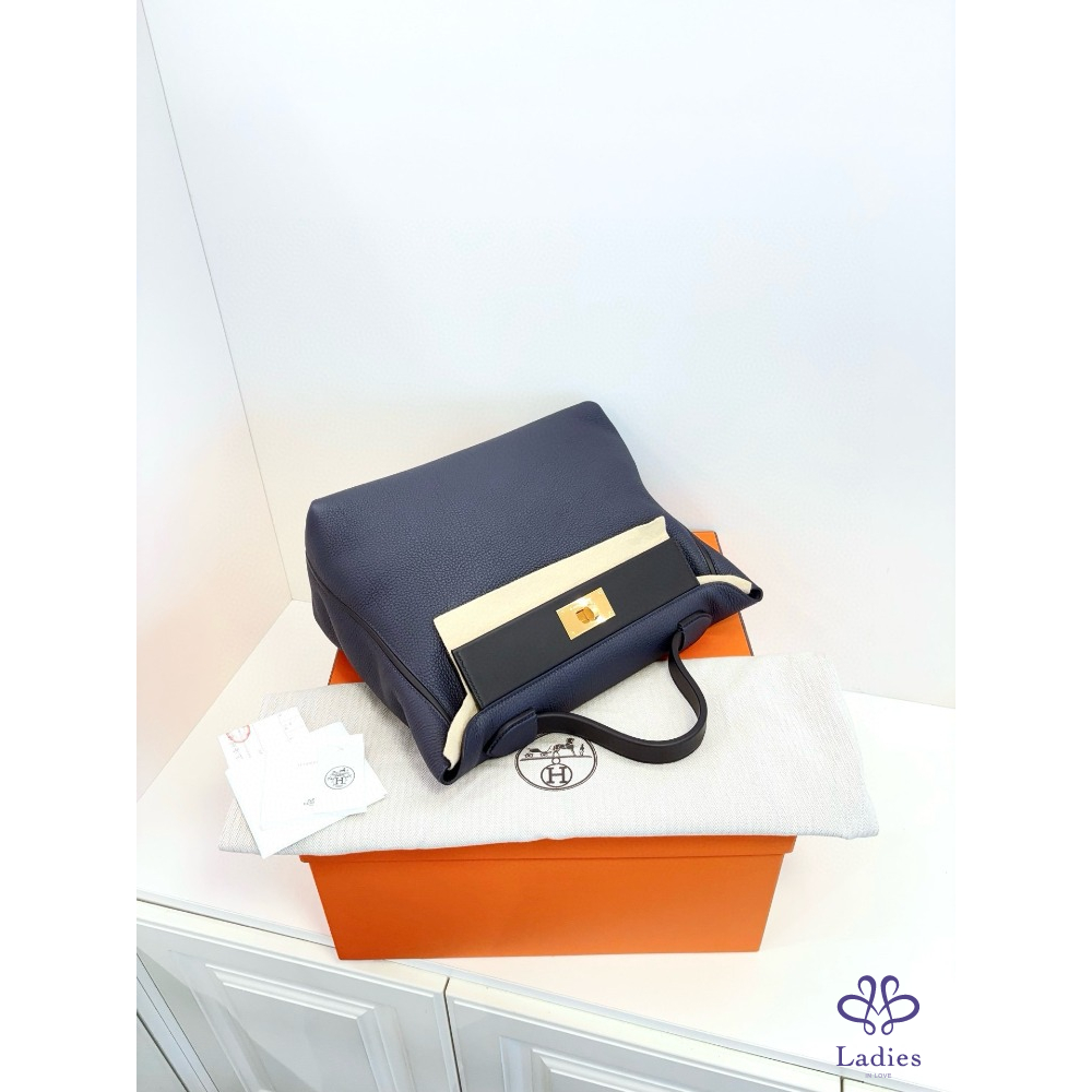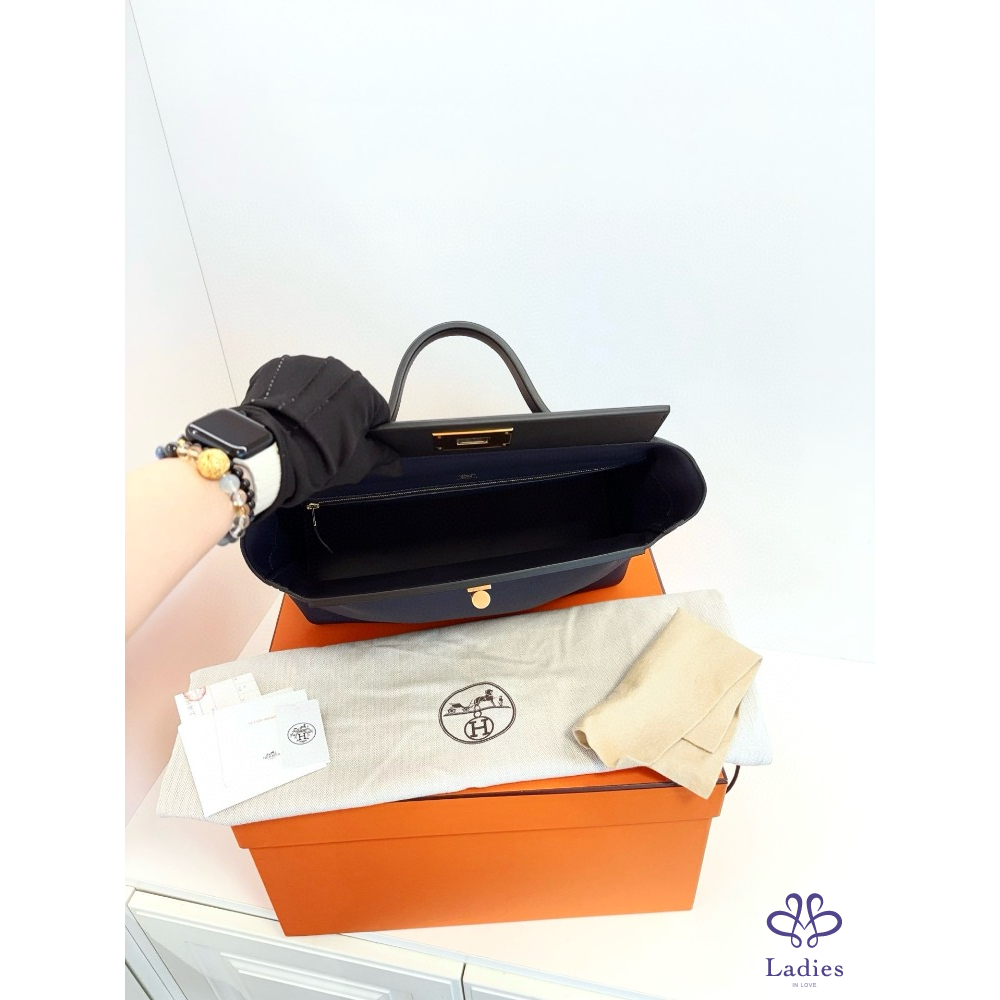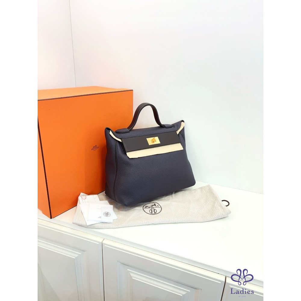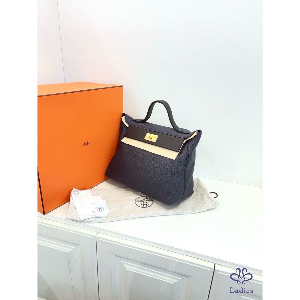 HERMES 愛馬仕 24午夜藍拼黑 金扣大號 手提包 Togo 拼 s 皮 D 刻