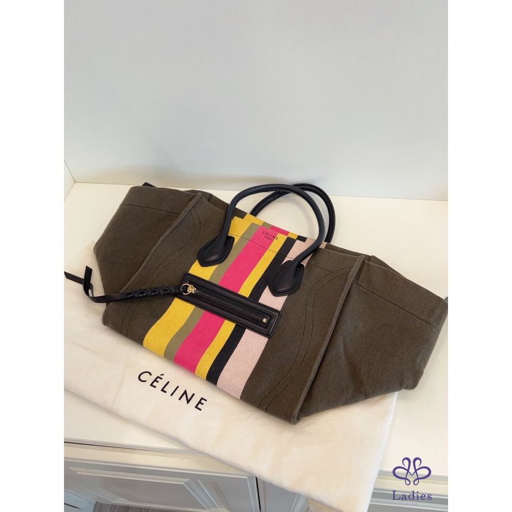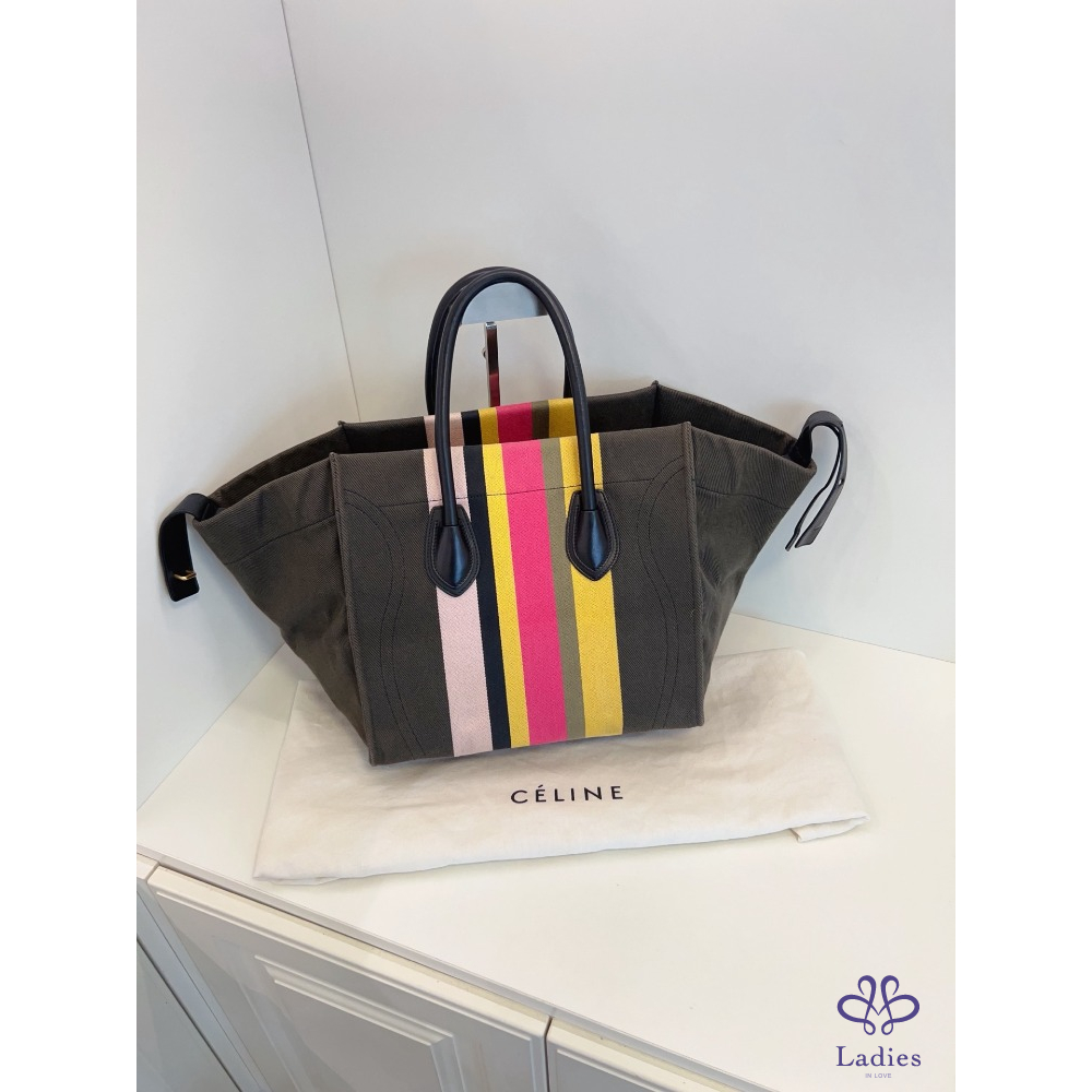 CELINE 賽琳 彩條紋軍綠帆布 Luggage 蝙蝠笑臉包 托特手提包