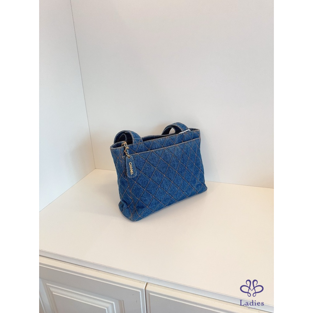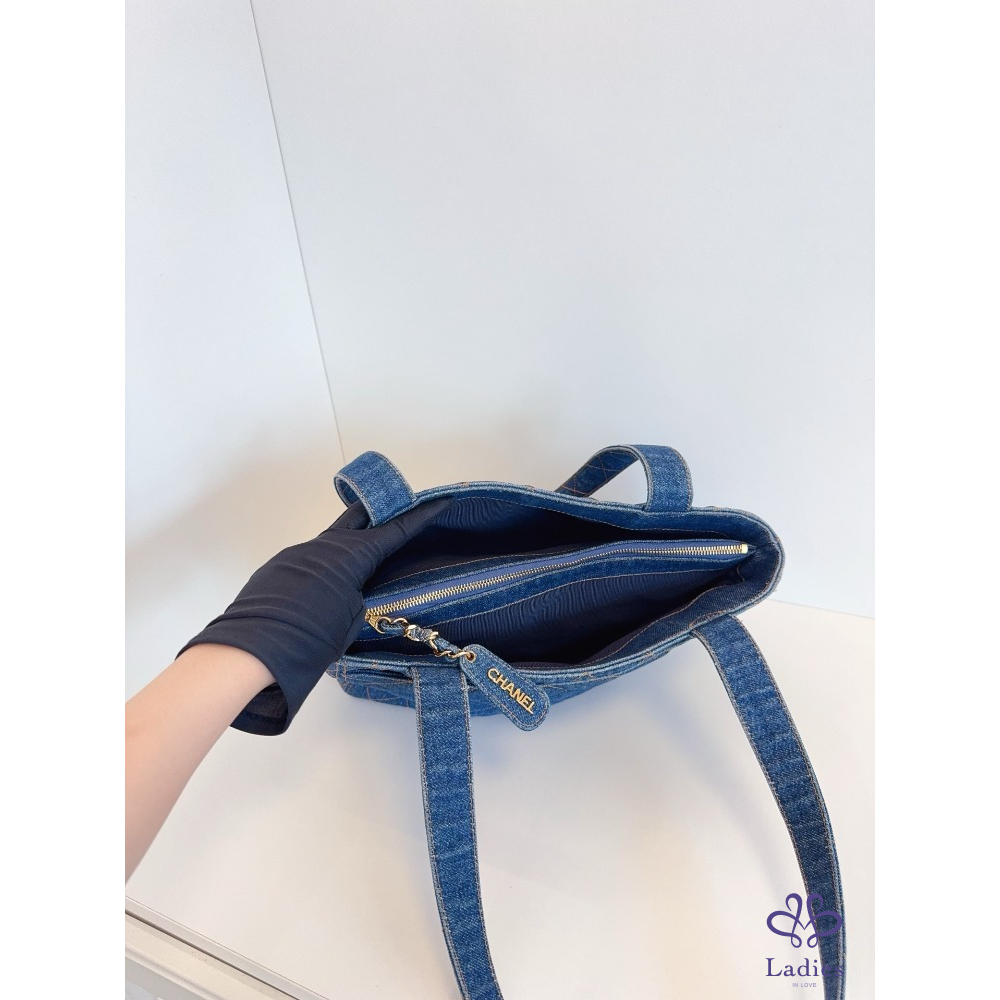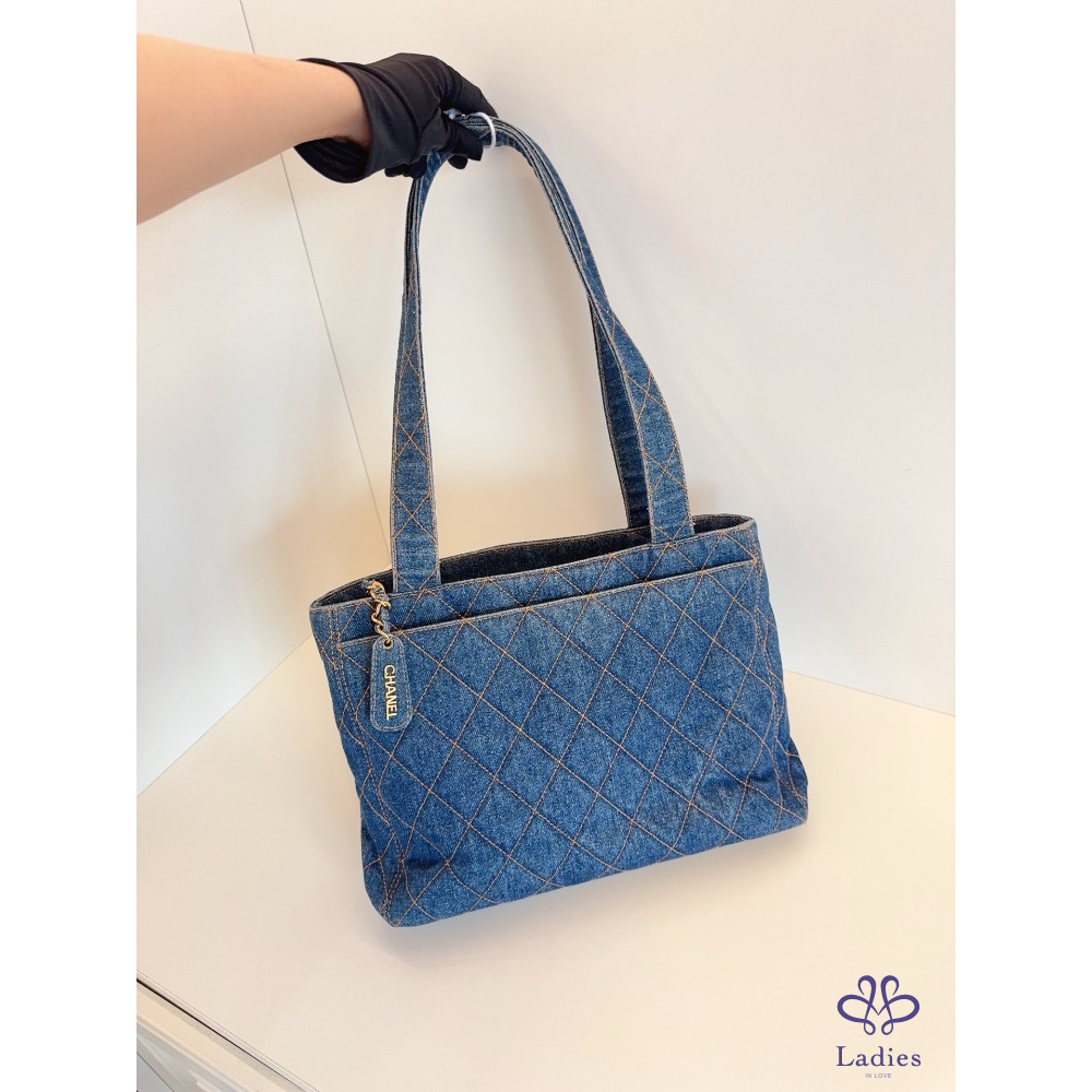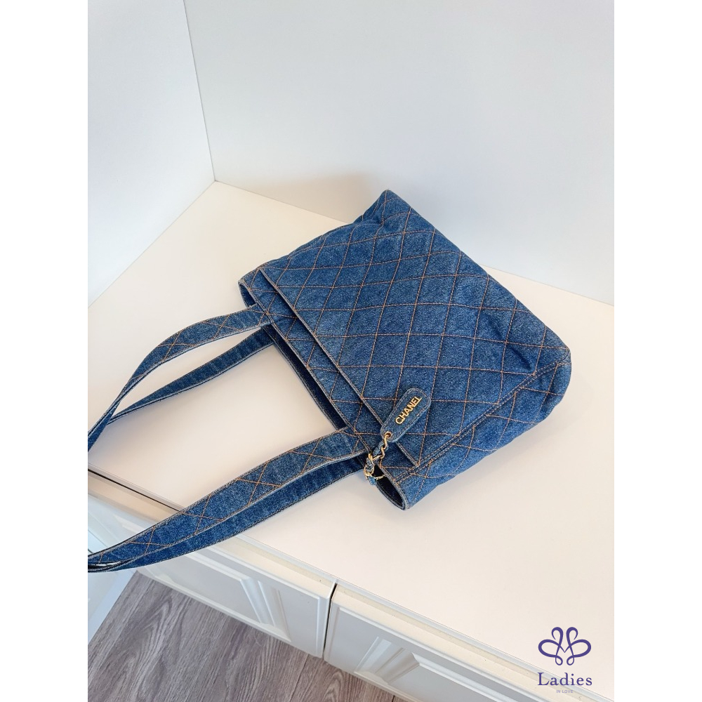 首頁 精品包包 CHANEL香奈兒 牛仔丹寧 金扣菱格外縫線帆布 Tote