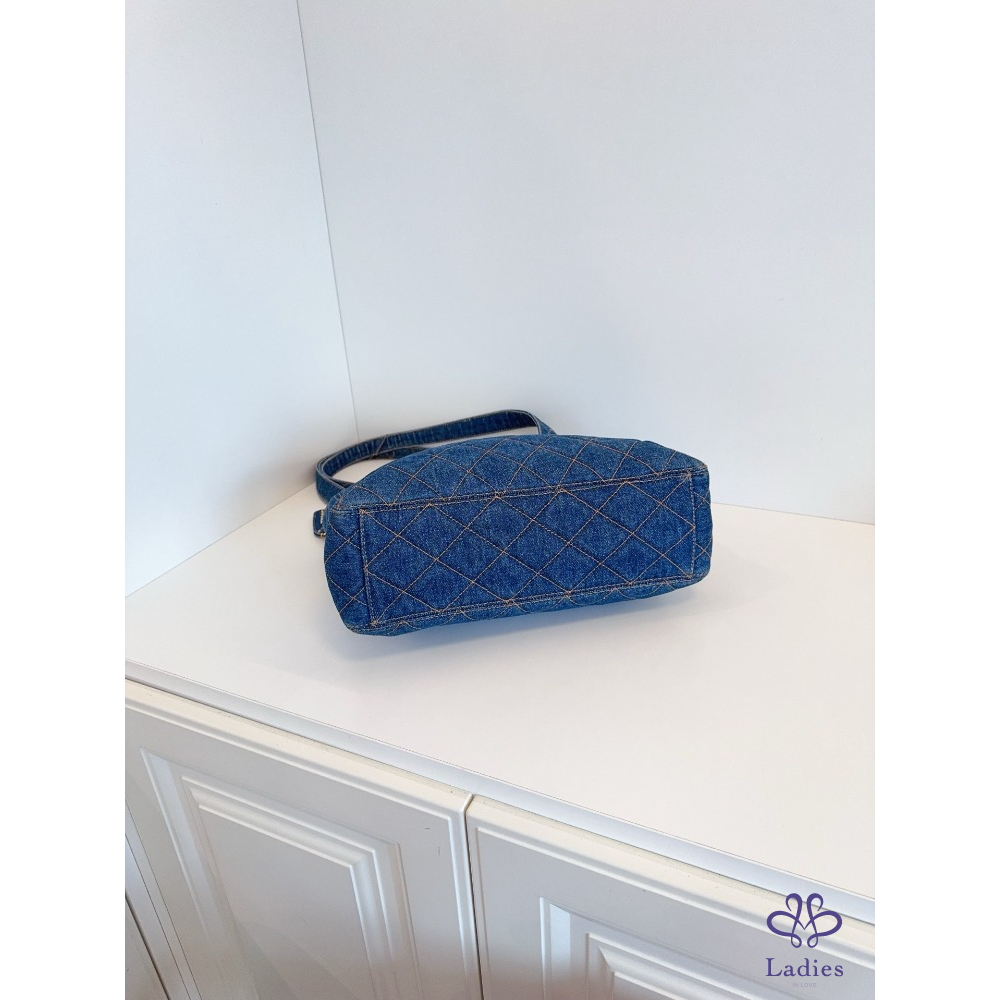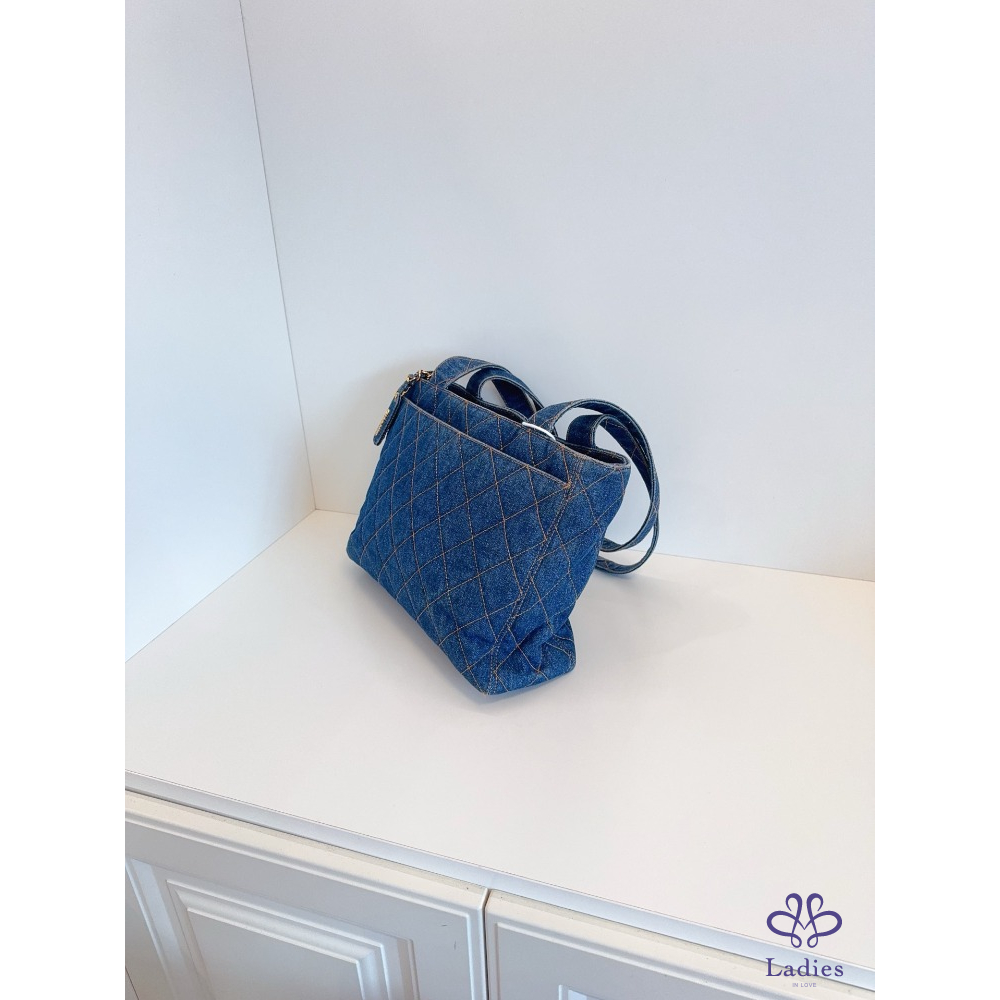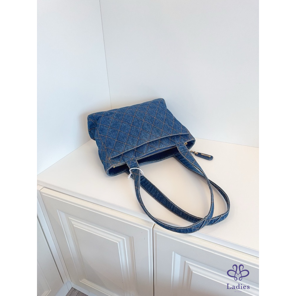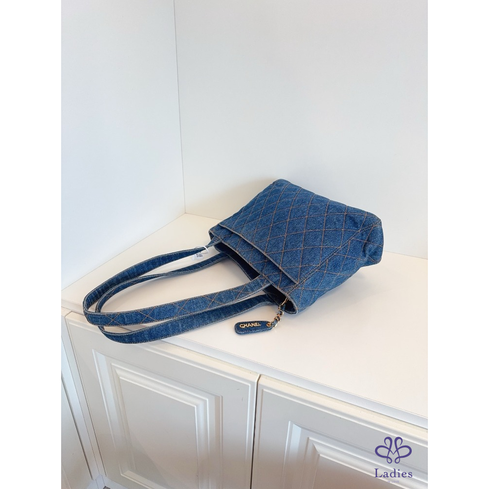 首頁 精品包包 CHANEL香奈兒 牛仔丹寧 金扣菱格外縫線帆布 Tote