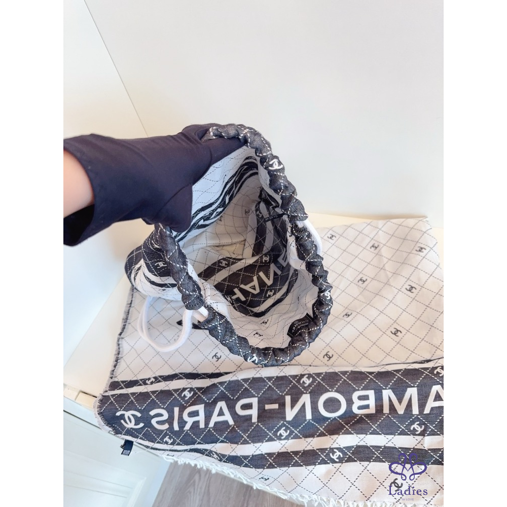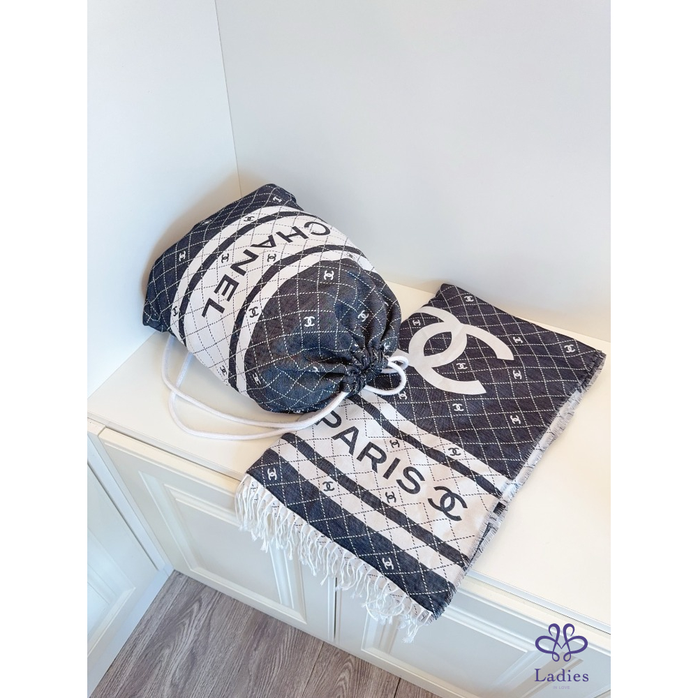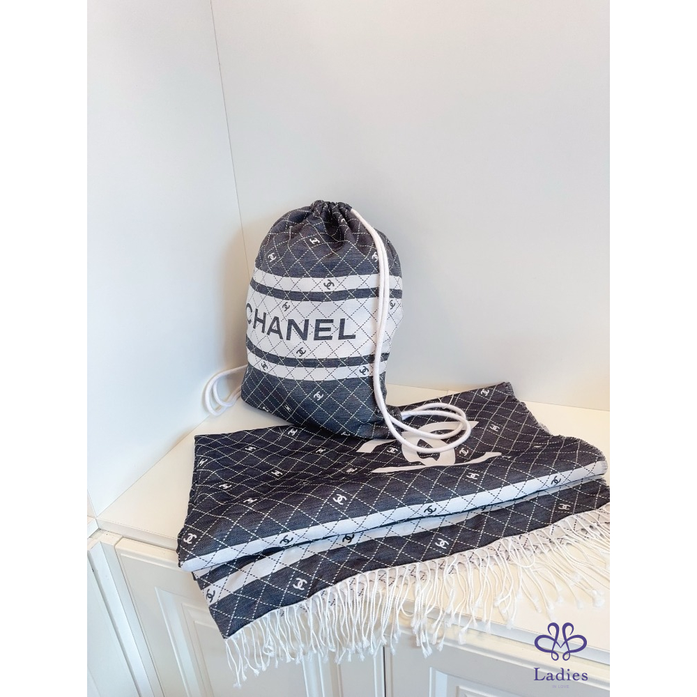 CHANEL 香奈兒 24p 黑灰帆布抽繩沙灘包 / 圍巾披肩 兩件組