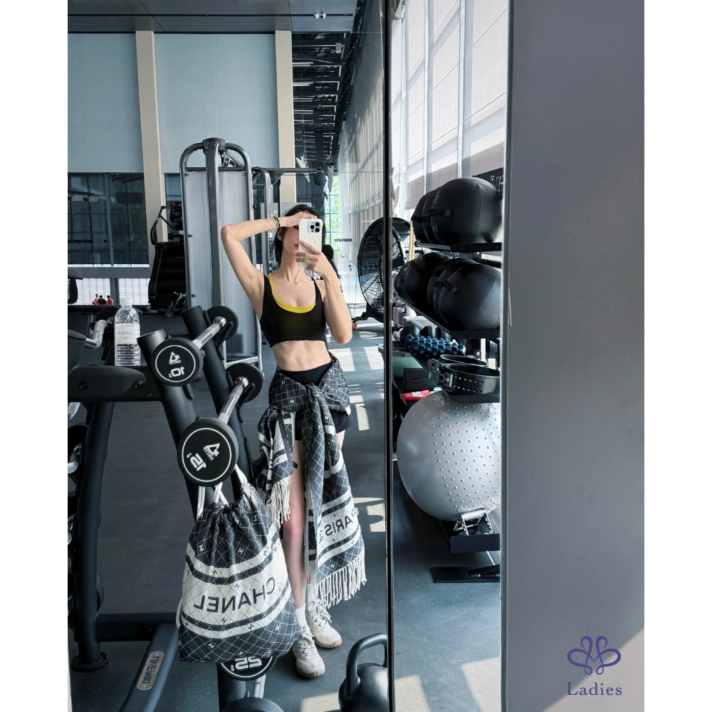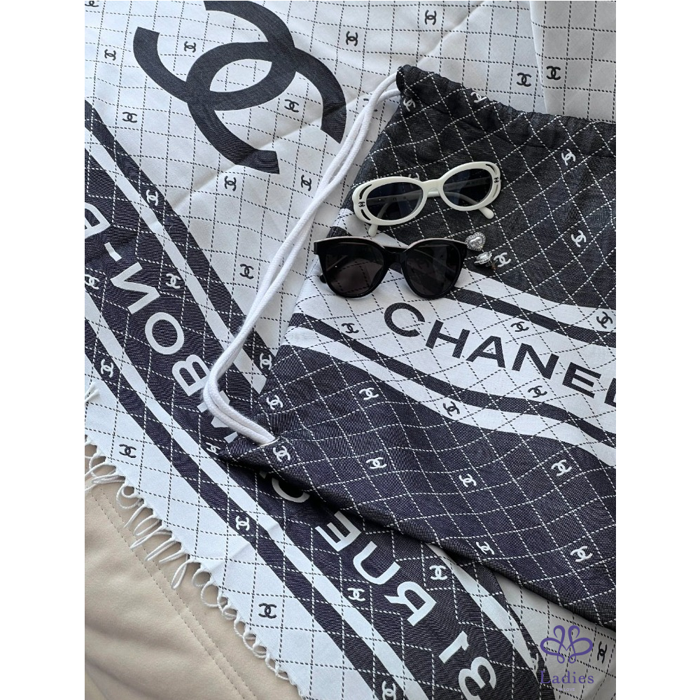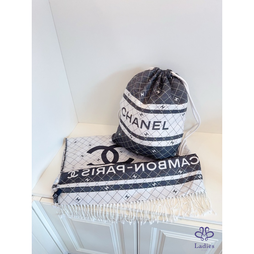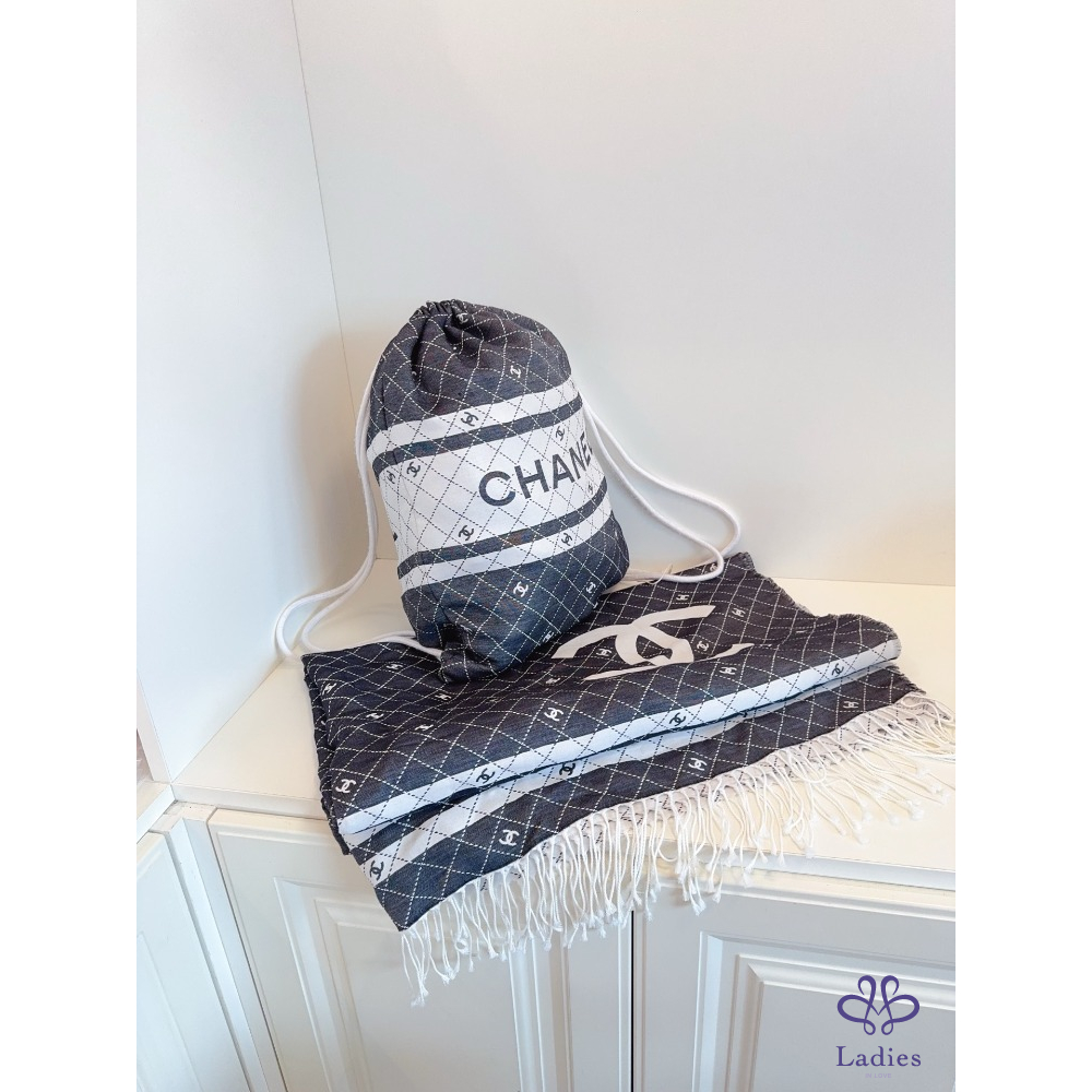 CHANEL 香奈兒 24p 黑灰帆布抽繩沙灘包 / 圍巾披肩 兩件組