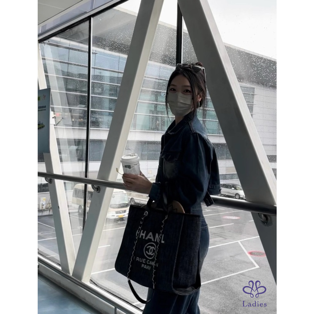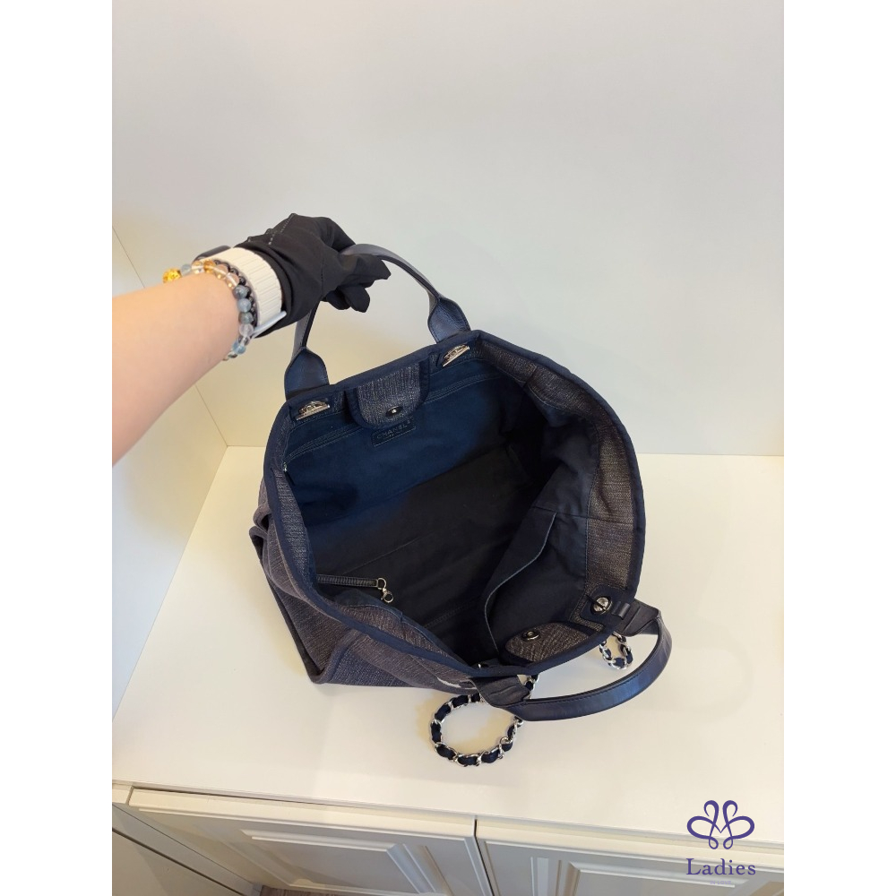 CHANEL 香奈兒 牛仔藍沙灘包 帆布拼牛皮