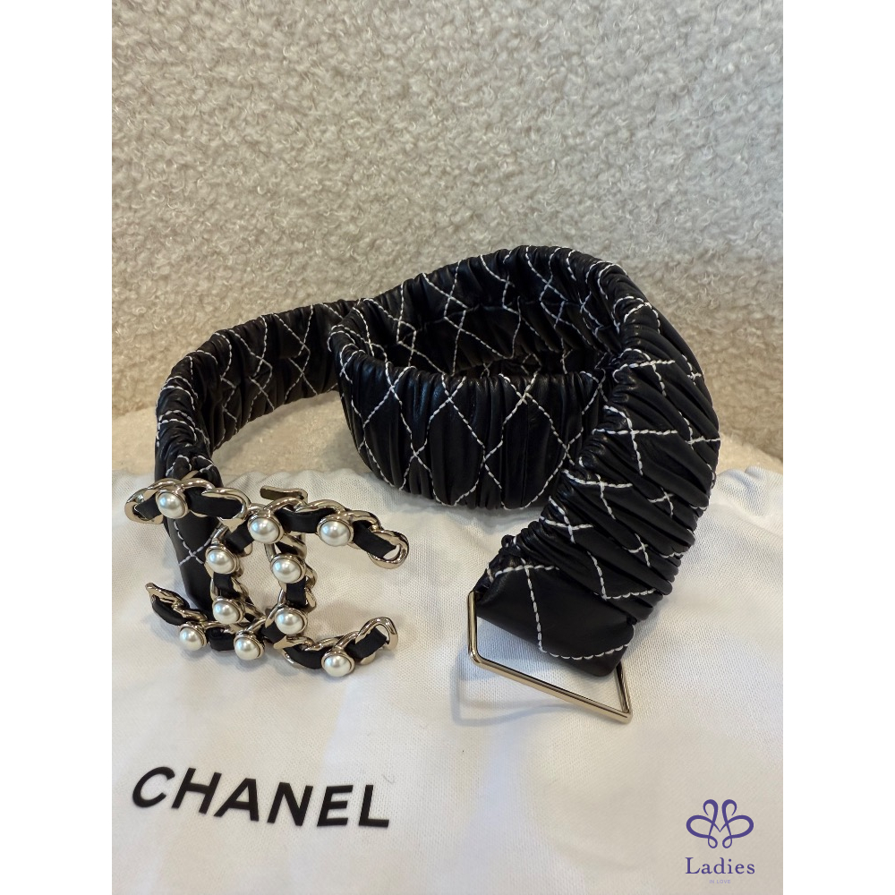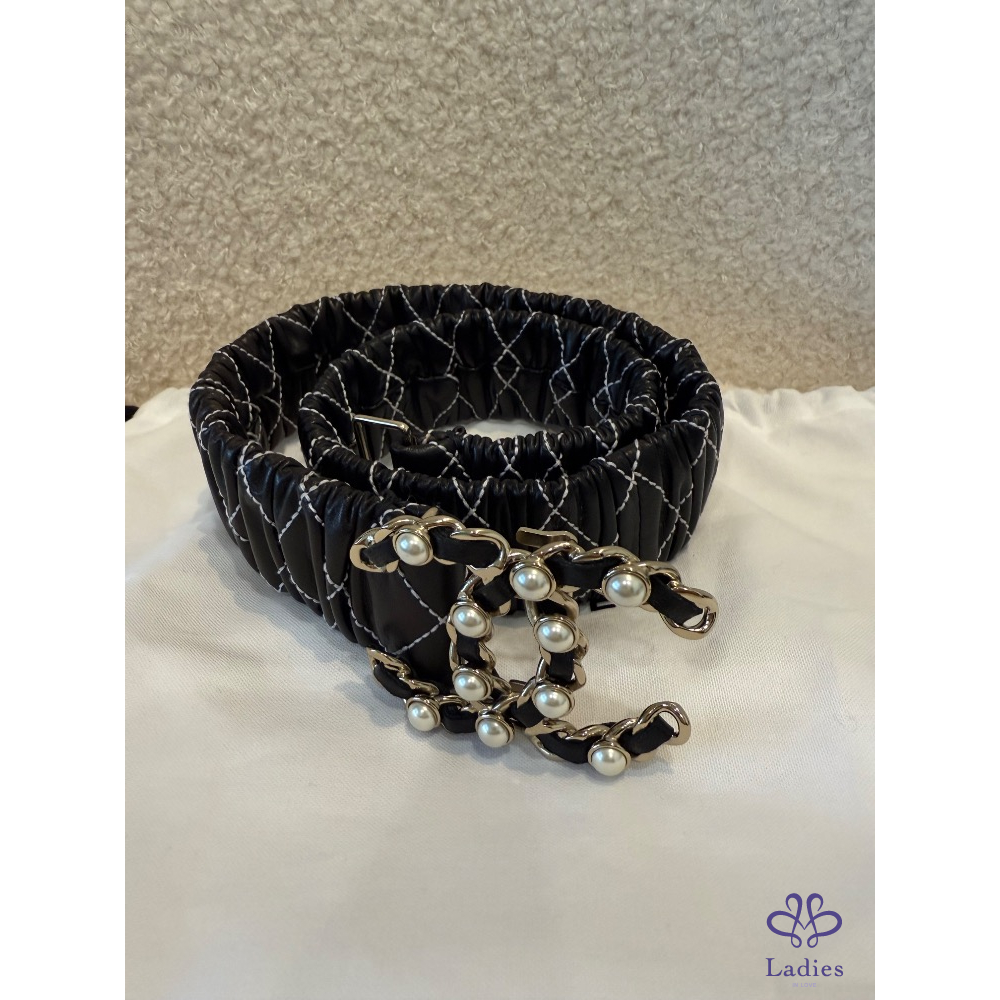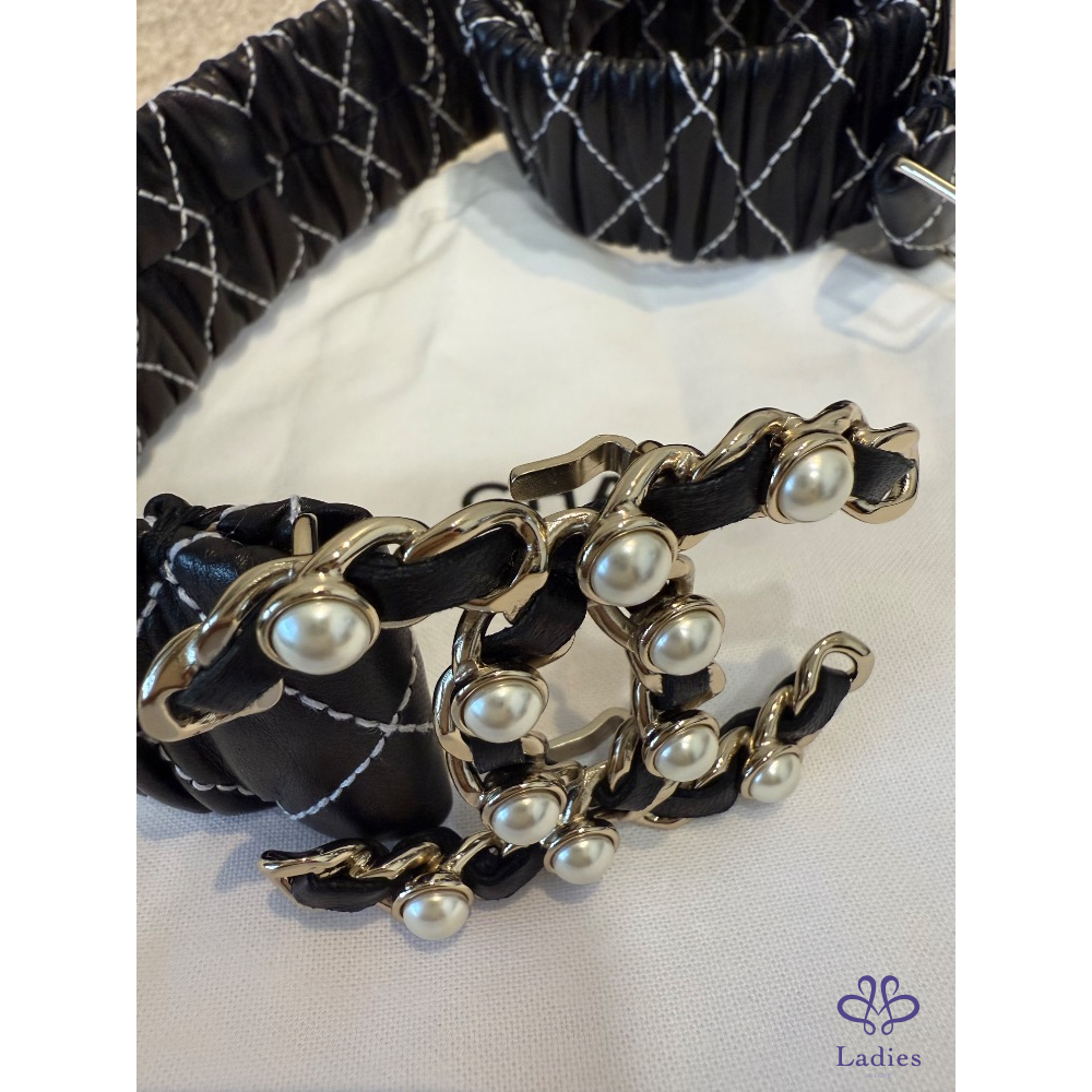 ❤️Chanel 黑色菱格縫線珍珠皮帶