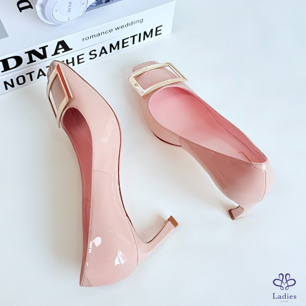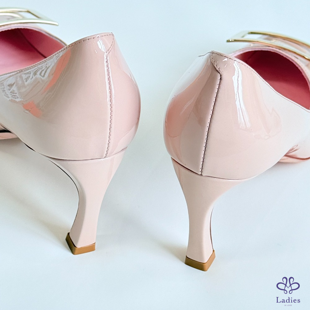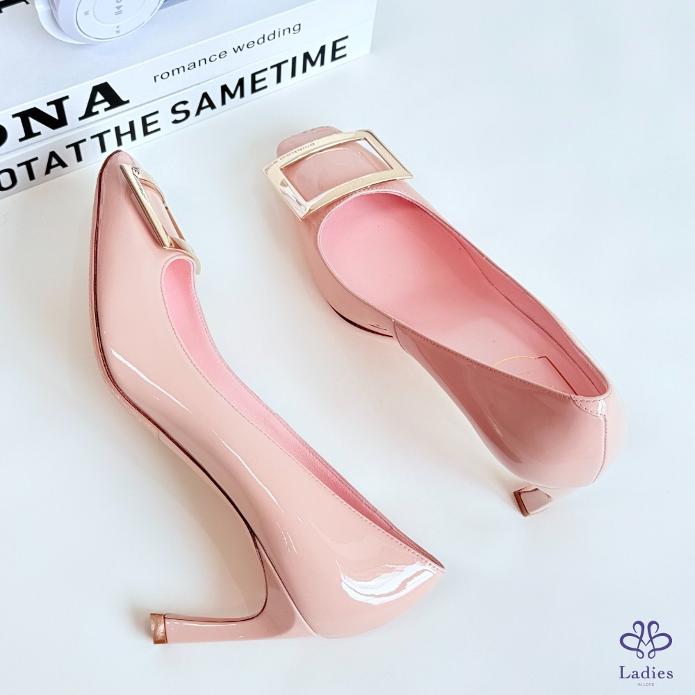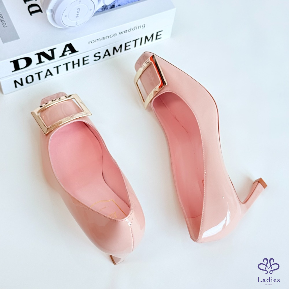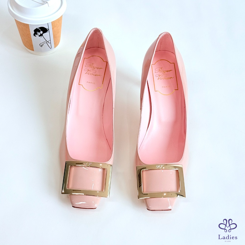 ROGER VIVIER RV 方扣粉色漆皮粗跟高跟鞋 36.5碼 全新 如圖描述 02735