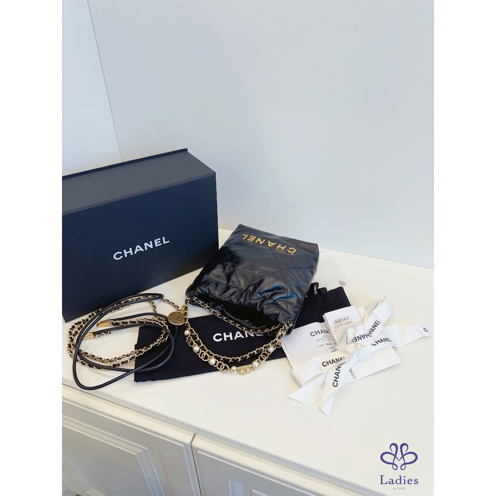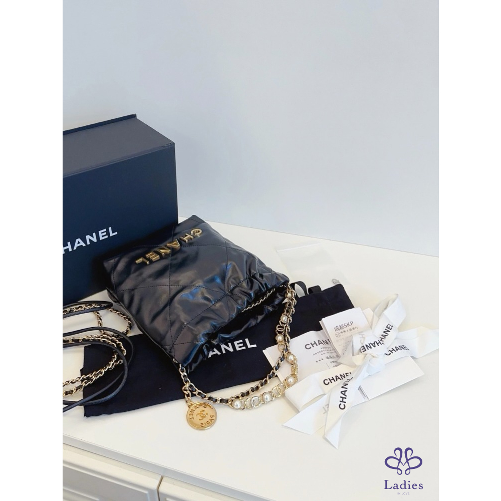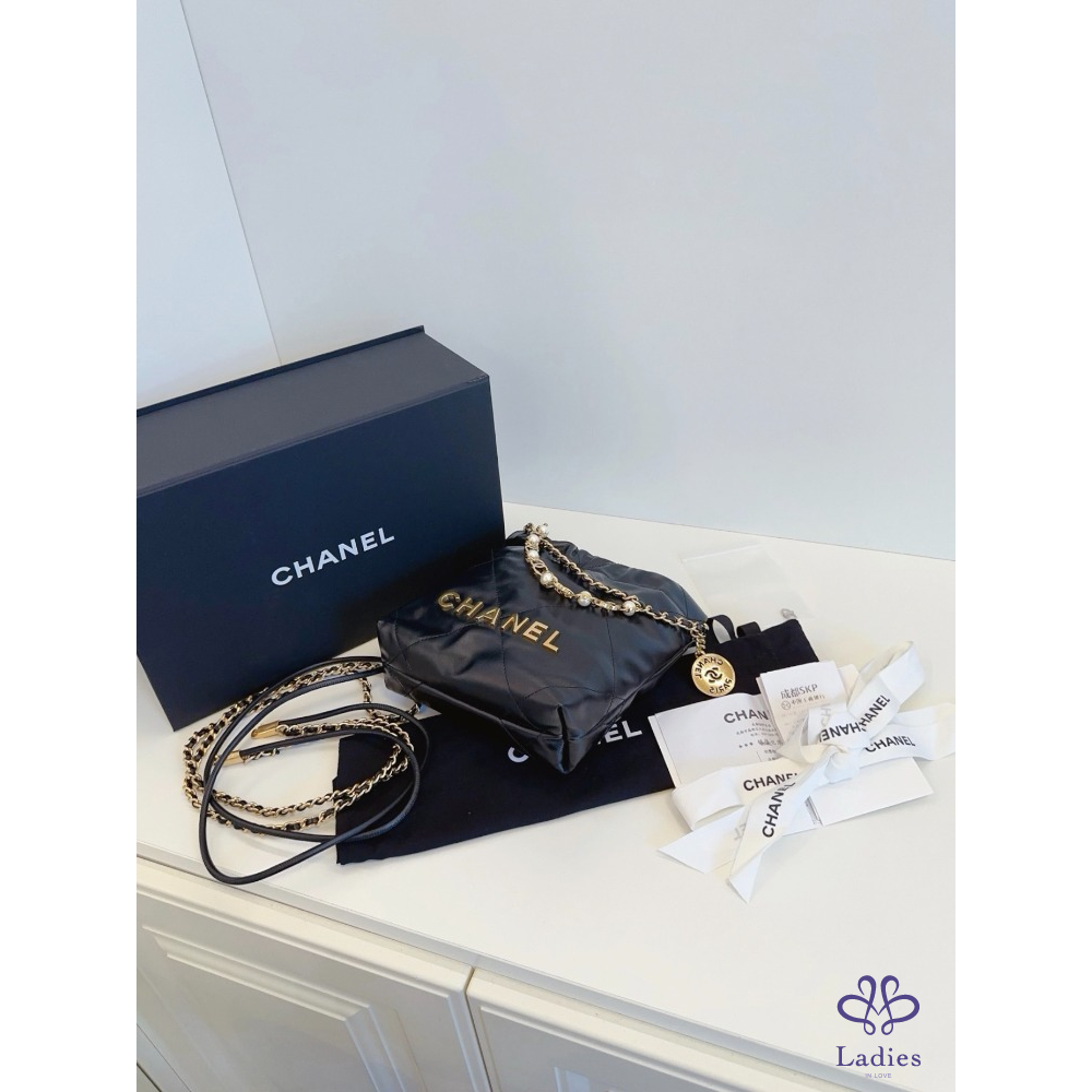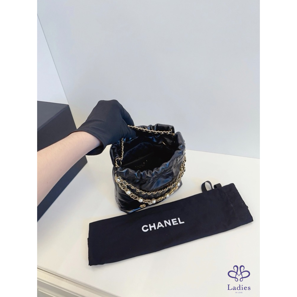 CHANEL香奈兒 24a 限量特別款⭐️黑金 mini Bag 珍珠鏈迷你垃圾袋 牛皮晶片款 全新新款