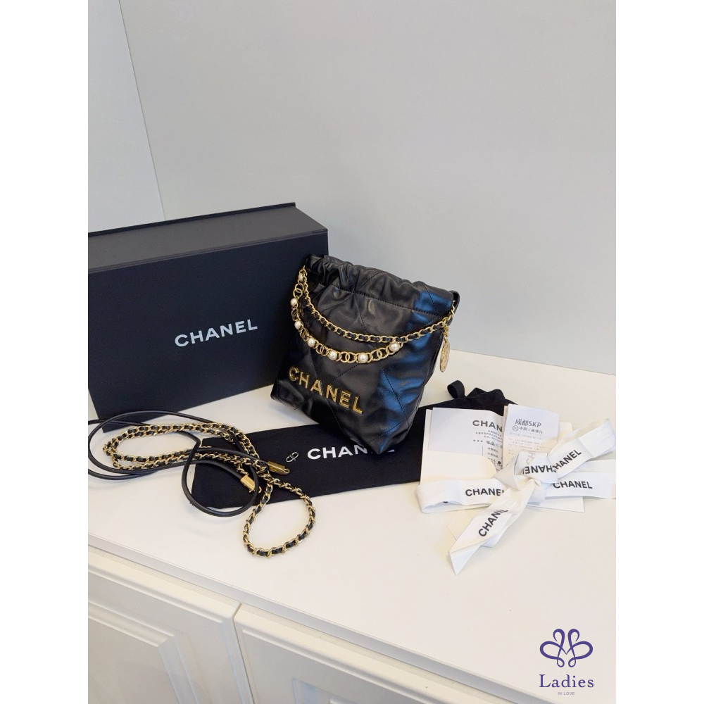 首頁 精品包包 CHANEL香奈兒 24a 限量特別款⭐️黑金 mini Bag 珍珠鏈迷你垃圾袋 牛皮晶片款 全新新款