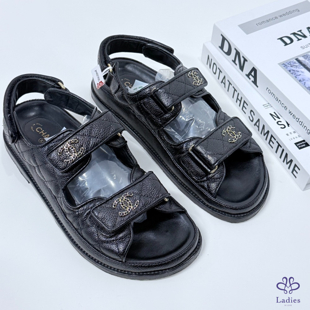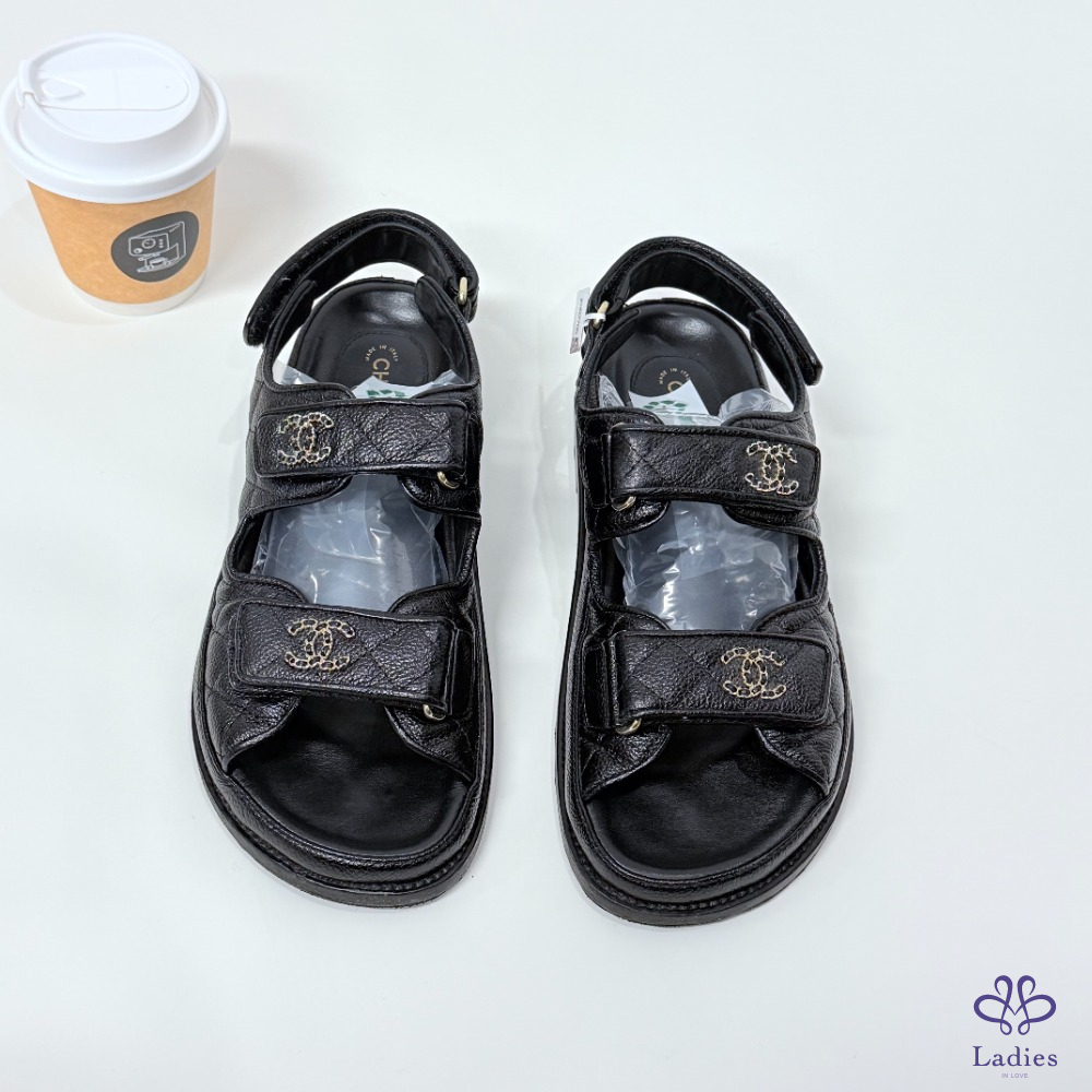 首頁 精品女鞋 CHANEL香奈兒 黑金魔術貼涼鞋 37.5碼 如圖描述 02705