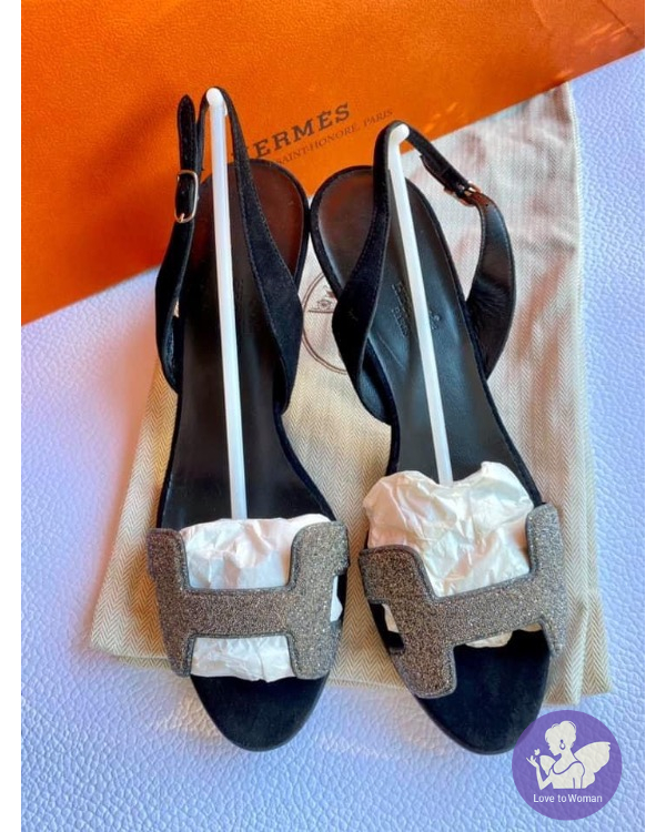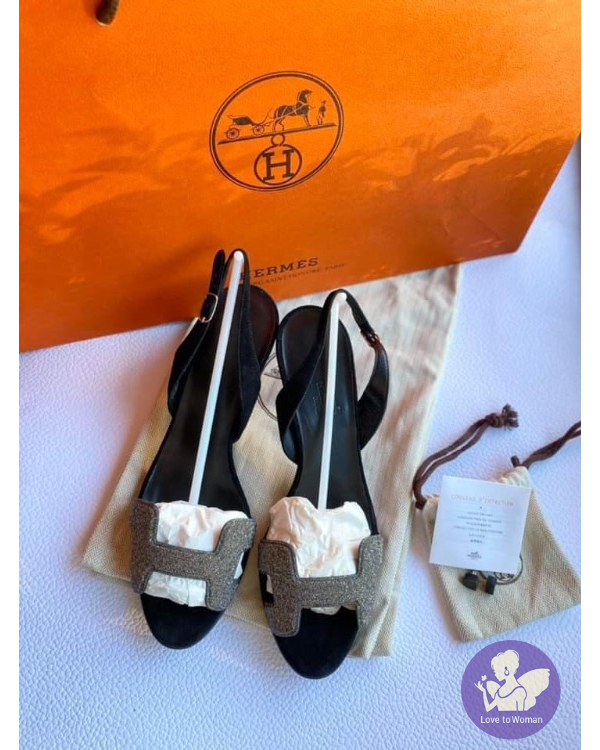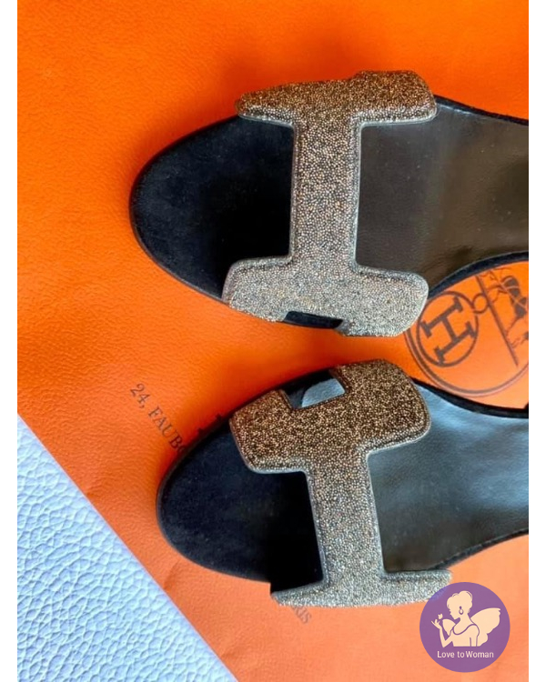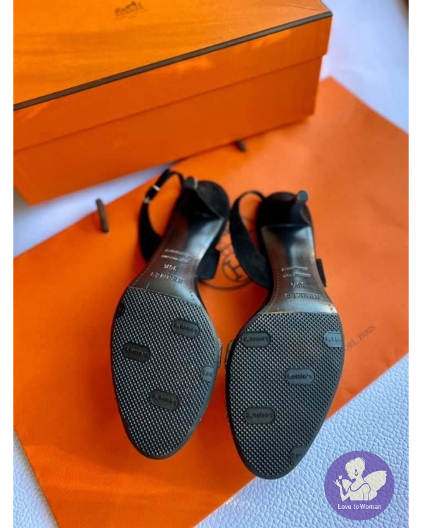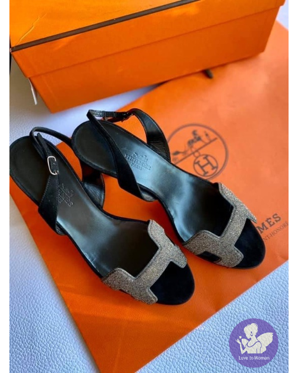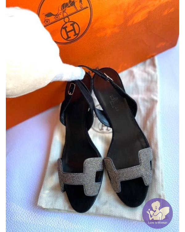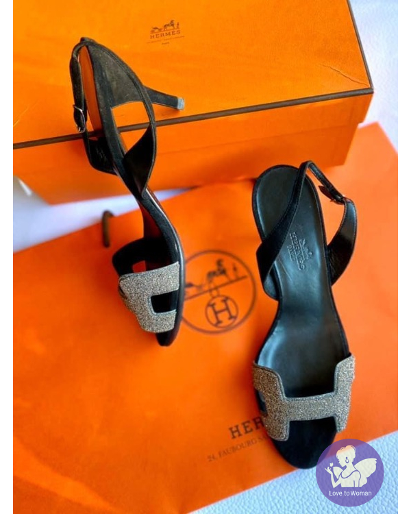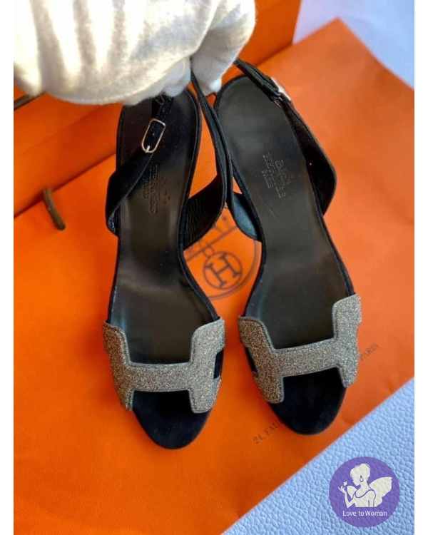 Hermes 經典款H晶鑽Logo黑色高跟涼鞋
