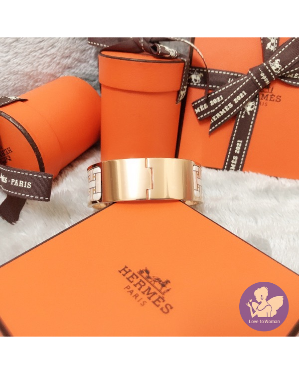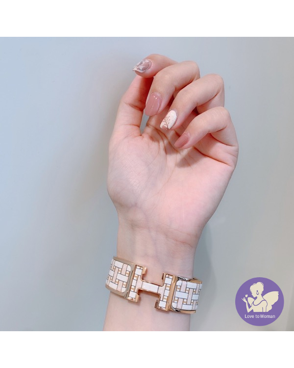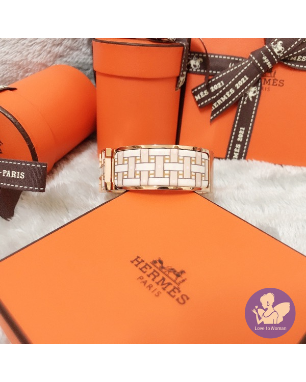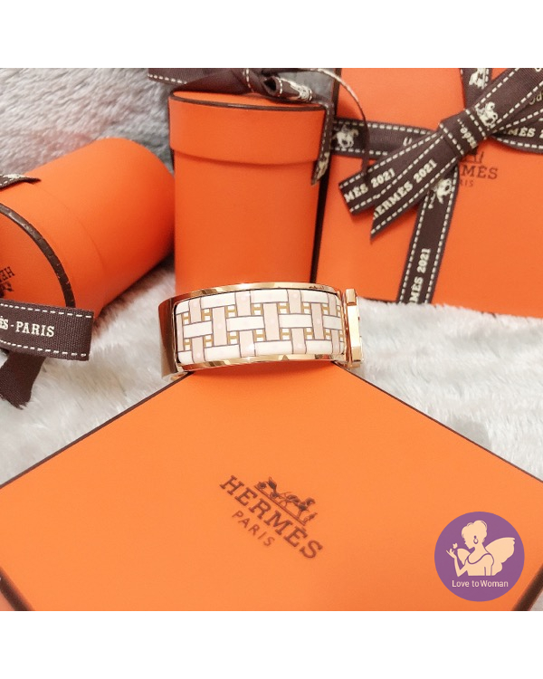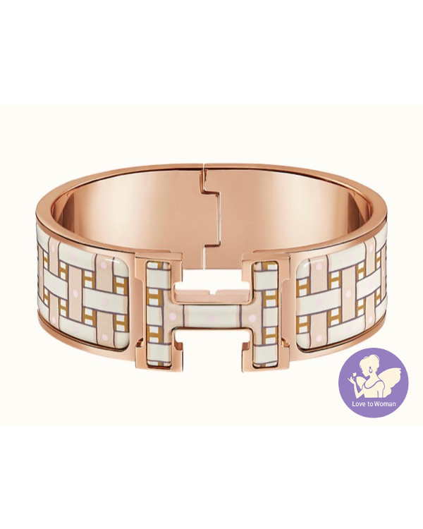 首頁 精品手錶 ​Hermès 愛馬仕 經典款 2021新款 Clic Clac H Son du H bracelet 編織感 寬版 H琺瑯 玫瑰金Sablé Soie手環 尺寸PM 全新✨