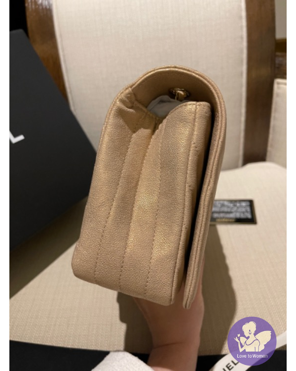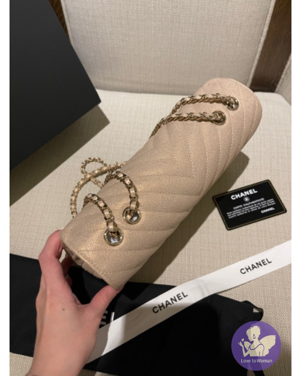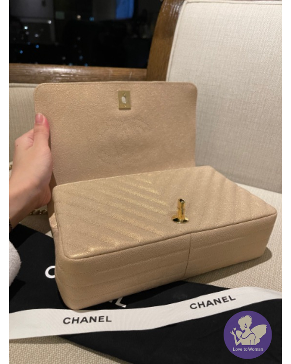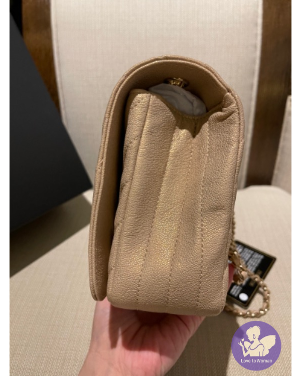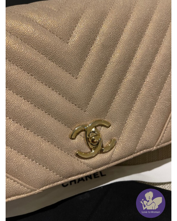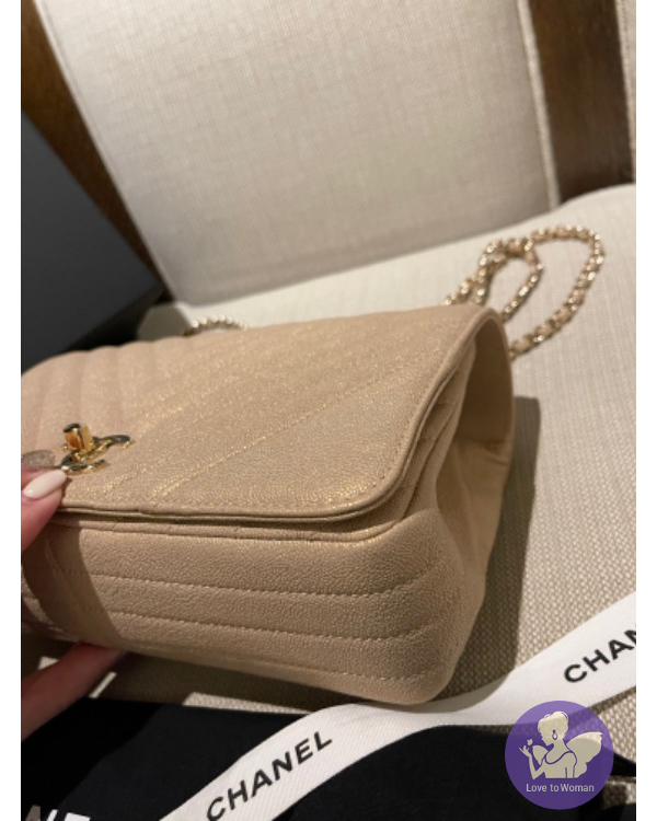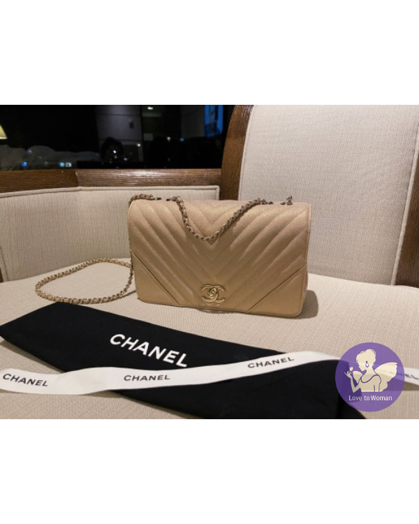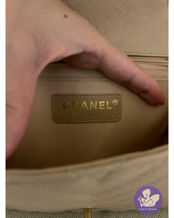 CHANEL 珠光口蓋包 (香檳米色)荔枝牛皮淡金
