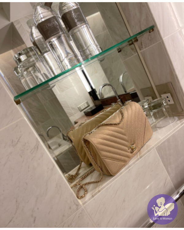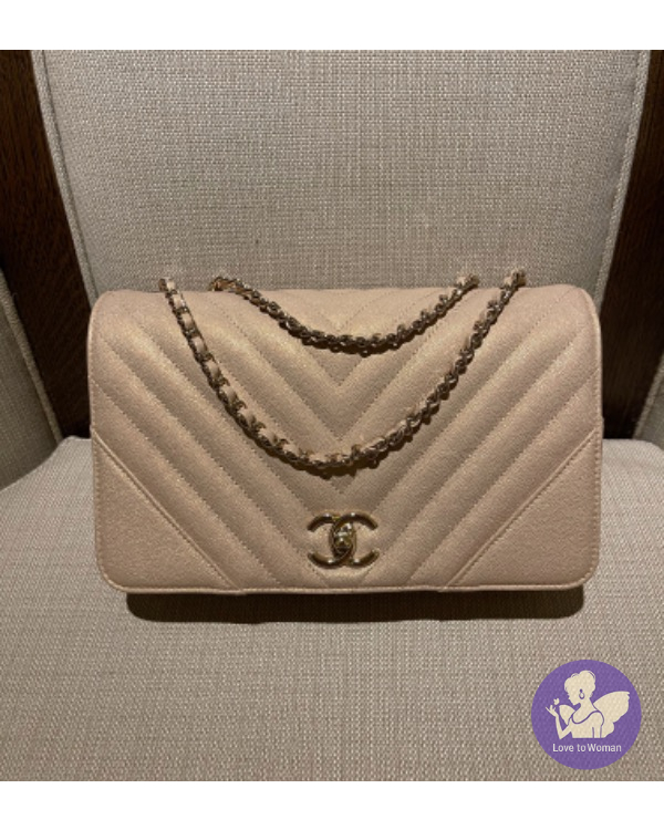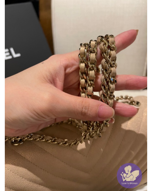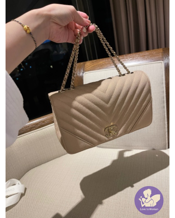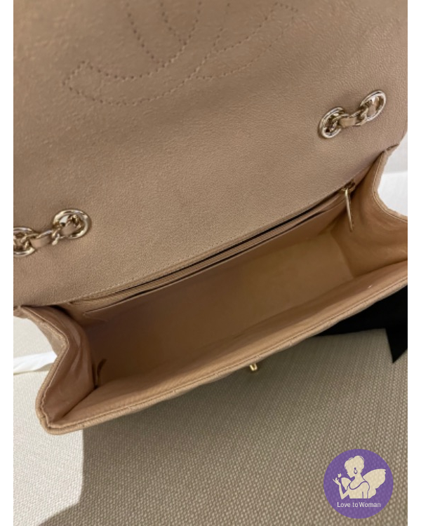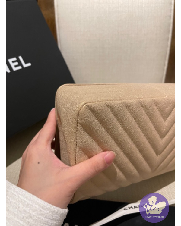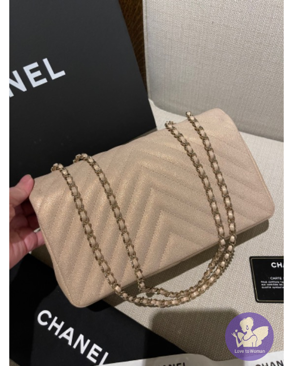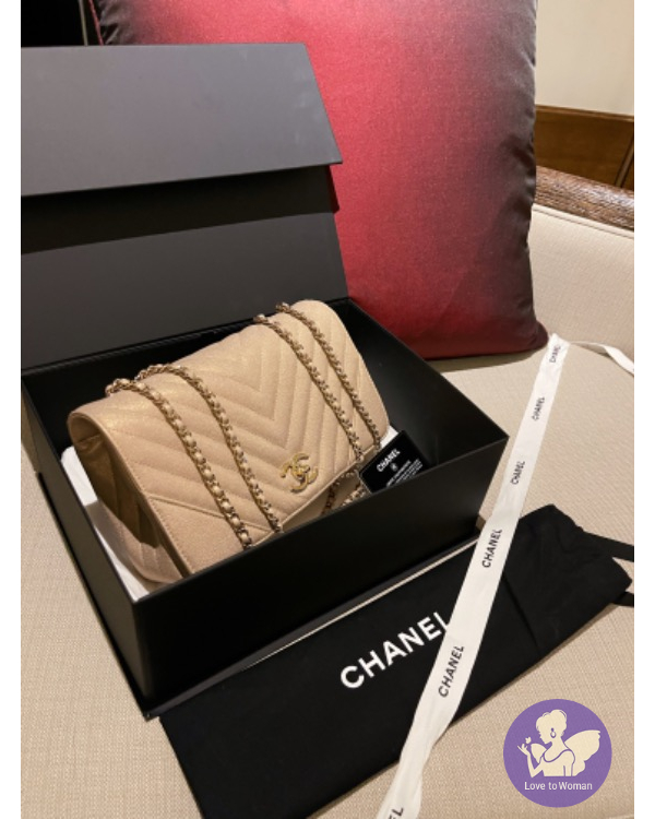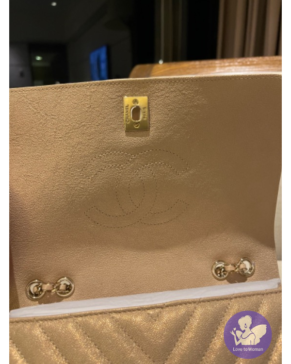 CHANEL 珠光口蓋包 (香檳米色)荔枝牛皮淡金