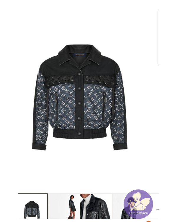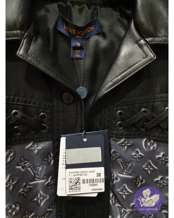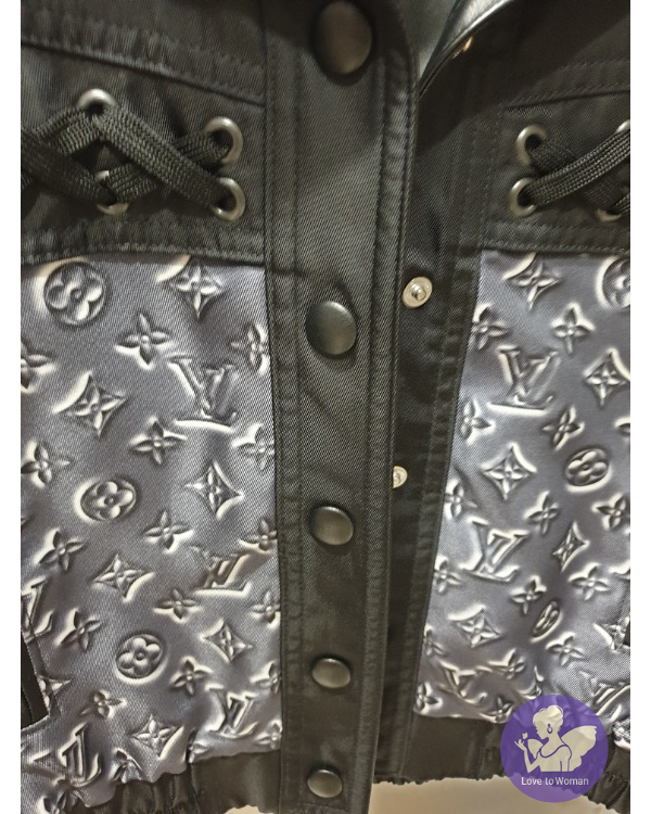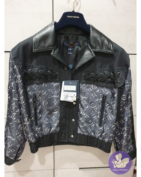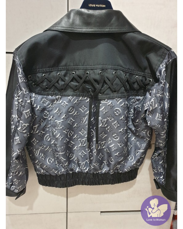 這套短身外套以對比材質為設計特色, 綴滿Monogram Shadow印花圖案, 結合黑色小羊皮細節。