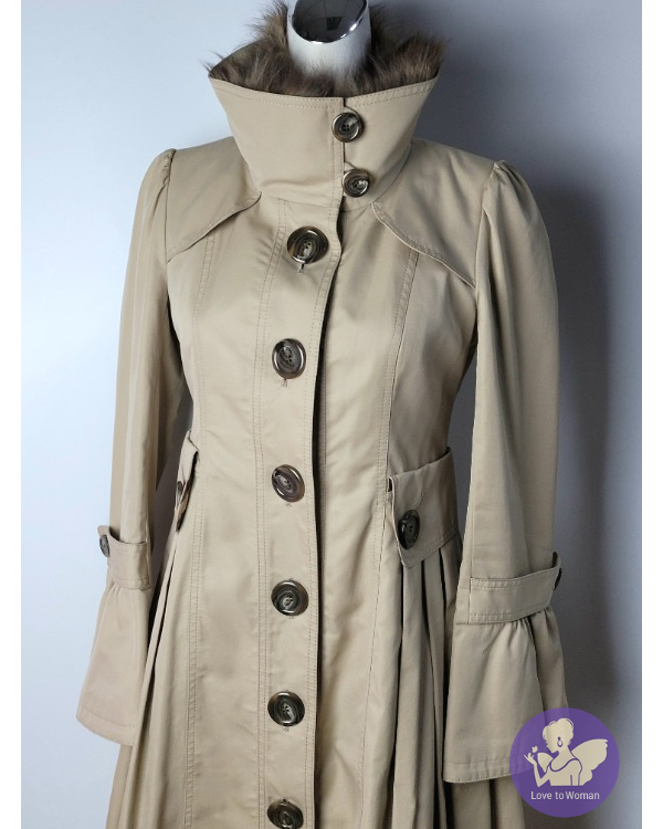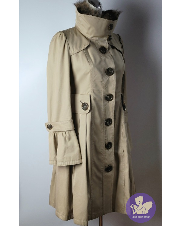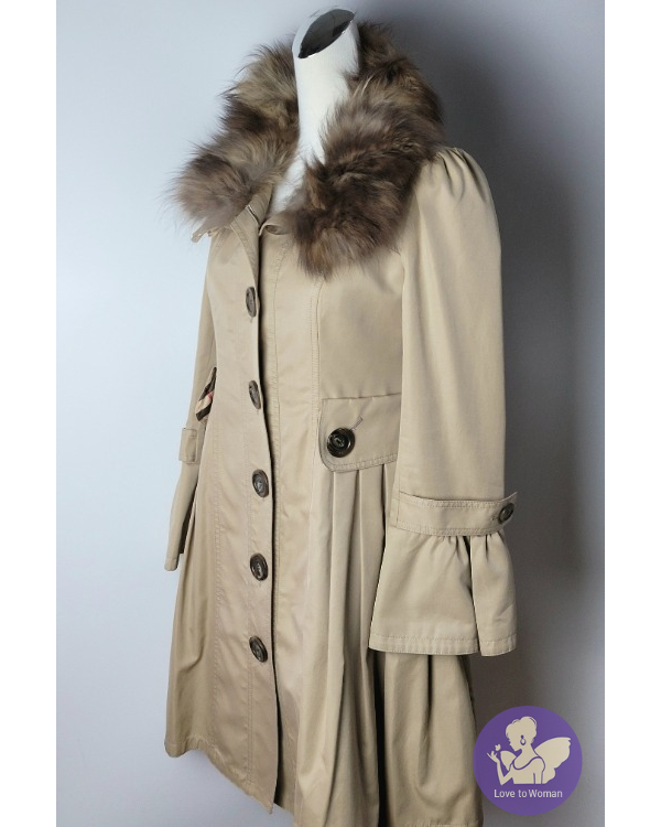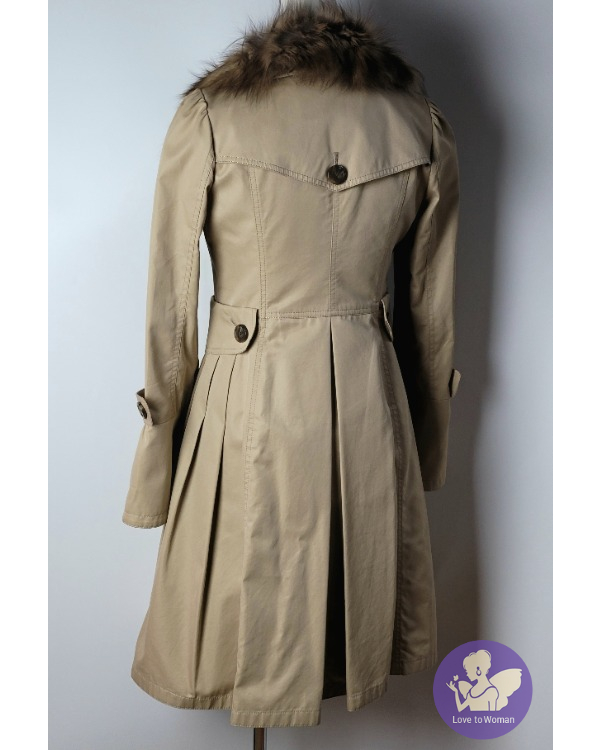 產品信息 ****寵愛賣家認證A000071 預售價售價15000 ~BURBERRY 皮草領(可拆)長袖袖口腰下拉褶外套~S~M號 原購價約50000.領子防風設計.側邊拉摺設計顯瘦 尺寸:肩寬38cm 袖長56cm 胸圍92cm 衣長92cm 很美.輕微接觸痕.介意請勿下標(實物拍照請見各圖) 得標者請二日內匯款完成.含運 售出不退