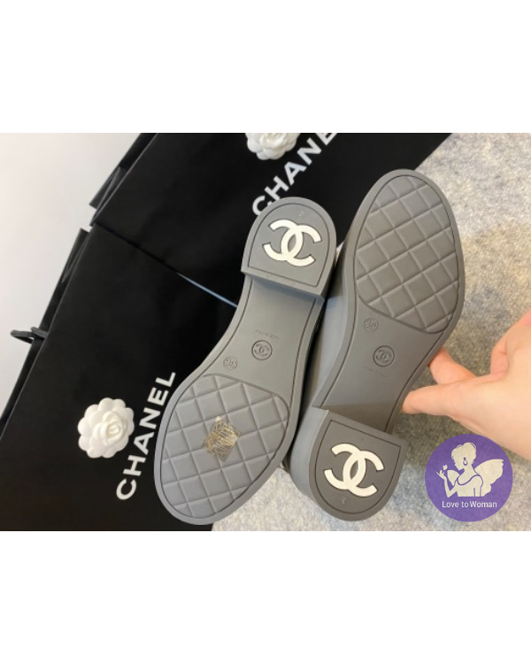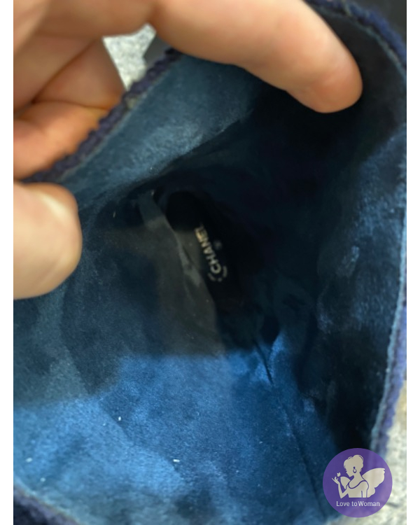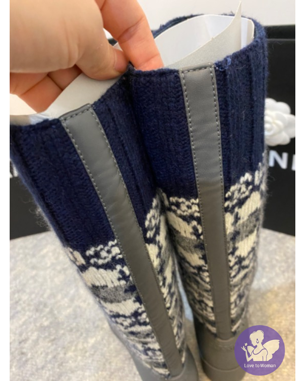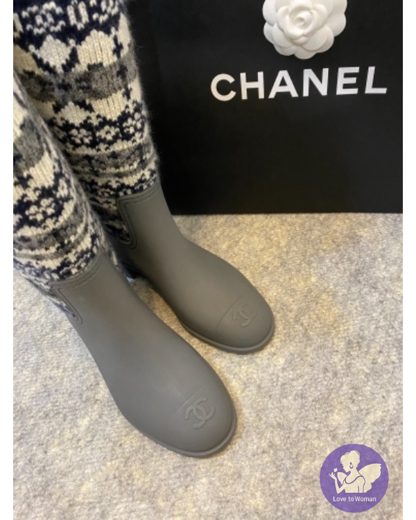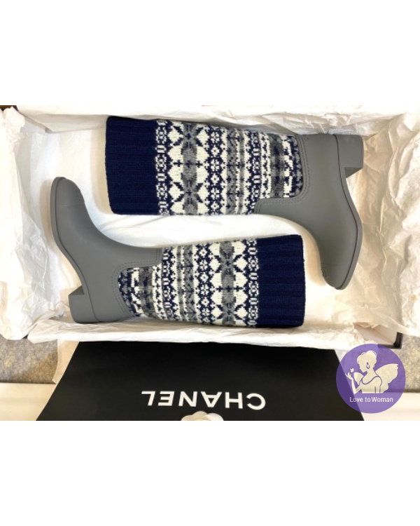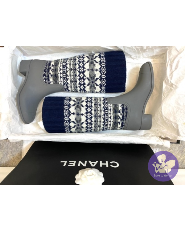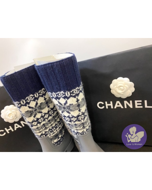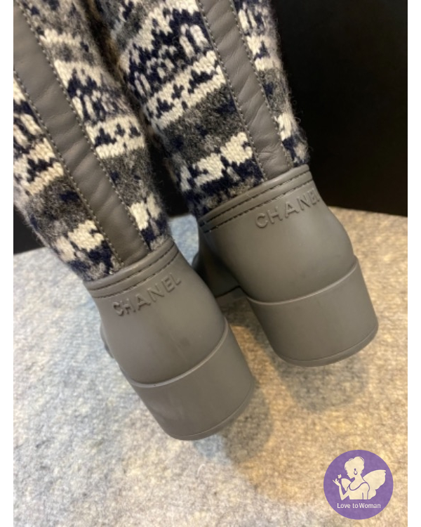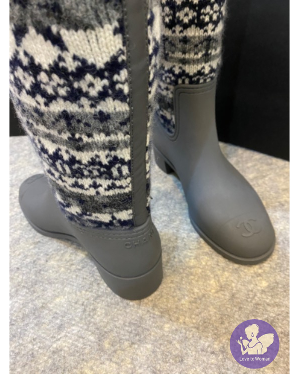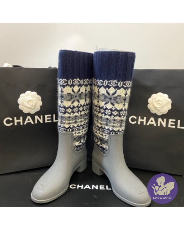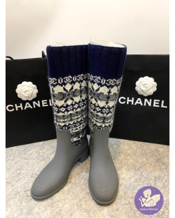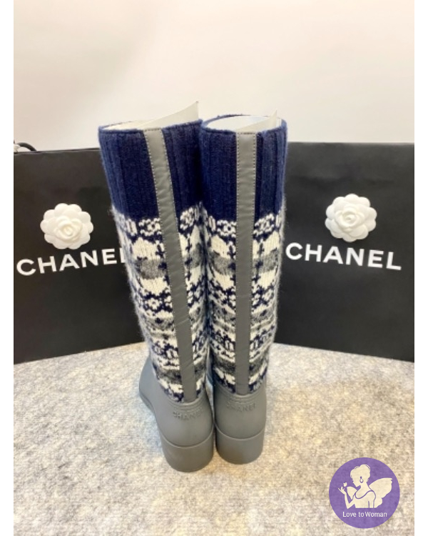 CHANEL 藍色毛呢灰色高筒雨靴 全新
