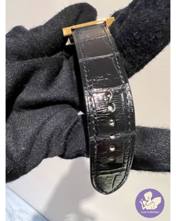 鍍玫瑰金不銹鋼腕錶,白色天然珍珠母貝鑲鑽錶盤 黑色光面鳄鱼皮可替換錶帶 附盒 2021 台灣購證 原價14萬多