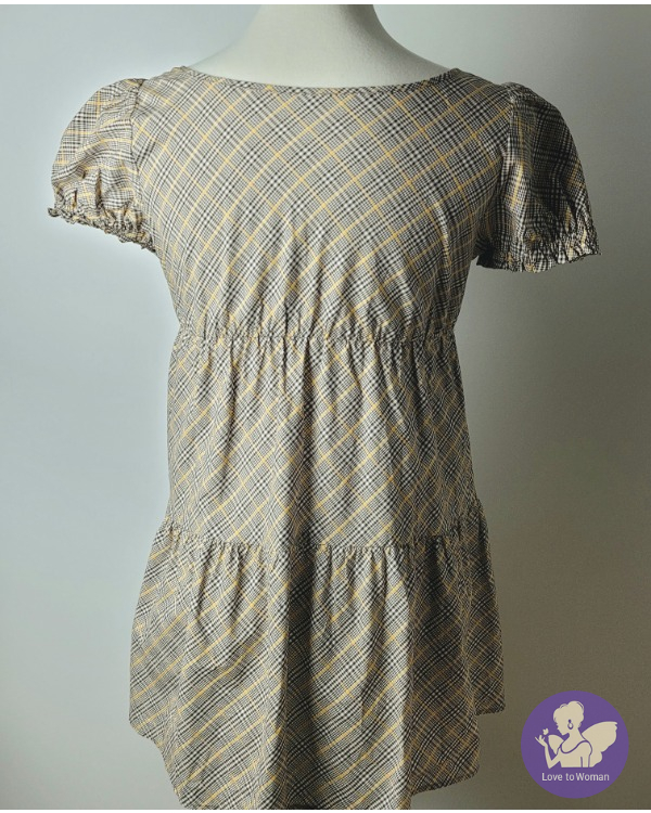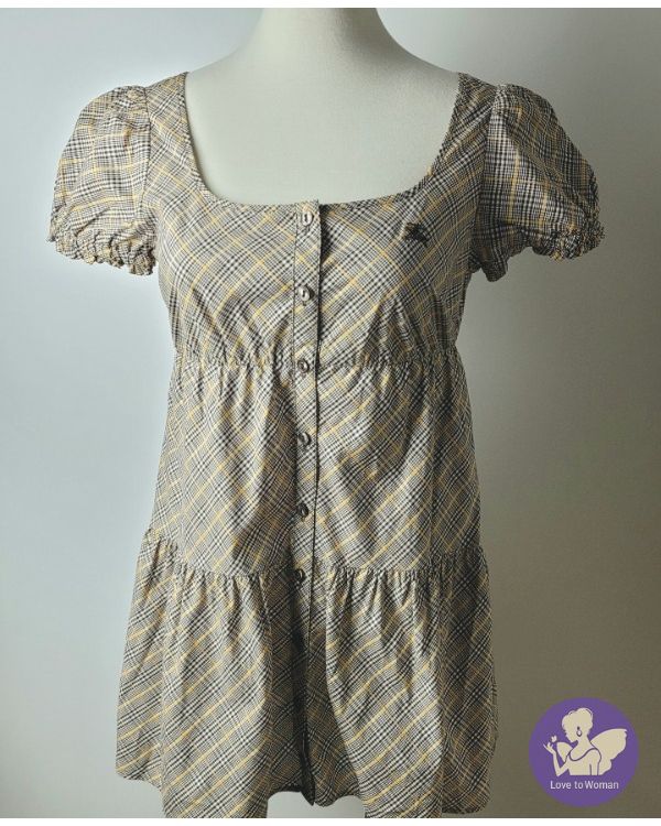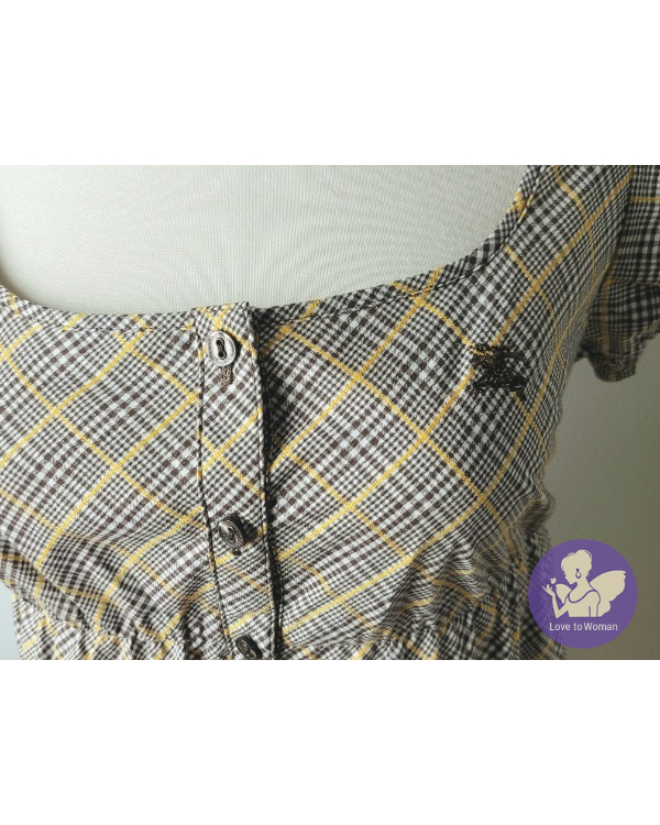 產品信息 ****A000071 售價2500 ~BURBERRY 未使用品 大圓領格紋短袖長款上衣(小洋裝)~36號 原購價8000.胸腺特別設計.穿起來線條很美.扣子logo品牌字體 尺寸:肩寬36~38cm 胸圍88 衣長69cm 未使用品(實物拍照請見各圖) 裸件.出貨會包好 得標者請二日內匯款完成.含運 售出不退