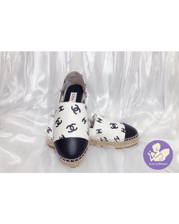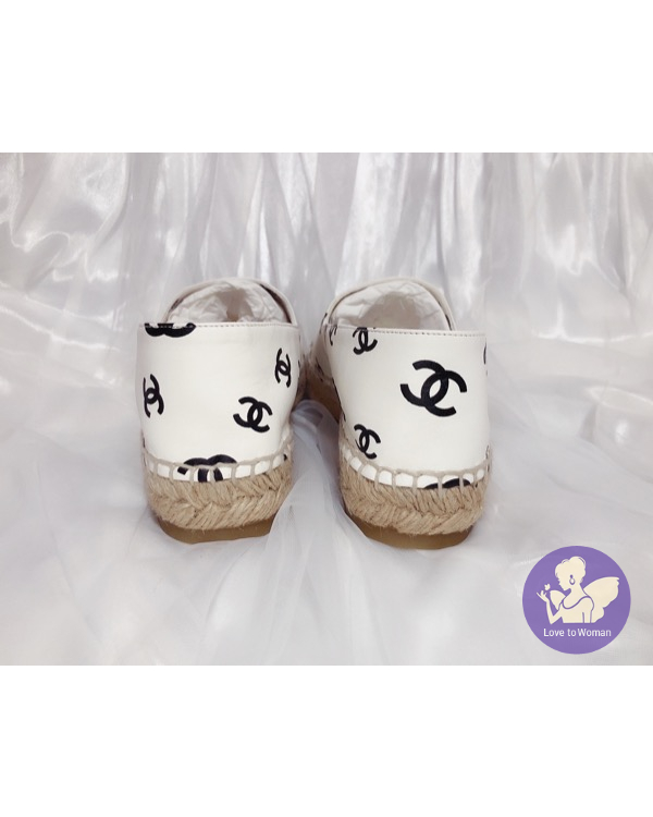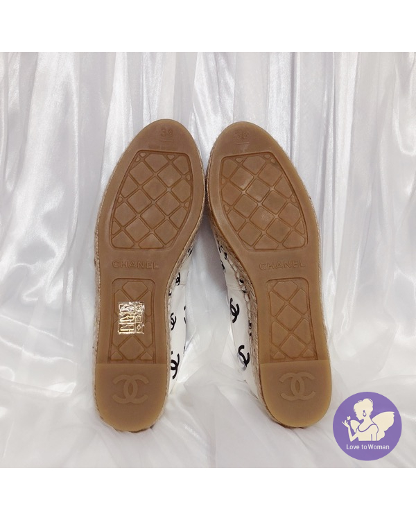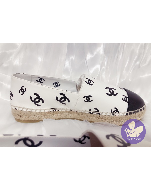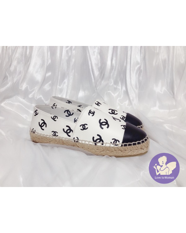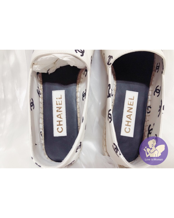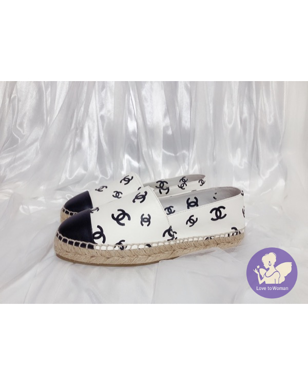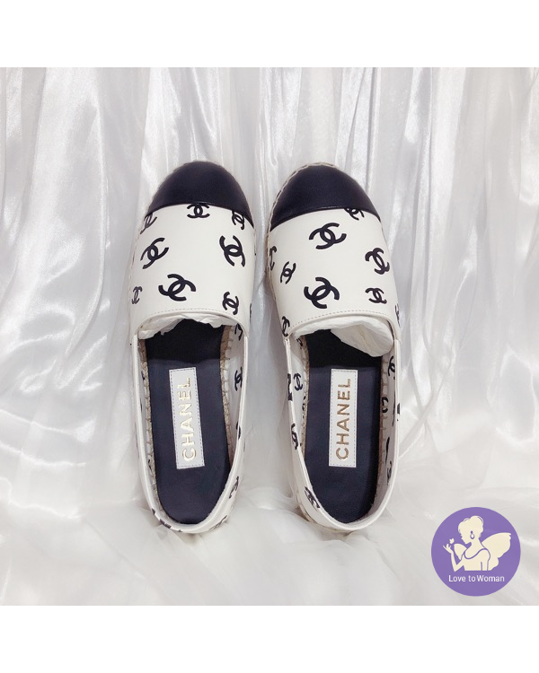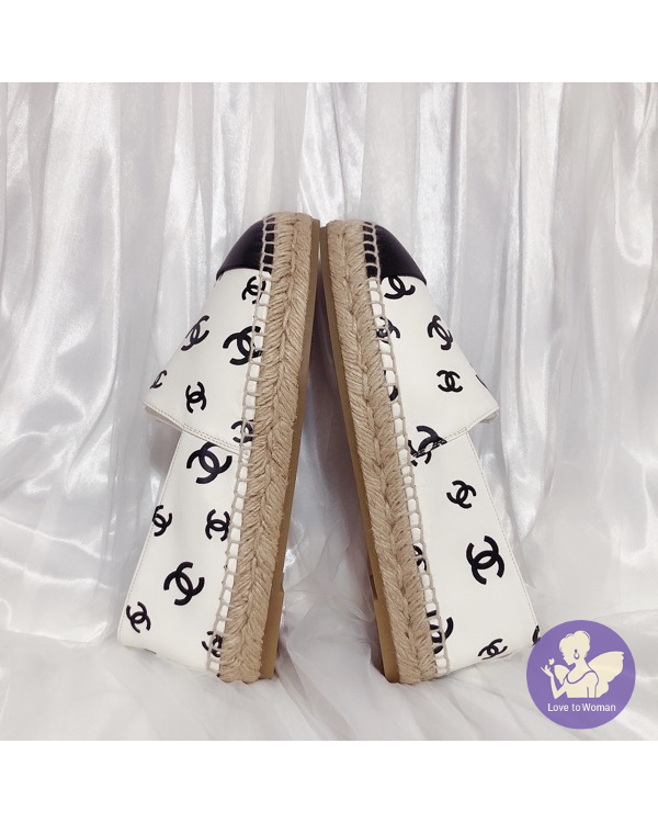 首頁 精品女鞋 ​CHANEL 香奈兒 小香 22C 滿版白底黑logo 全皮革 草編 漁夫鞋 鉛筆鞋 38號 全新✨