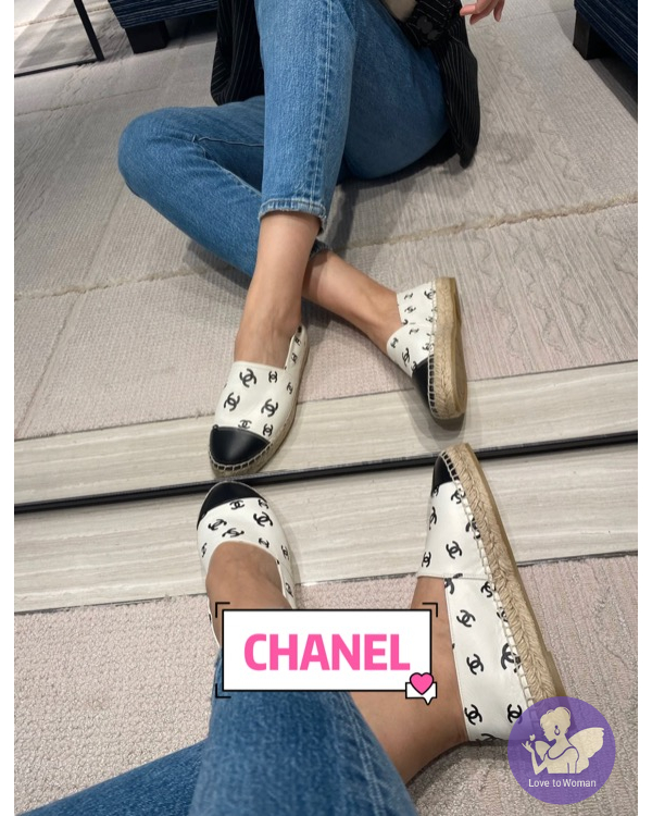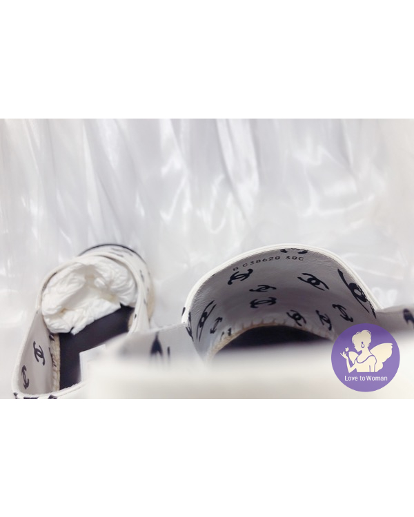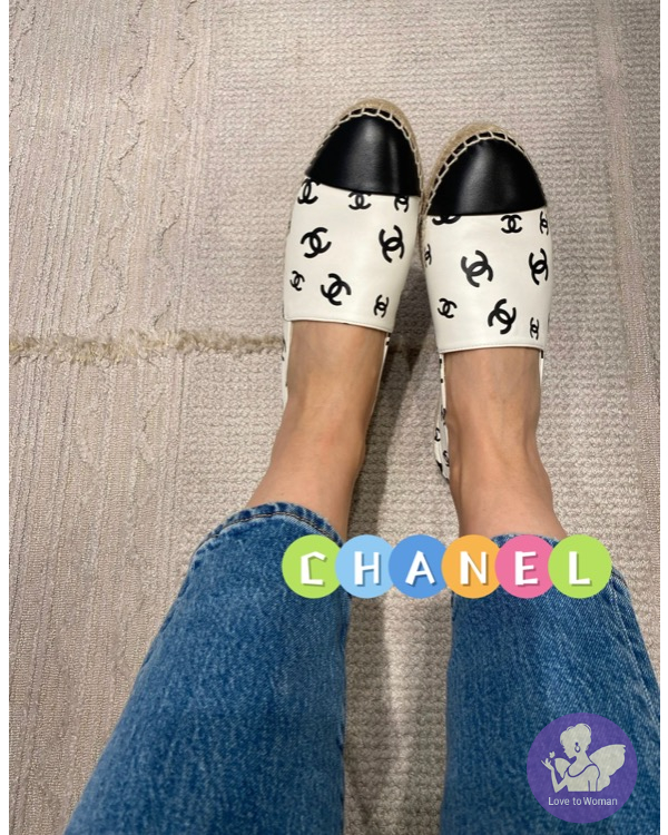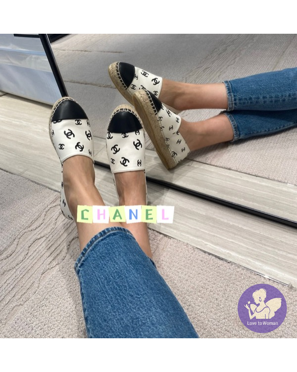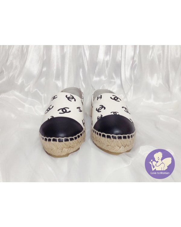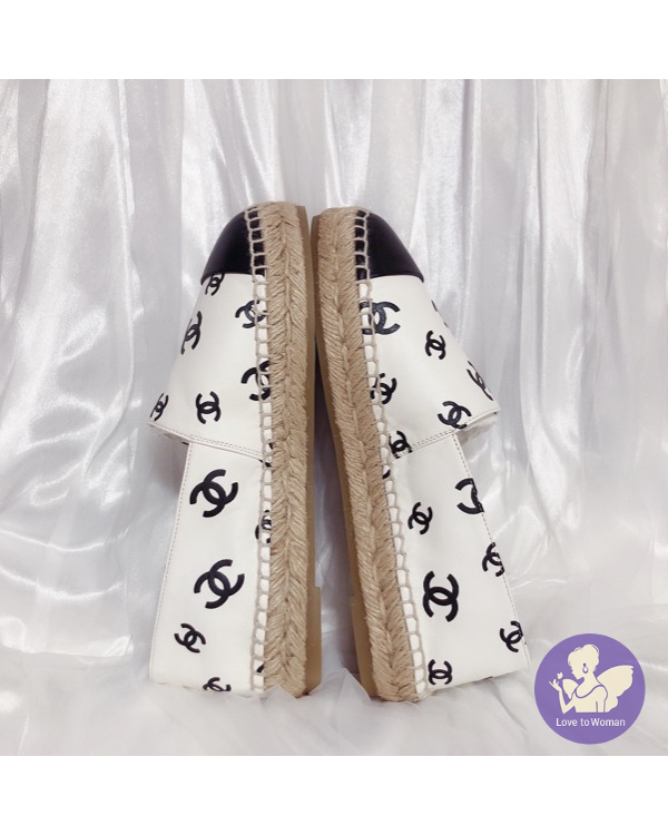 ​CHANEL 香奈兒 小香 22C 滿版白底黑logo 全皮革 草編 漁夫鞋 鉛筆鞋 38號 全新✨