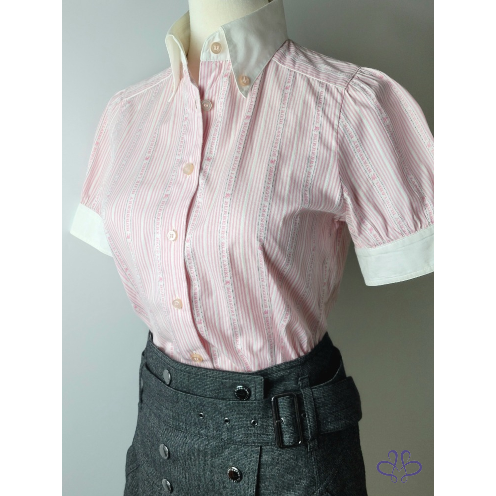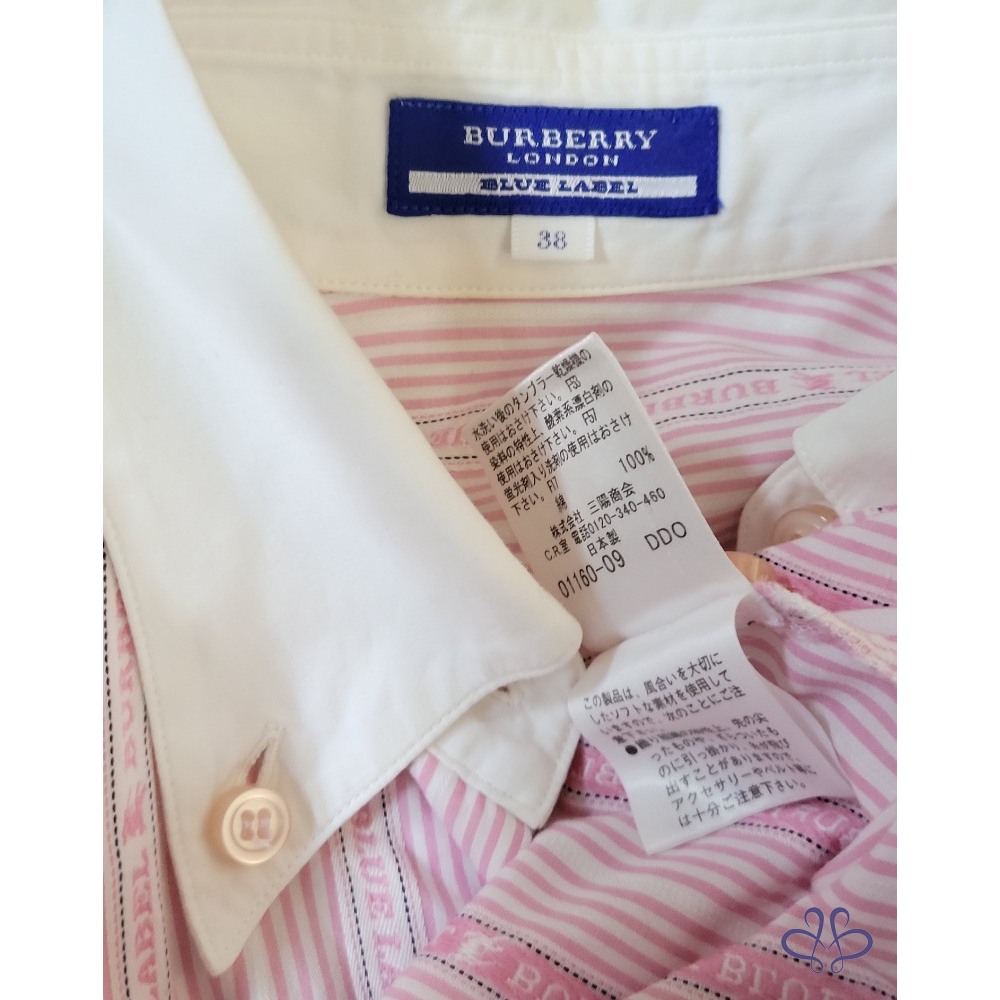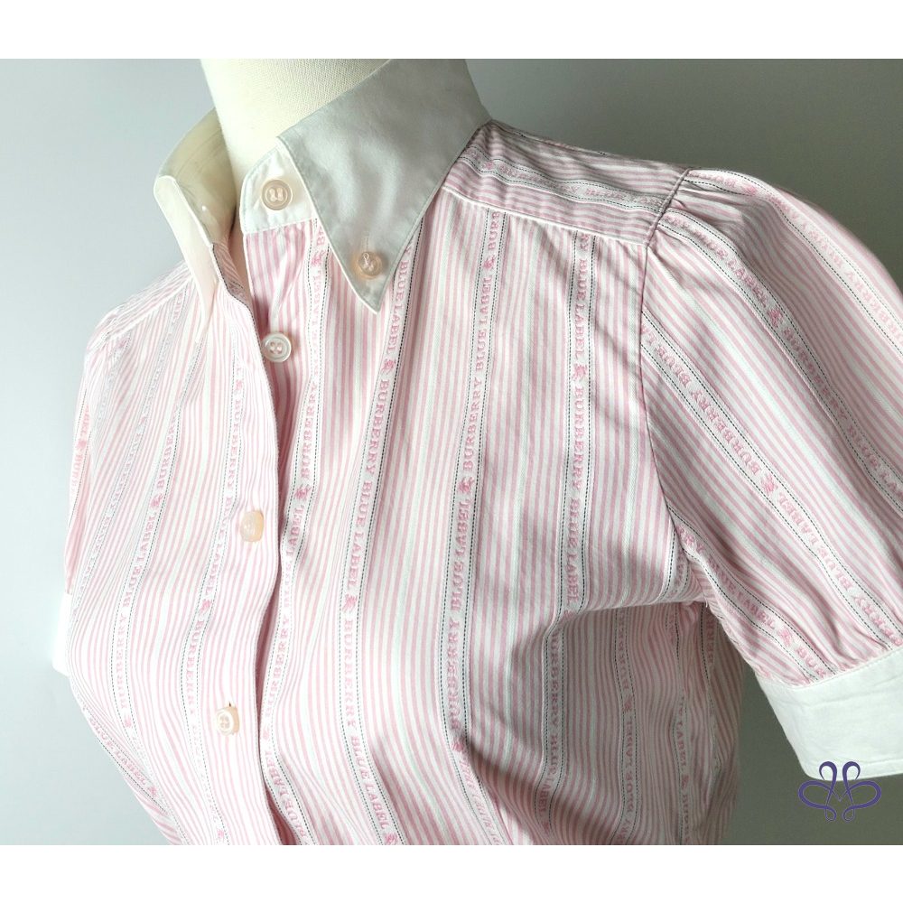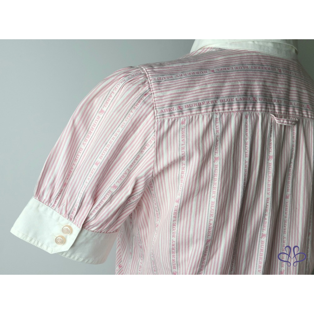 ~BURBERRY 短袖粉色品牌字體LOGO條紋白領上衣38號