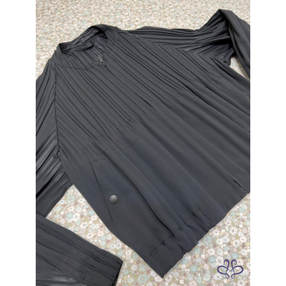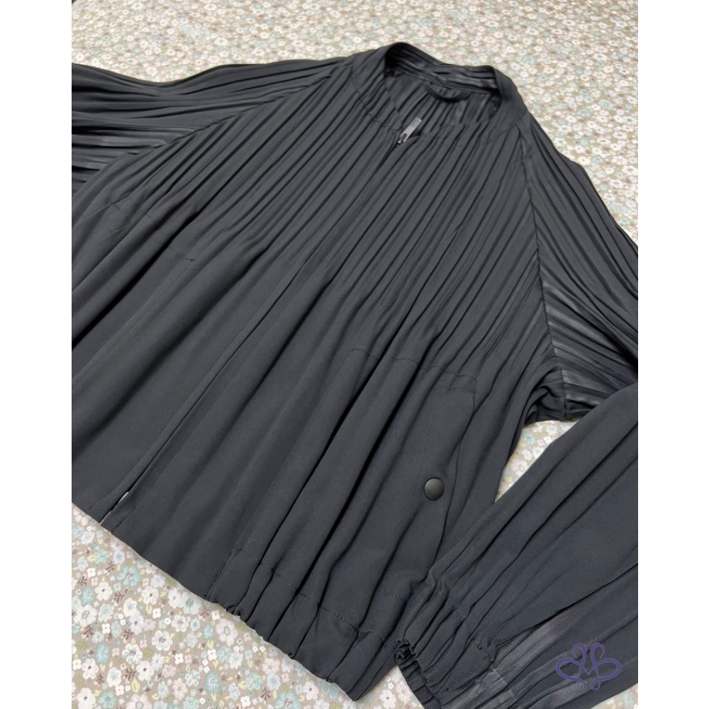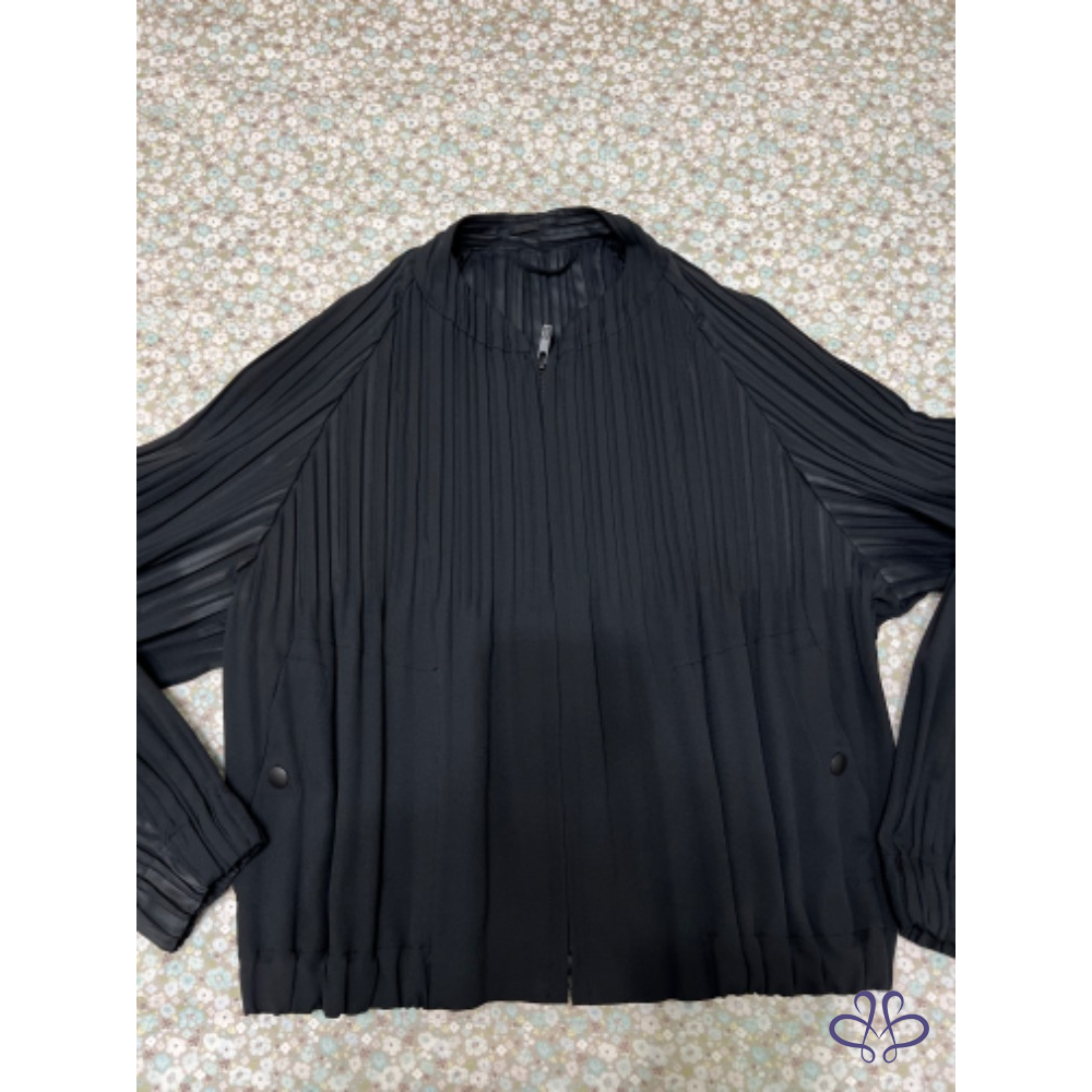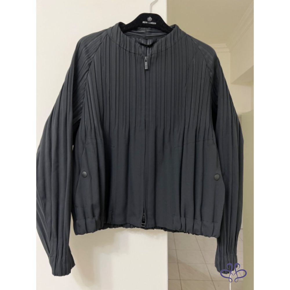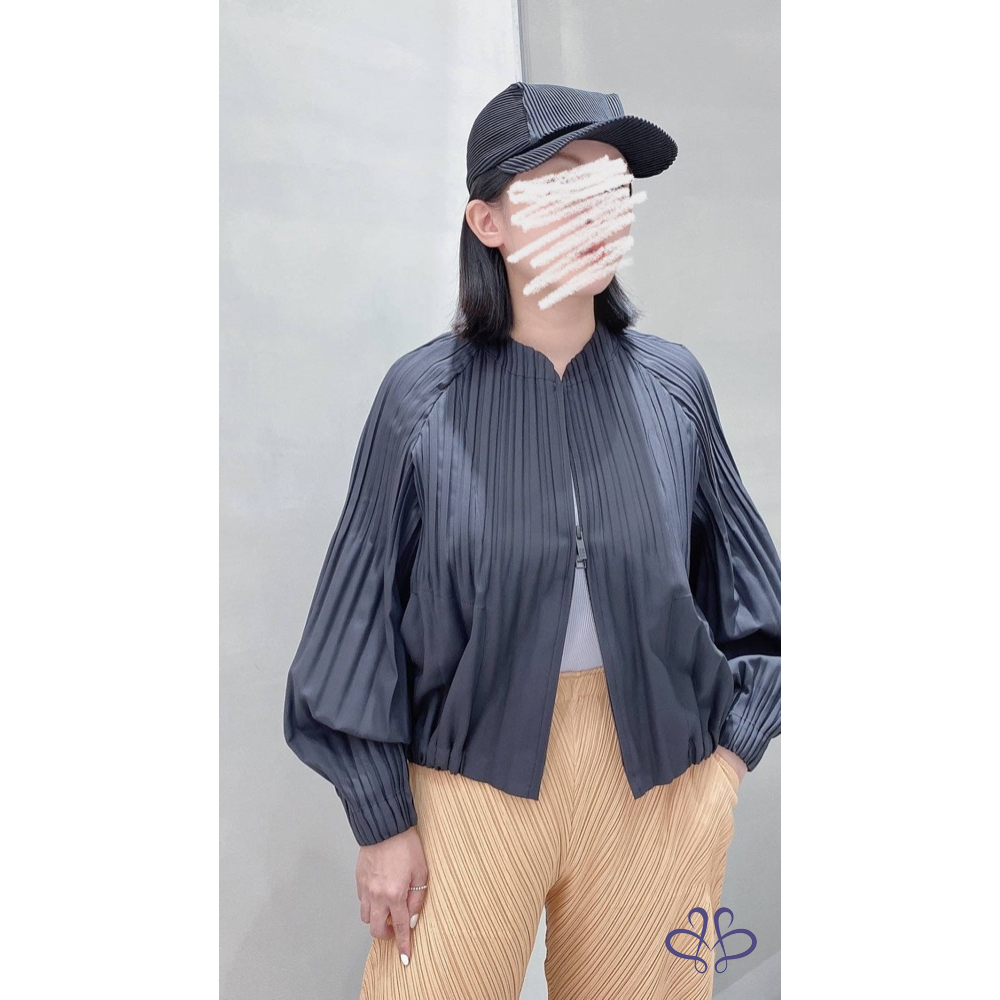 代家人售三宅一生Pleats Please黑色機能壓褶外套,9月中經典款,防風、防潑水的科技材質以及獨特泡泡袖,短板俐落活潑,