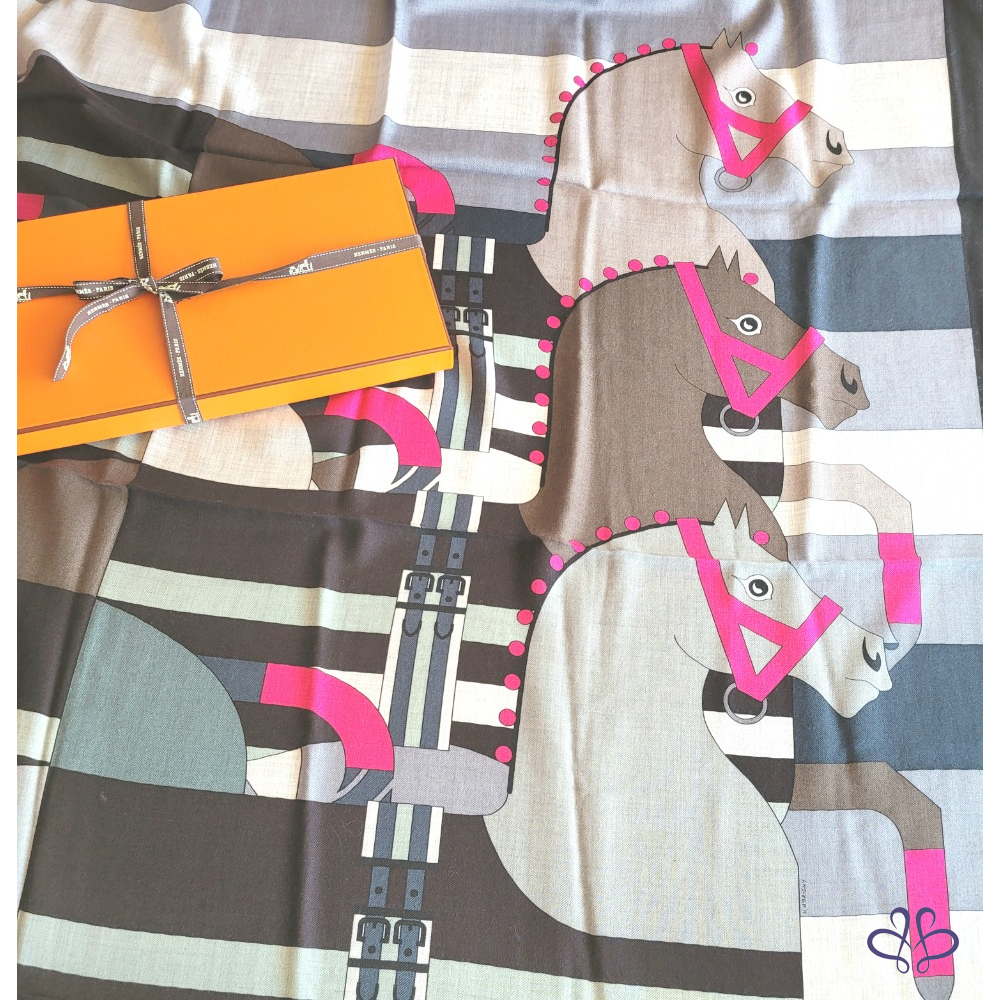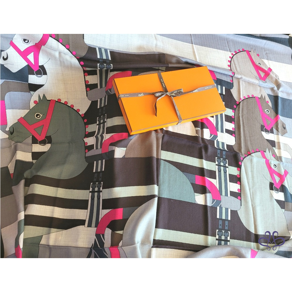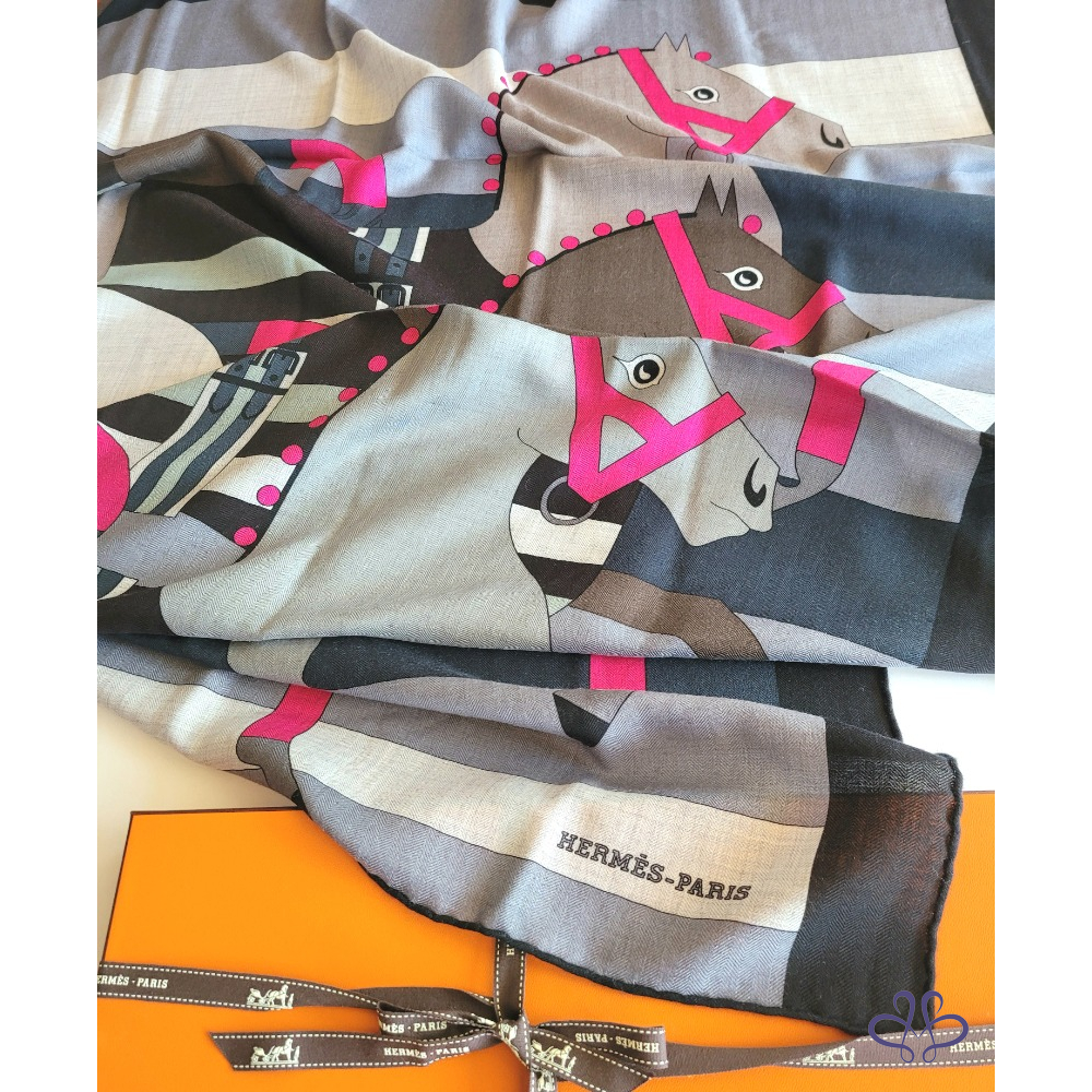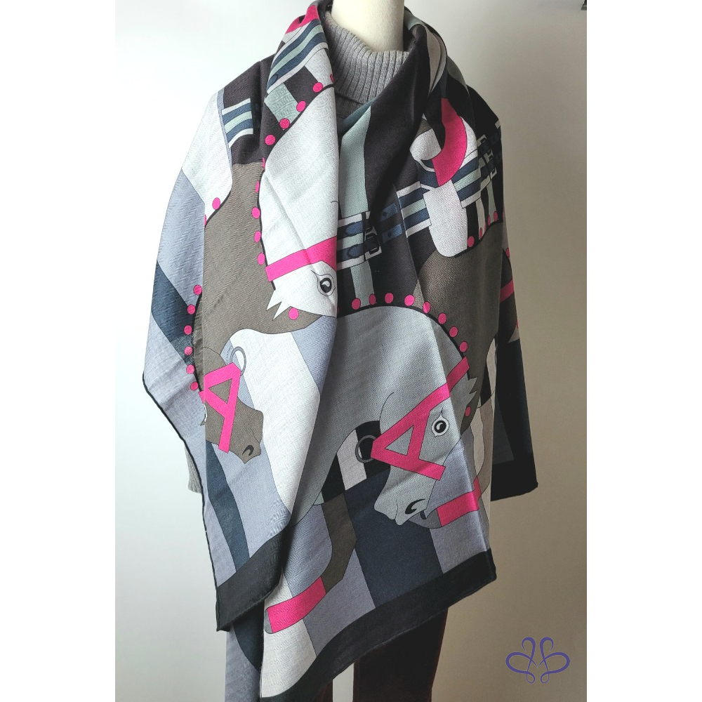 ~HERMES 附原廠盒 馬頭桃粉A字繩大圍巾 140x140cm 70% CASHMERE 30% SILK 大披肩/圍巾