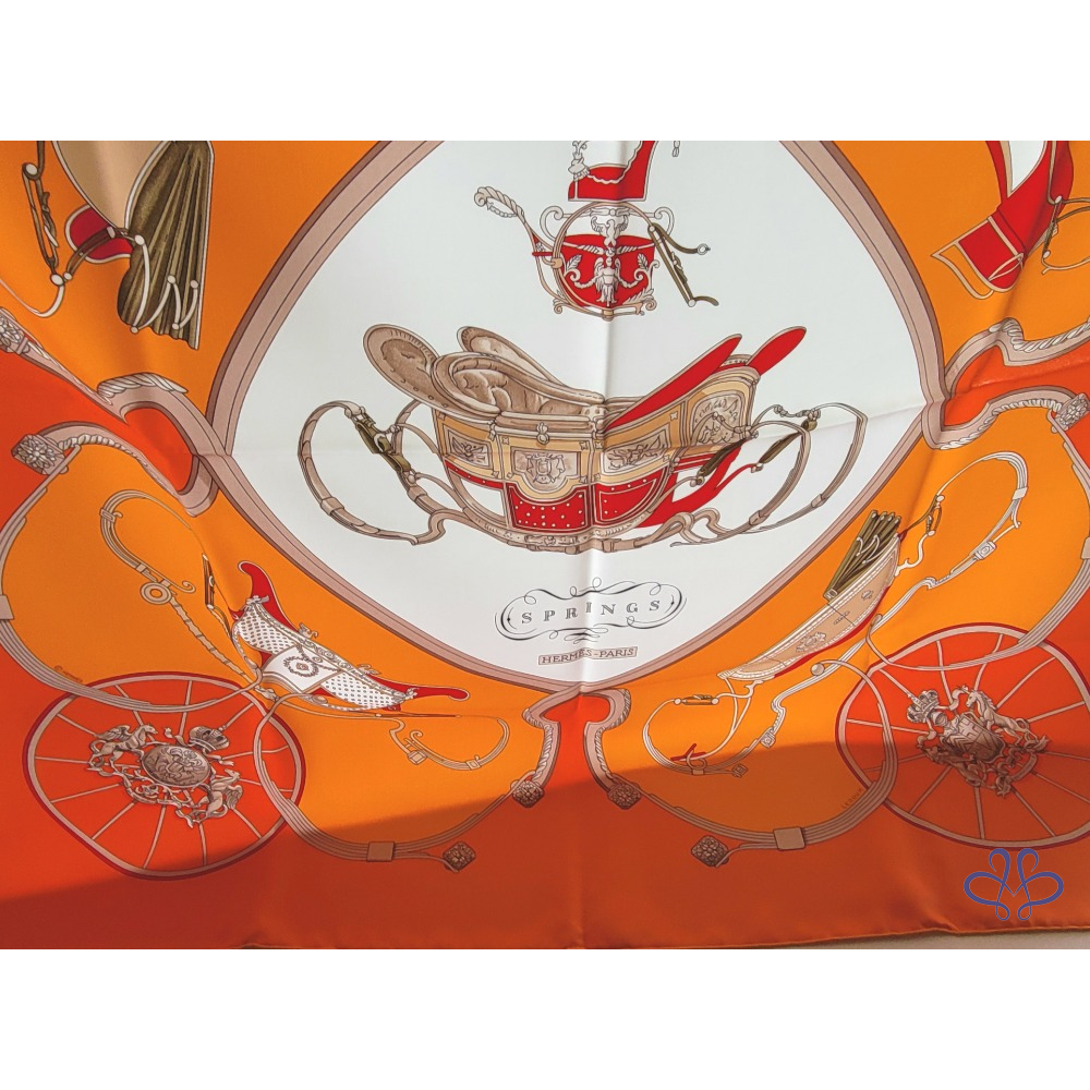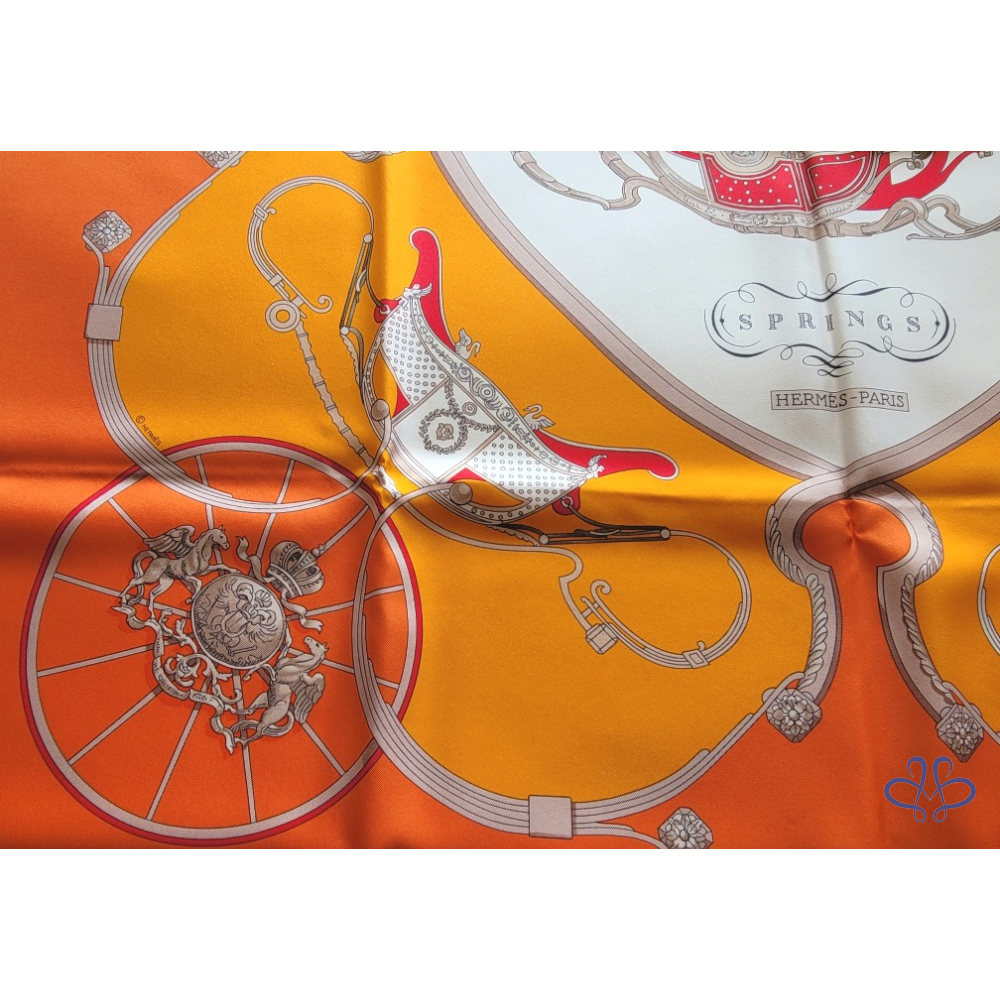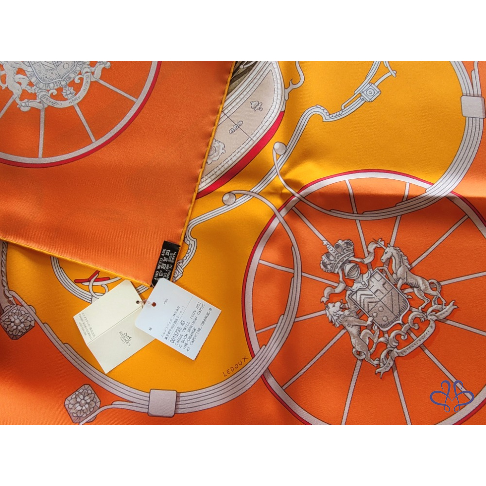 ~HERMES 全新(有吊牌) 橘色底古典彈簧車圖案絲巾
