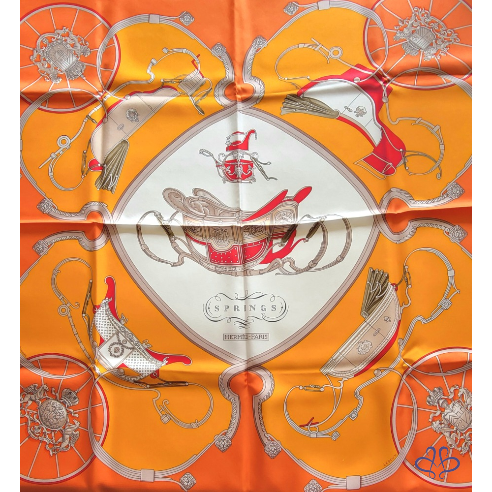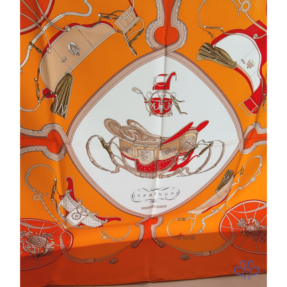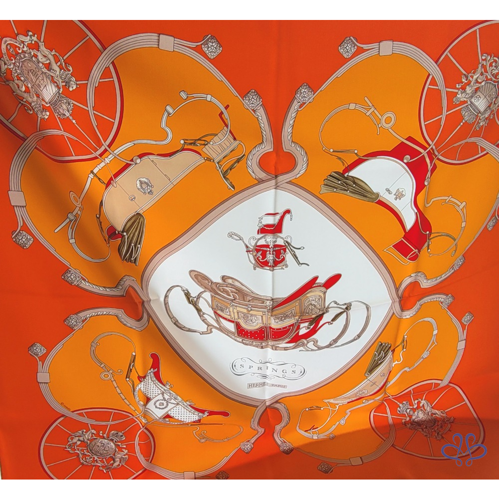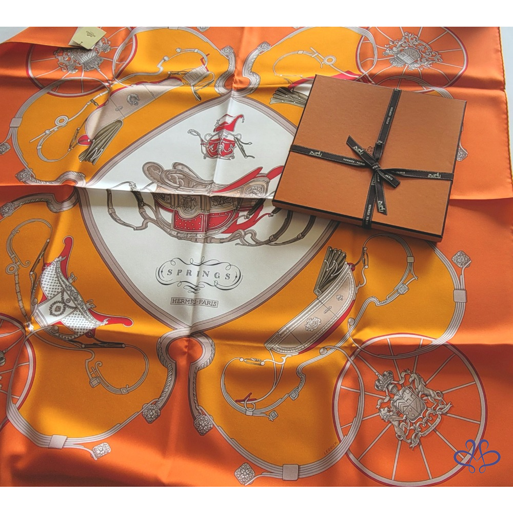 ~HERMES 全新(有吊牌) 橘色底古典彈簧車圖案絲巾