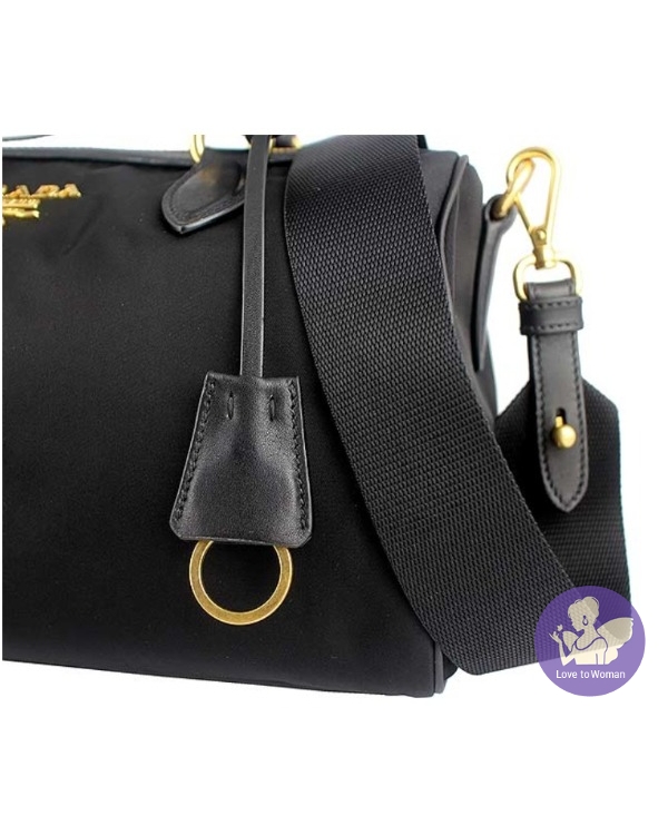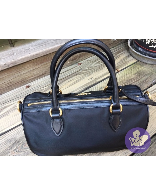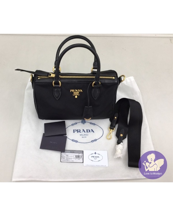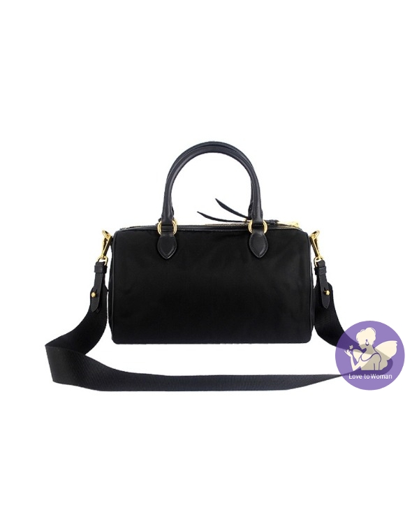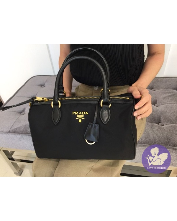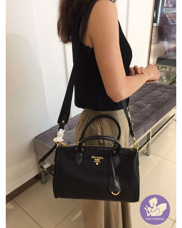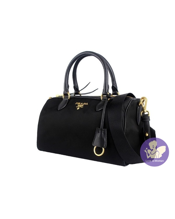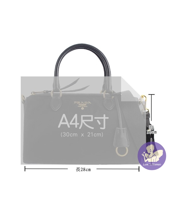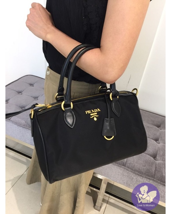 【商品名稱】PRADA浮雕LOGO金屬標誌可斜背尼龍布皮飾邊波士頓包二用包
