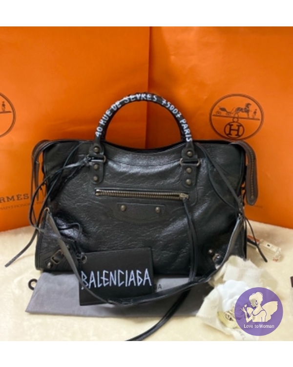 巴黎世家 限量 字母塗鴉款 機車包 City 黑色 小銅釦